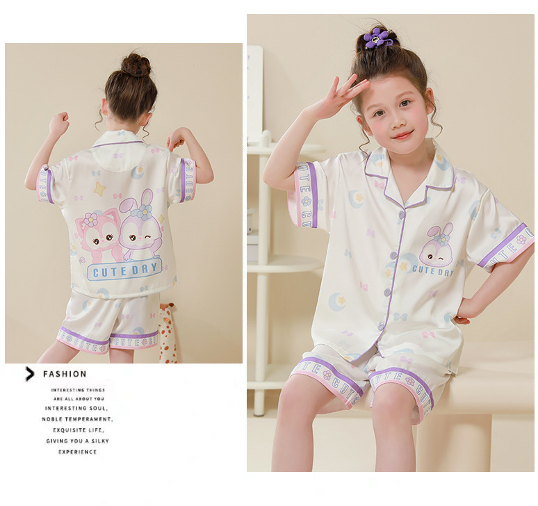어린이 집 옷 여름 아이스 실크 얇은 여자 반팔 세트 만화 에어컨 옷 큰 어린이와 어린 소녀를위한 잠옷