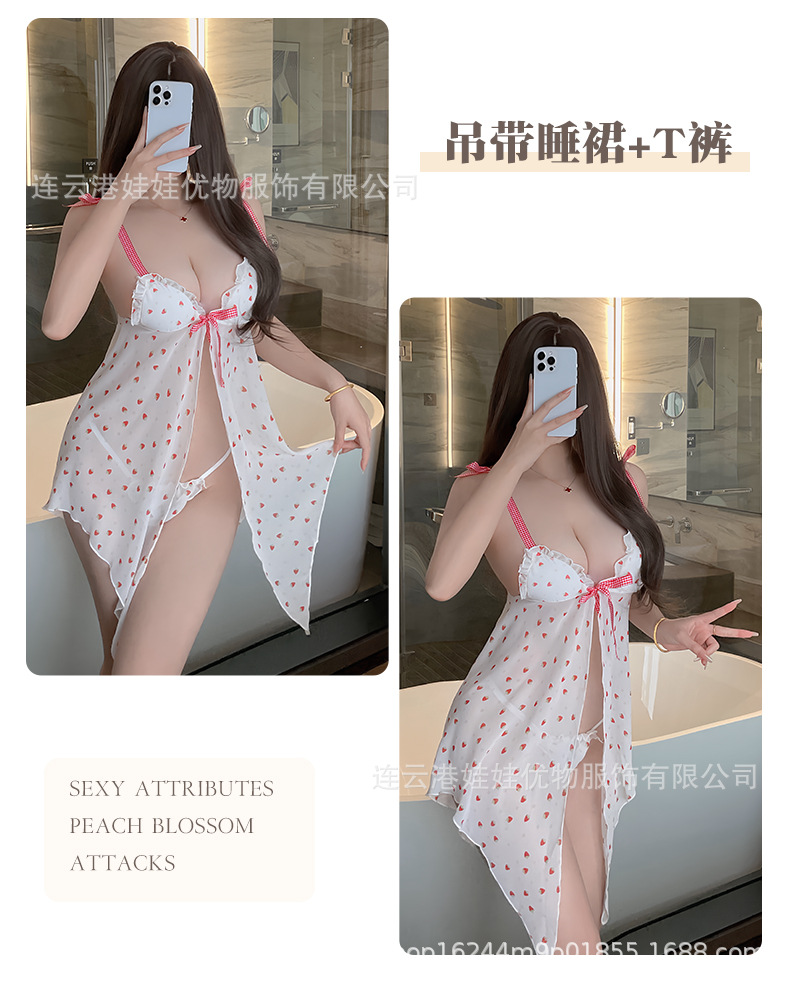 섹시한 란제리 일본 소녀의 섹시한 딸기 인쇄 시폰 슬링 백리스 파자마 유혹 세트 여성 홈 옷스토어 가기