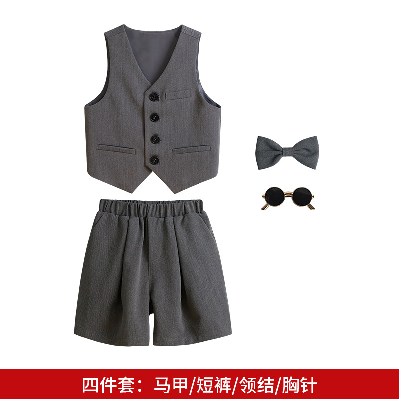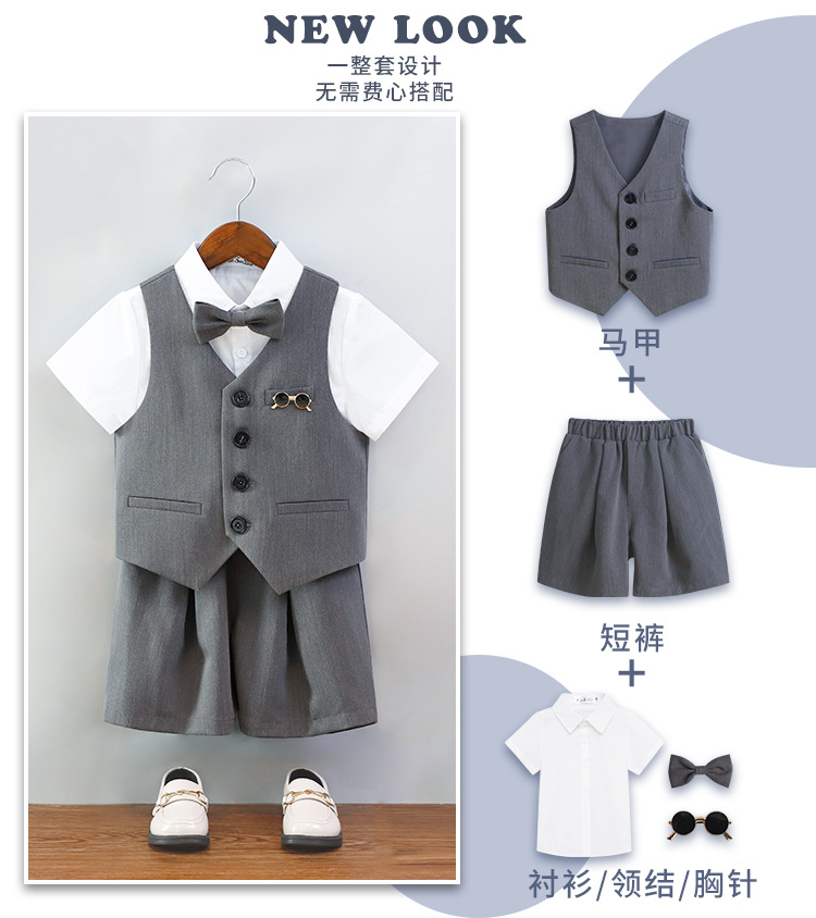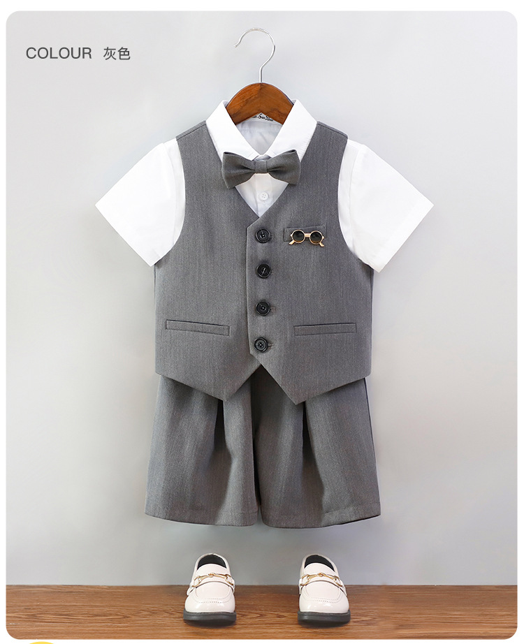 • 그레이 5 피스 세트 (반팔 셔츠 조끼 반바지 나비 넥타이 브로치)