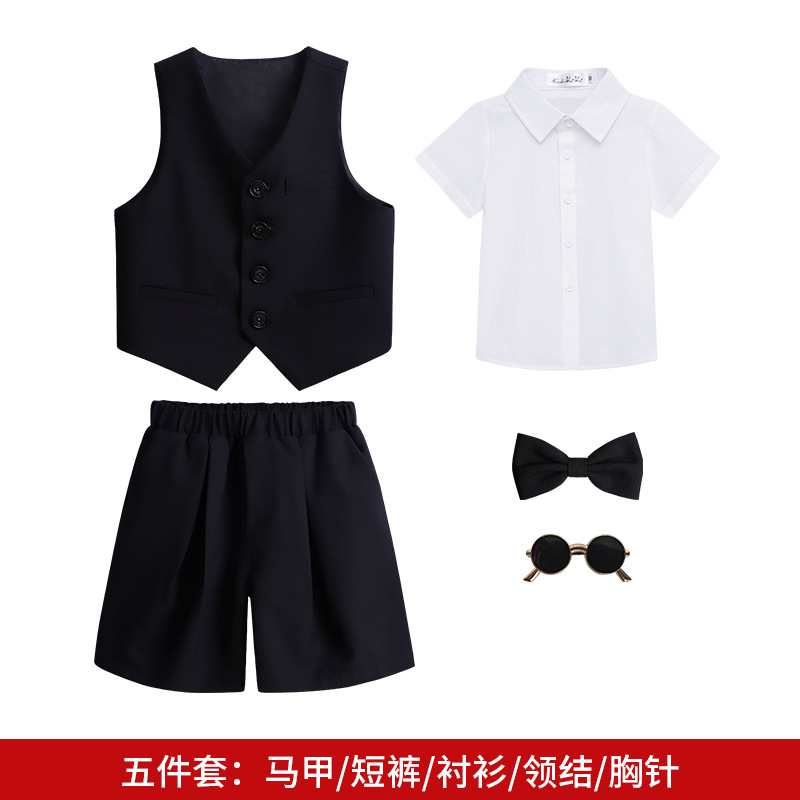 • 블랙 5 피스 세트 (반팔 셔츠 조끼 반바지 나비 넥타이 브로치)
