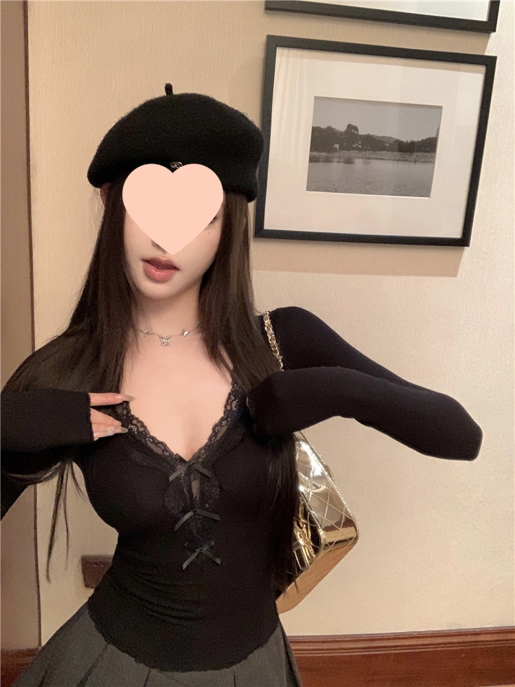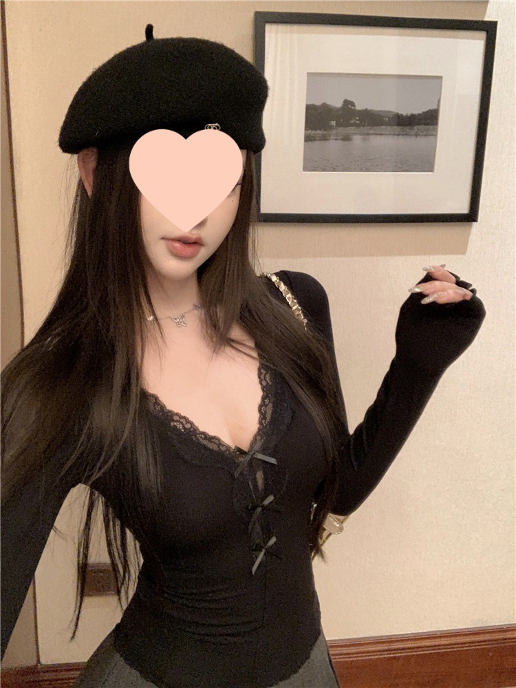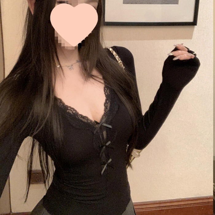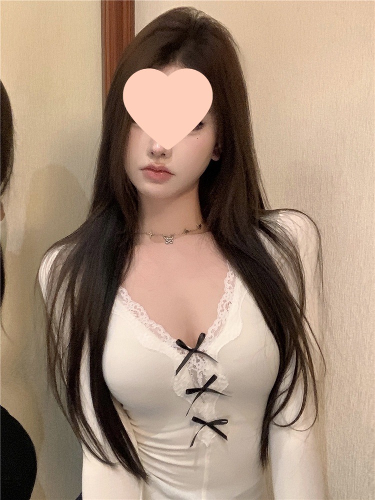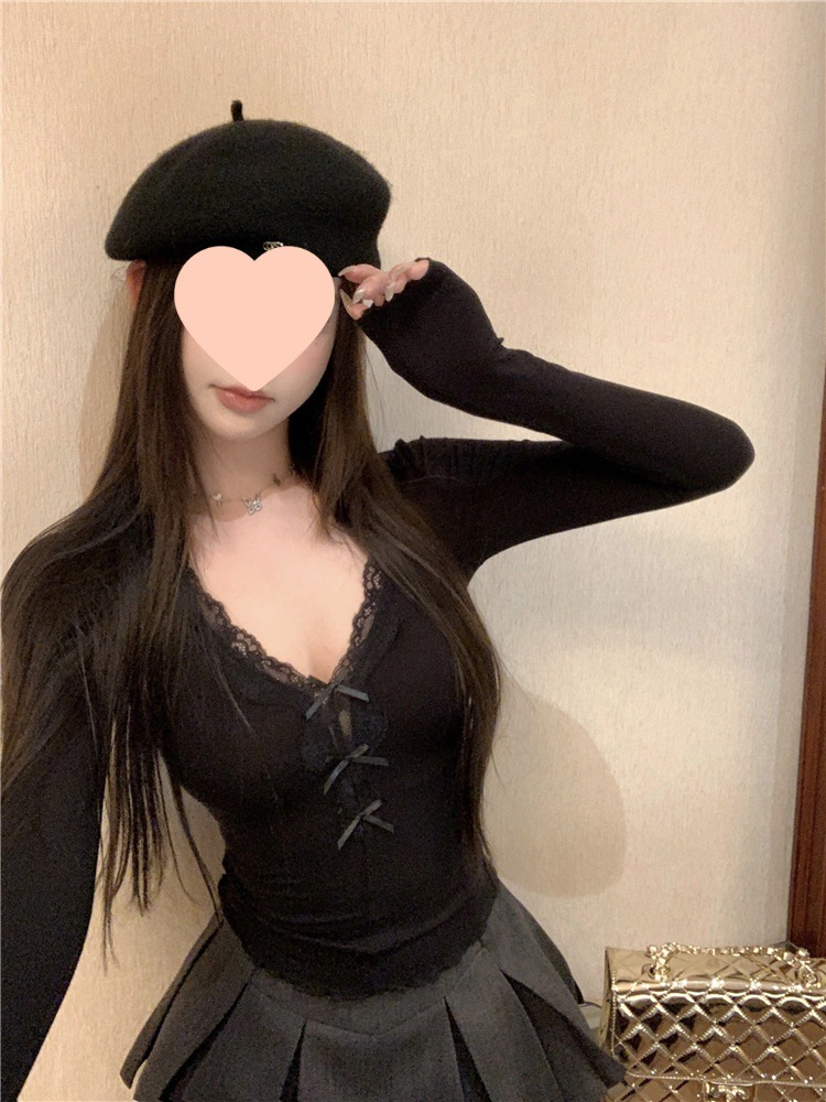 활 레이스 V 넥 긴팔 티셔츠 여성용 봄과 여름 순수 내면베이스 셔츠 슬림핏 짧은 스파이스 걸탑스토어 가기