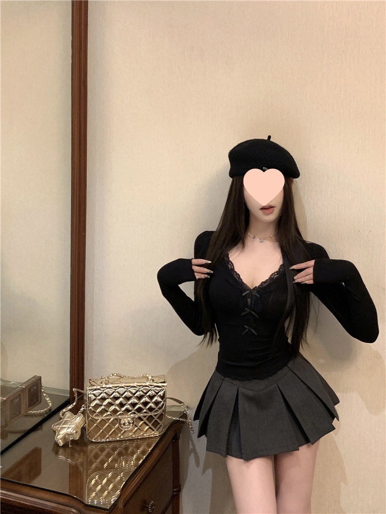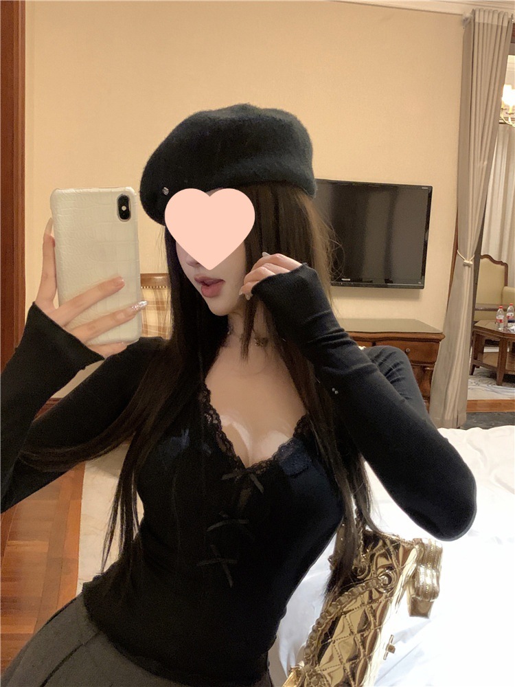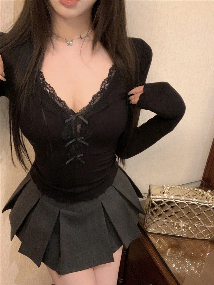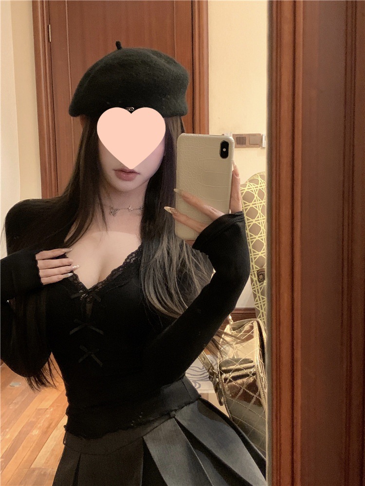 활 레이스 V 넥 긴팔 티셔츠 여성용 봄과 여름 순수 내면베이스 셔츠 슬림핏 짧은 스파이스 걸탑스토어 가기