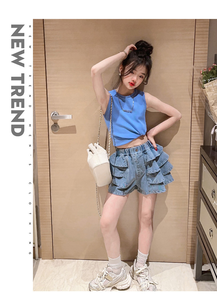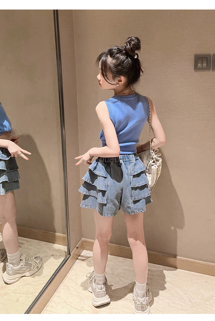 국경 간 소녀 정장 여름 2025 새로운 어린이 거리 민소매 조끼 중형 및 대형 어린이 유행 투피스 세트