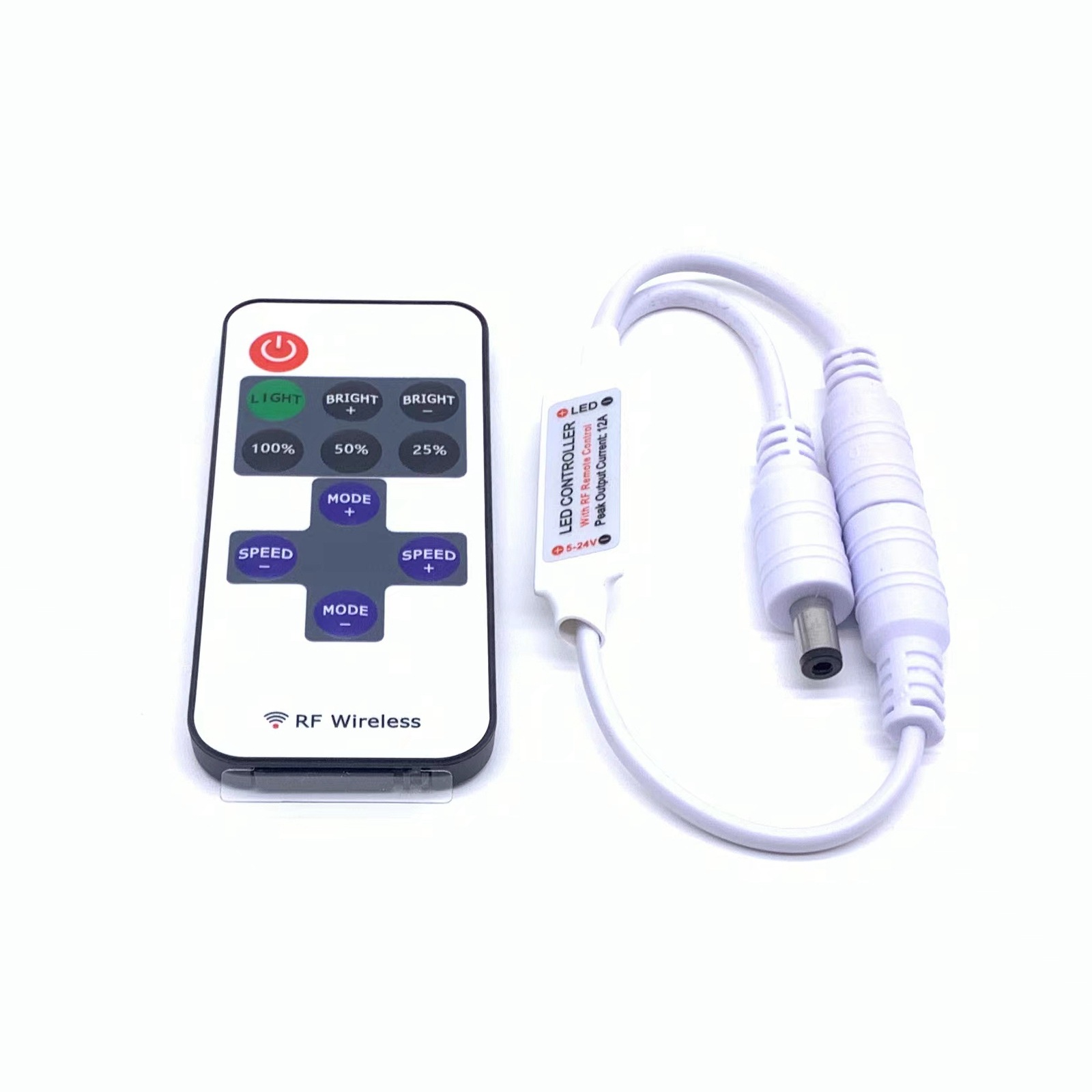 此款控制器采用先进电脑控制芯片,通过433MHz无线信号进行控制,用于控制各种以led为光源的单色灯具,例如:点光源,软光条,洗墙灯,玻璃幕墙灯等;具有价格低廉,接线方便,使用简单等优点;根据客户要求,可实现单路静态十级亮度调节,8种单色动态模式,可实现爆闪、呼吸、渐明渐暗、频闪、闪烁等多种模式,并有10级调速,速度跨度大,控制器具有携带方便,使用简单等特点