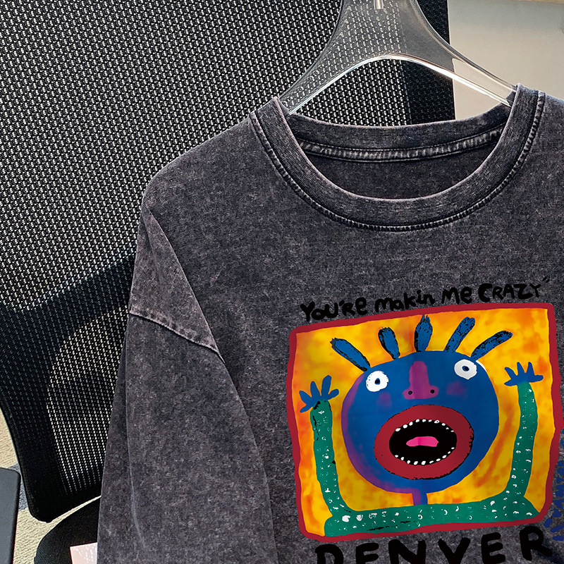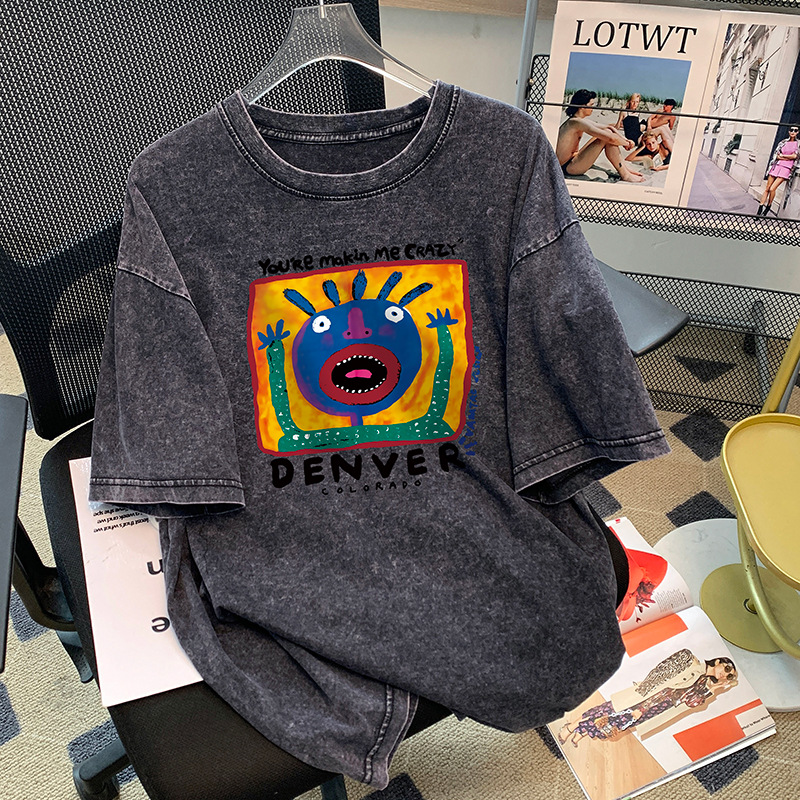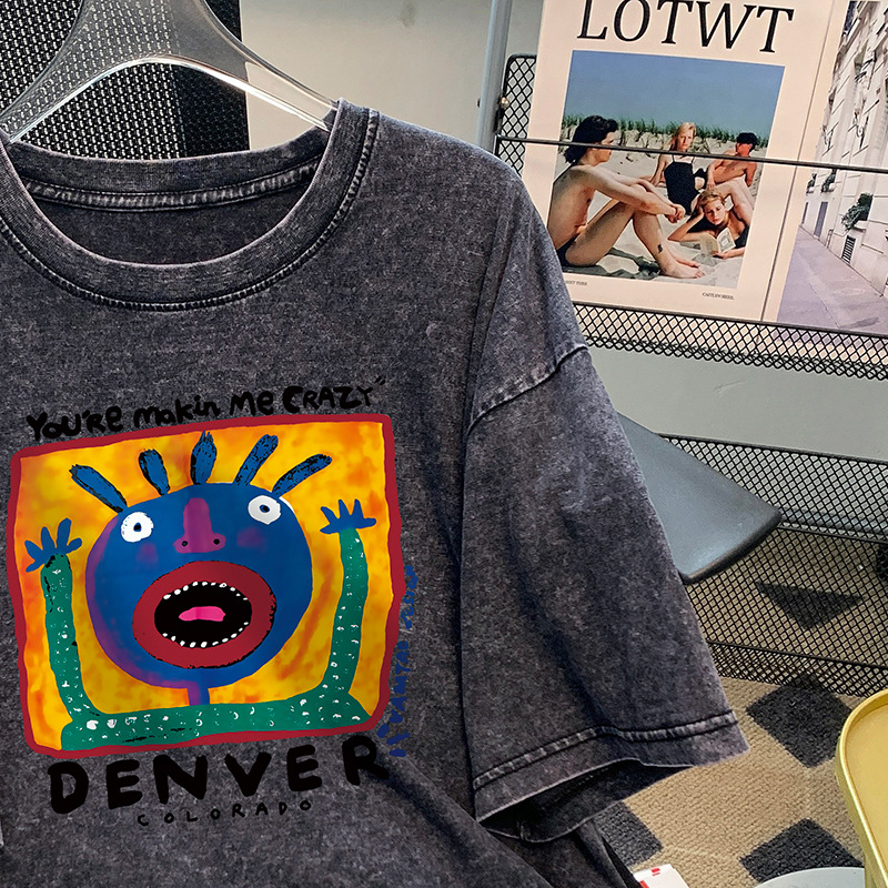 유럽과 미국의 레트로 세탁 블랙 반팔 티셔츠 남녀 트렌디 브랜드 스트리트 루즈 캐주얼 커플 반소매 티코튼 티셔츠