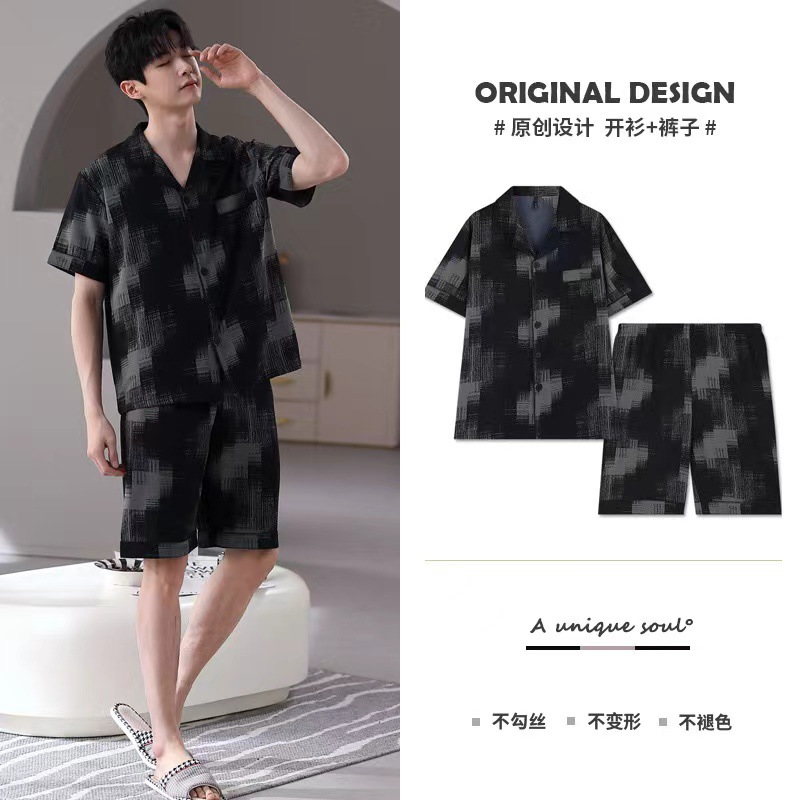 십대 남자 잠옷 여름 아이스 실크 반팔 반바지 카디건 남자 얇은 느슨한 대형 여름 홈 옷스토어 가기