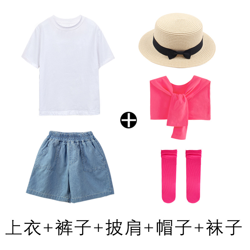 • 데님 반바지 흰색 T 장미 빨간 목도리 로즈 빨간 얼음 양말 어린이 밀짚 모자