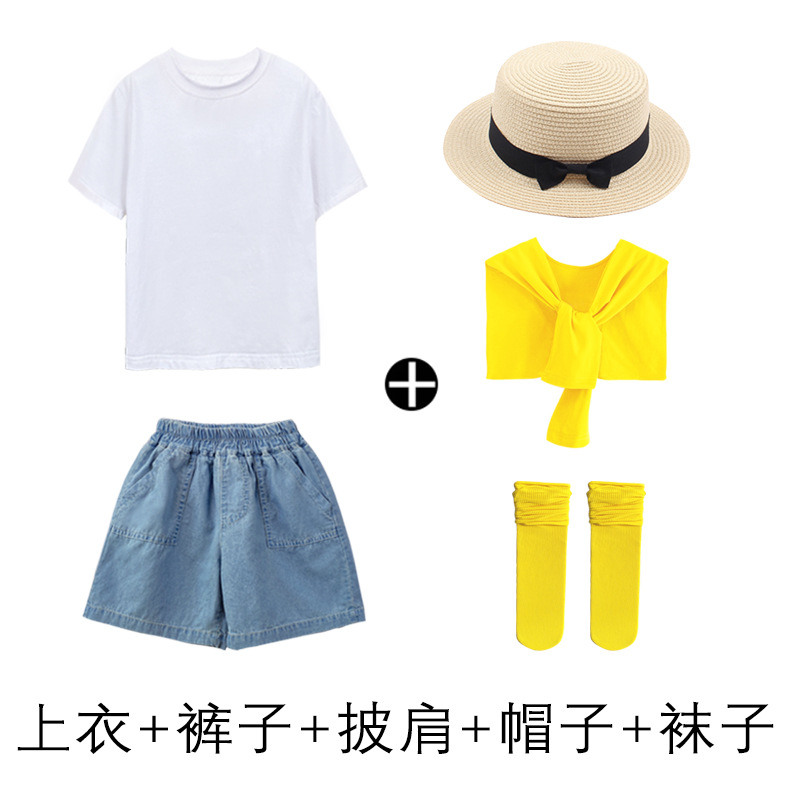 • 데님 반바지 흰색 T 노란색 목도리 노란색 얼음 양말 어린이 밀짚 모자