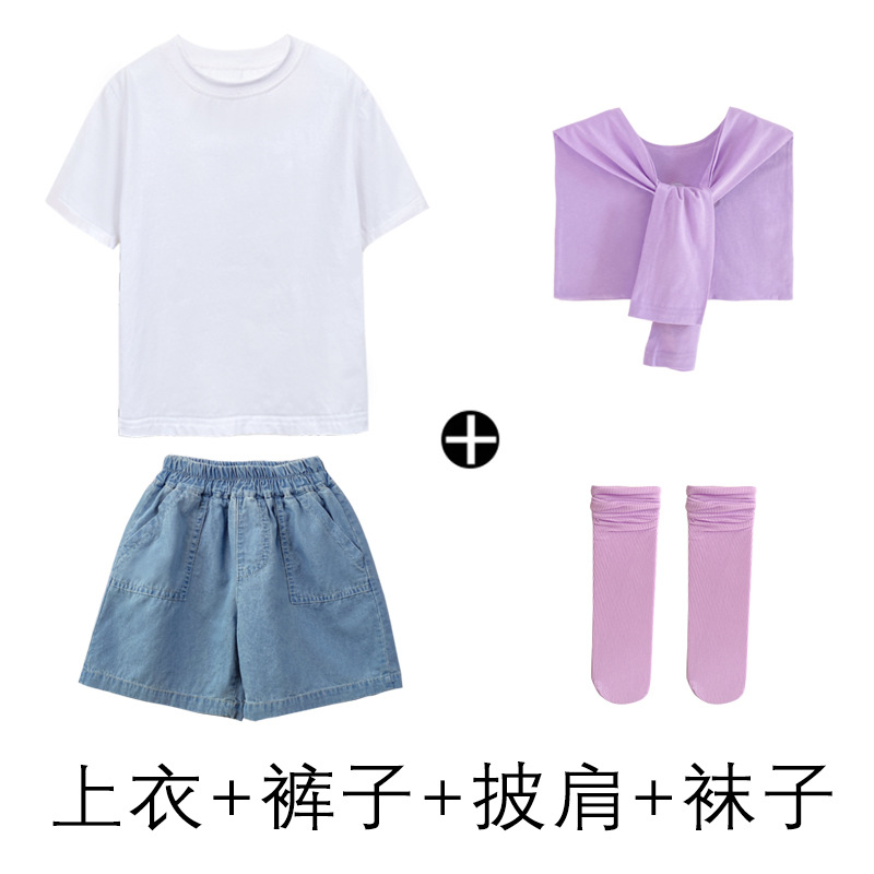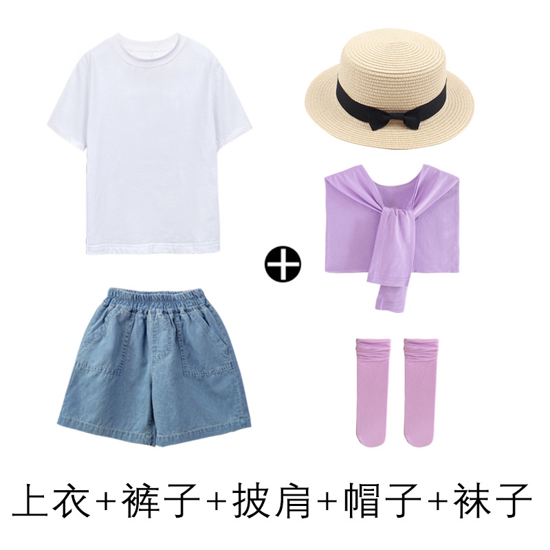 • 데님 반바지 흰색 T 보라색 목도리 라이트 퍼플 얼음 양말 어린이 밀짚 모자