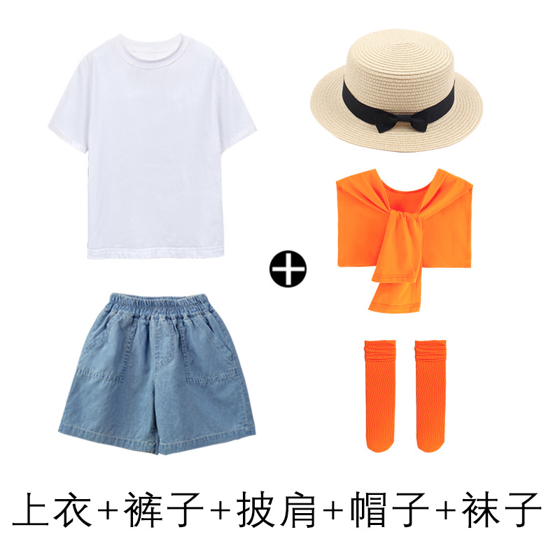 • 데님 반바지 흰색 T 오렌지 목도리 오렌지 얼음 양말 어린이 밀짚 모자