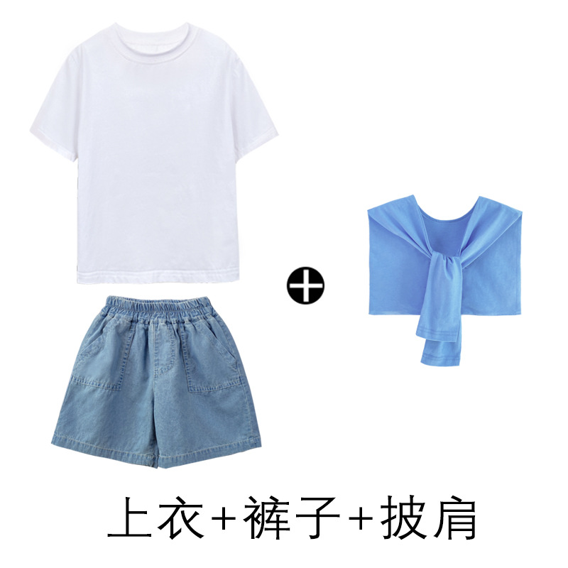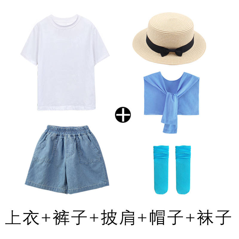 • 데님 반바지 흰색 T 파란색 목도리 라이트 블루 얼음 양말 어린이 밀짚 모자
