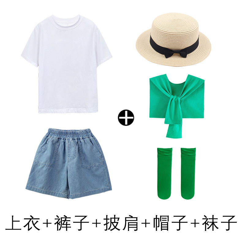 • 데님 반바지 흰색 T 녹색 목도리 다크 그린 얼음 양말 어린이 밀짚 모자