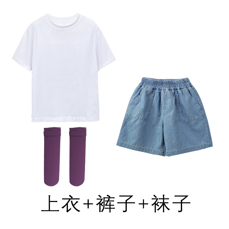 • 데님 반바지 흰색 T 라이트 퍼플 아이스 양말