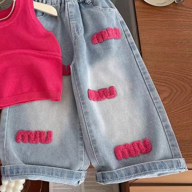 2025년 신상 한국 스타일 여아 여름 세트 여아 니트 끈 조끼와 청바지 투피스 세트 어린이 여름 스타일