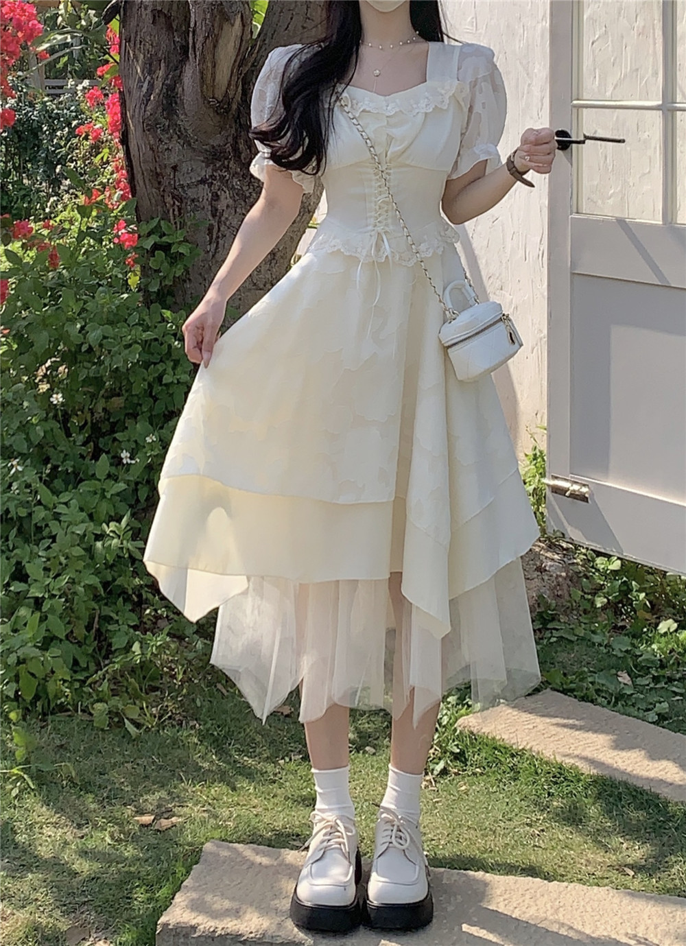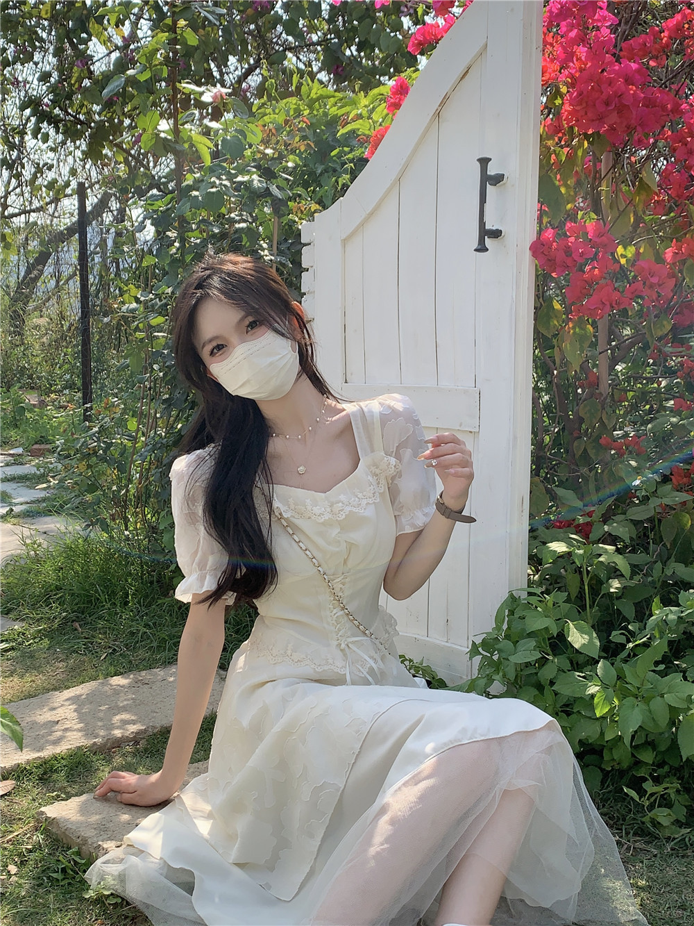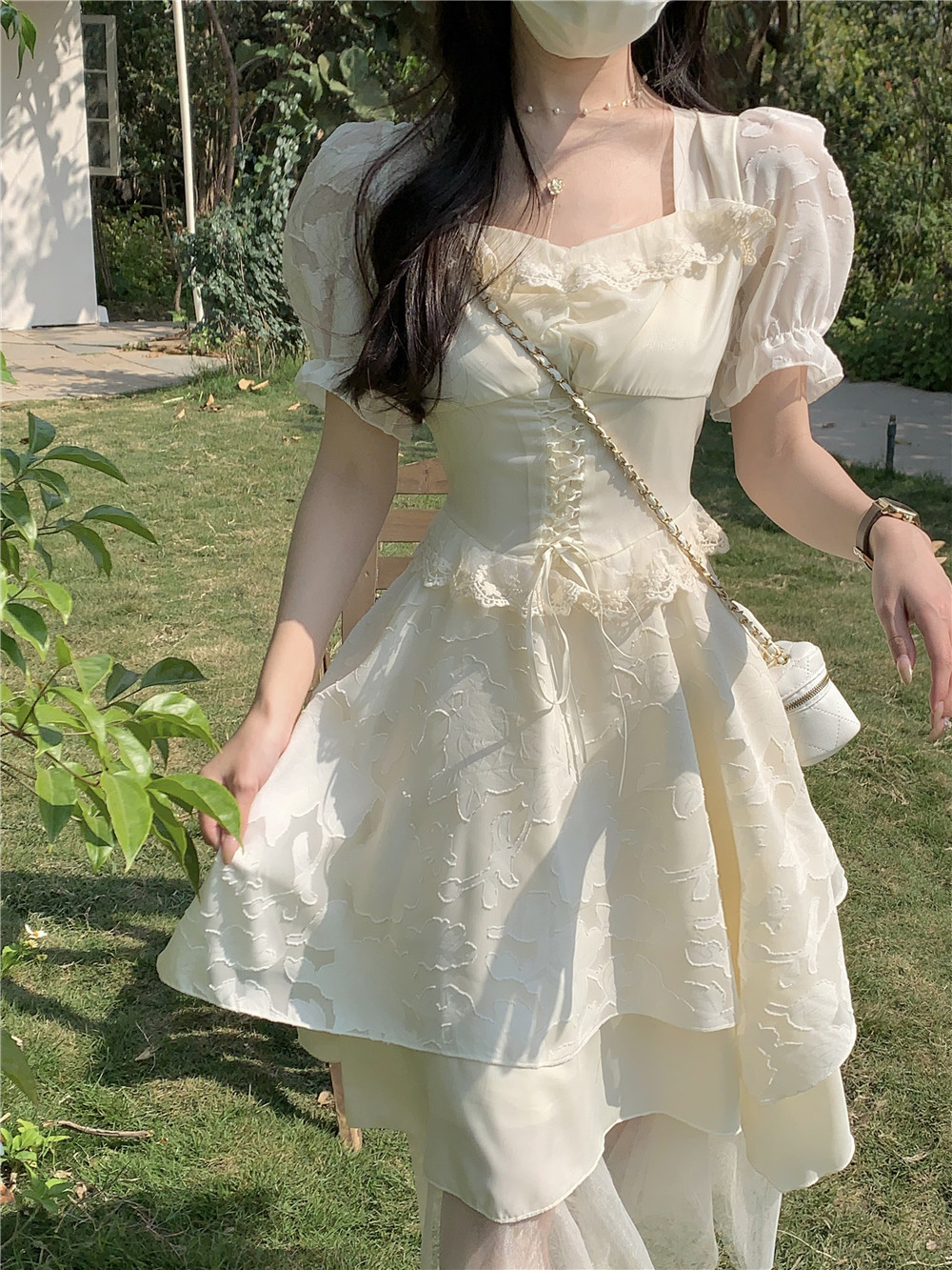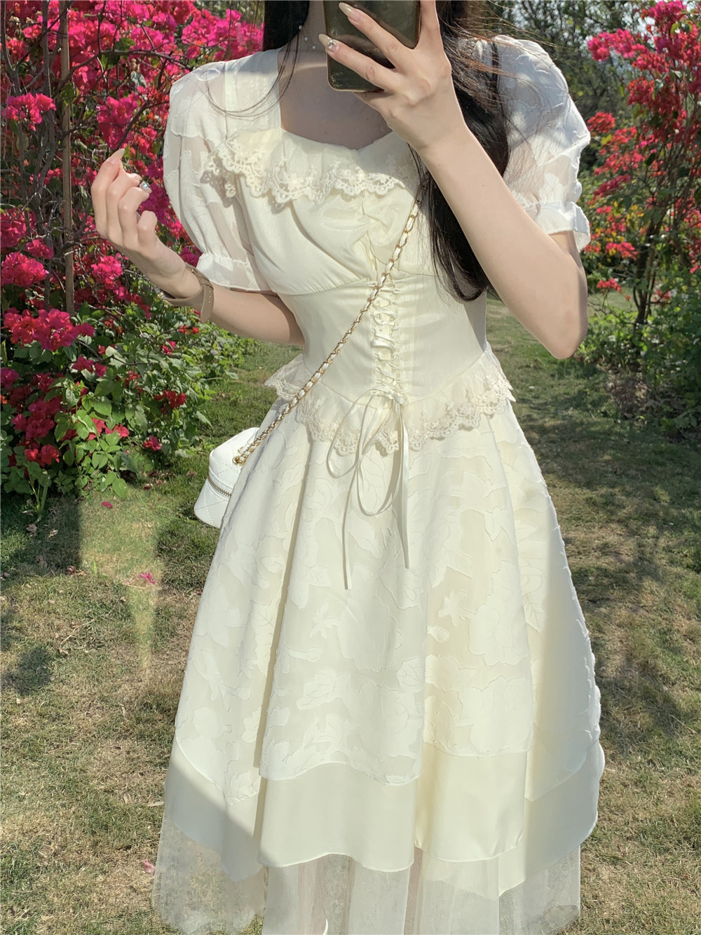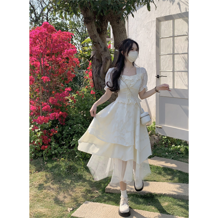 디자인 페어리 이어 엣지 스퀘어 칼라 원피스 여성의 2024 여름 공주 스타일 타이트 허리 퍼프 케이크 원피스 트렌디