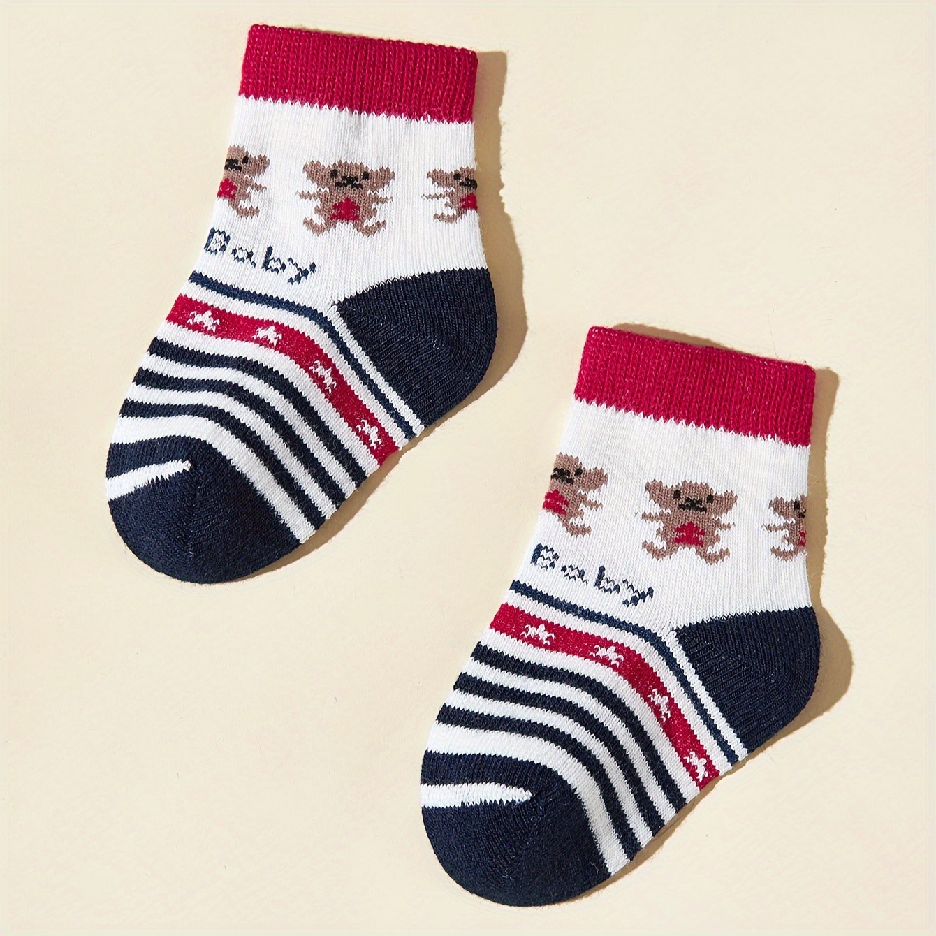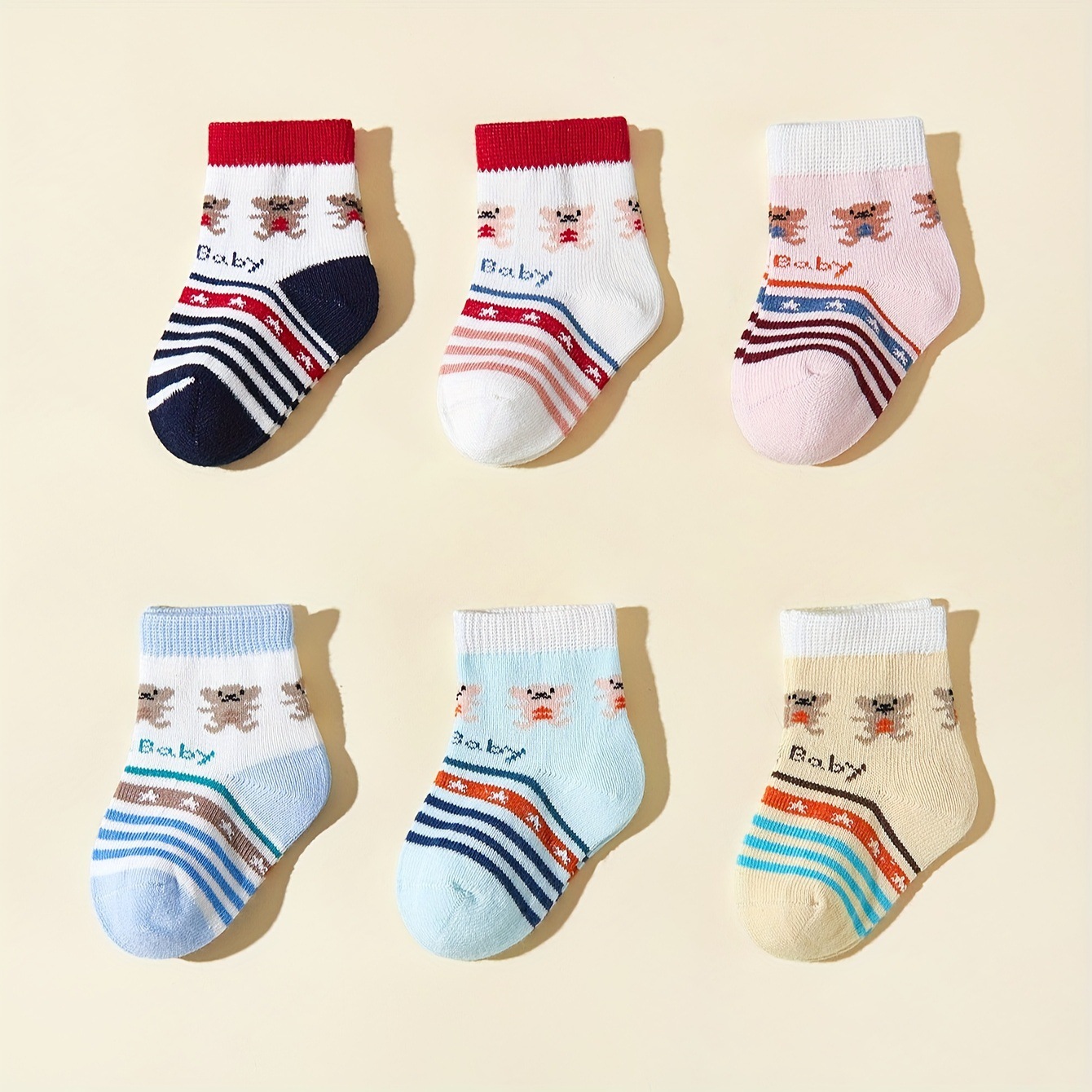 6 쌍의 아기 남성과 여성의 아기 줄무늬 자수 미드 튜브 양말 두껍게 매끄러운 양말 머리가 발을 다치게하지 않습니다