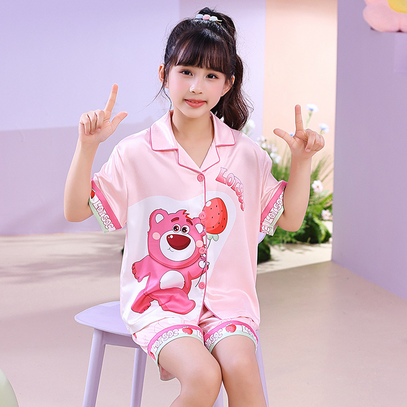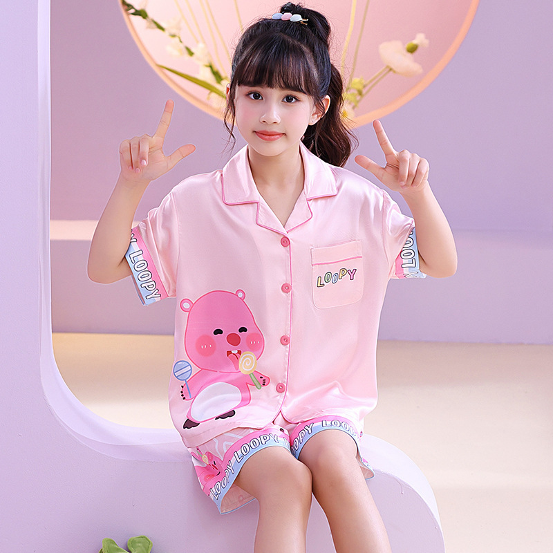 남학생 잠옷 여름 아이스 실크 얇은 반팔 어린이 만화 귀여운 중간 및 큰 어린이 소년 에어컨 홈 의류 세트