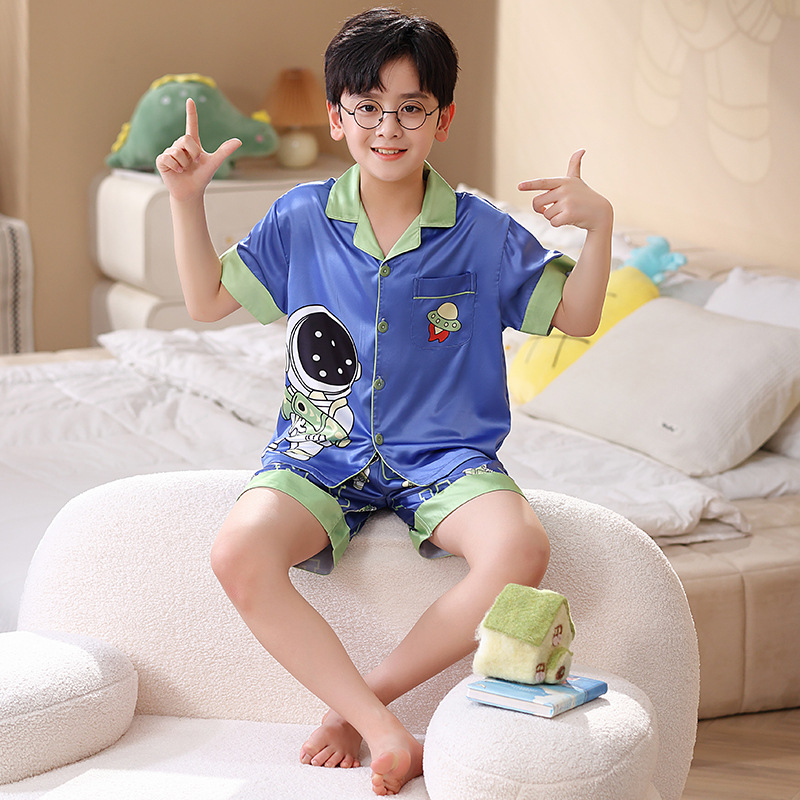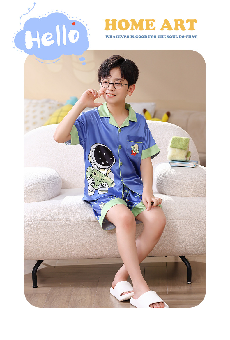 남학생 잠옷 여름 아이스 실크 얇은 반팔 어린이 만화 귀여운 중간 및 큰 어린이 소년 에어컨 홈 의류 세트스토어 가기