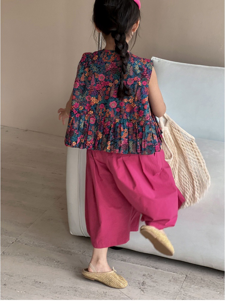 소녀의 여름 세트 2025 새로운 스타일 소녀의 민소매 꽃 셔츠 여름 어린이 넓은 다리 바지 투피스 세트