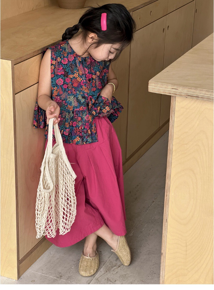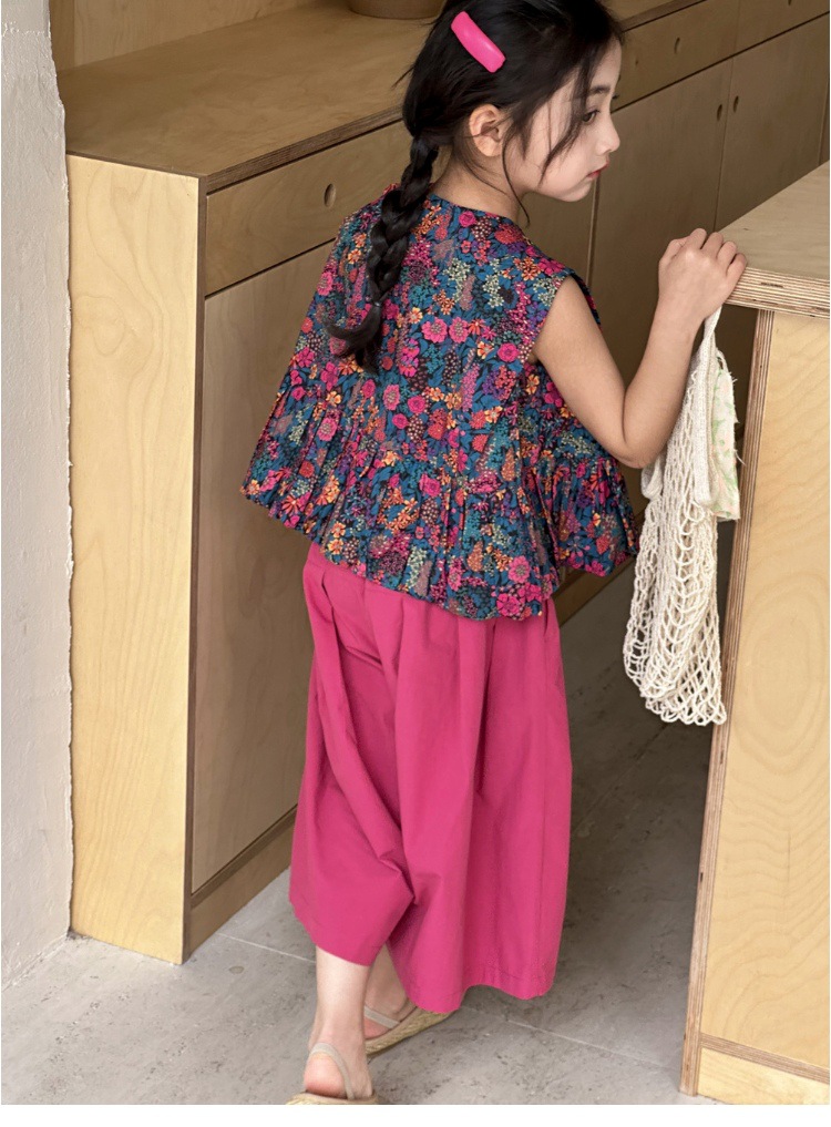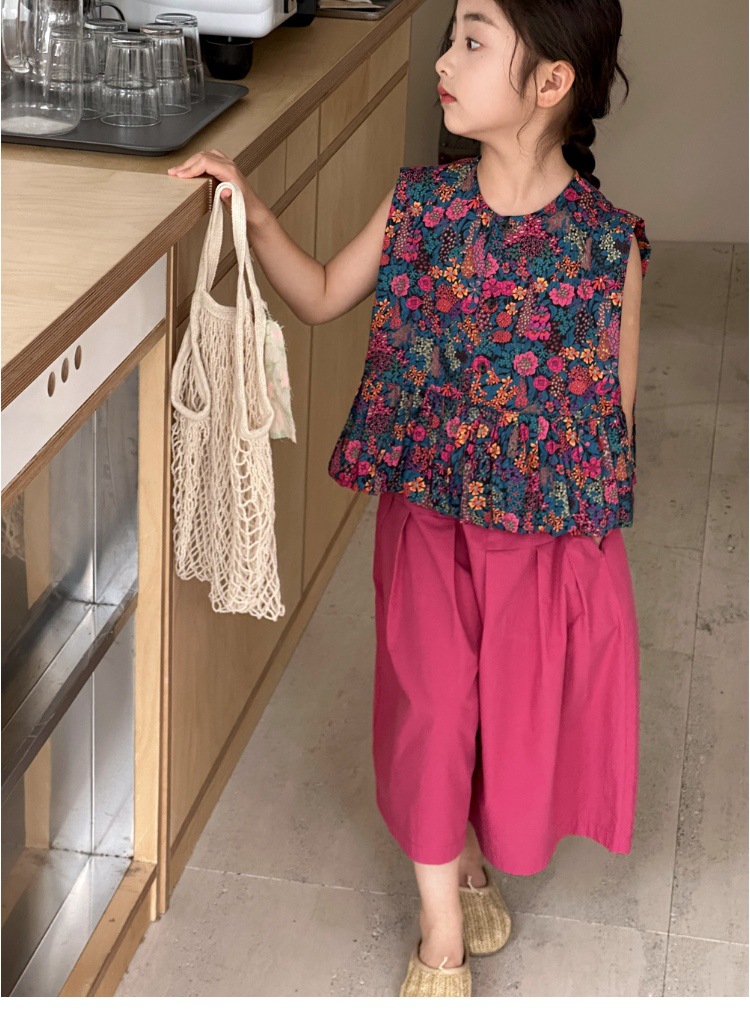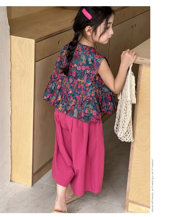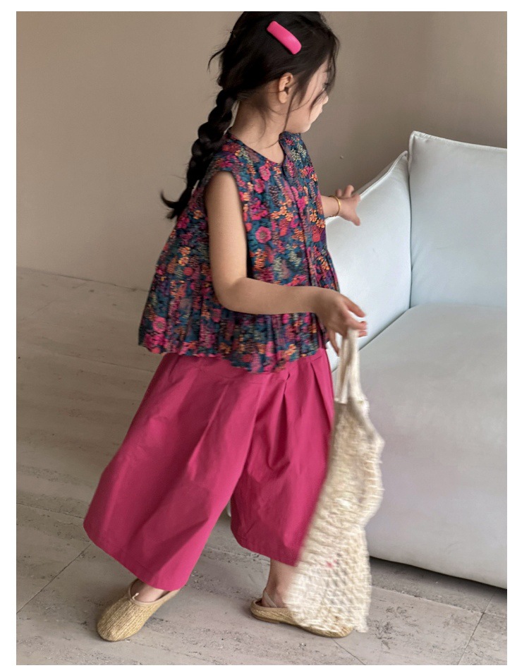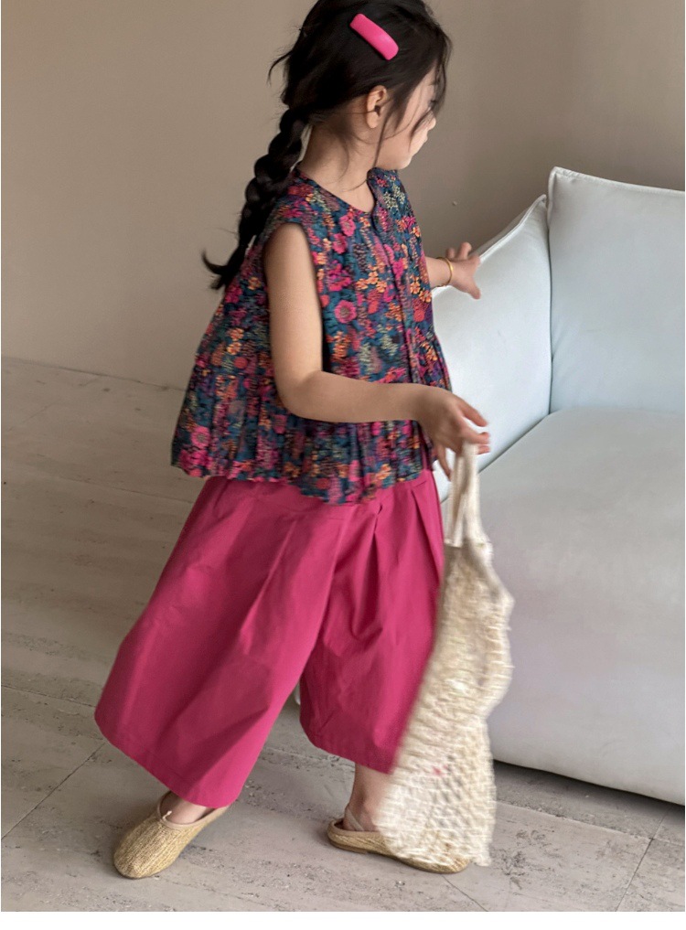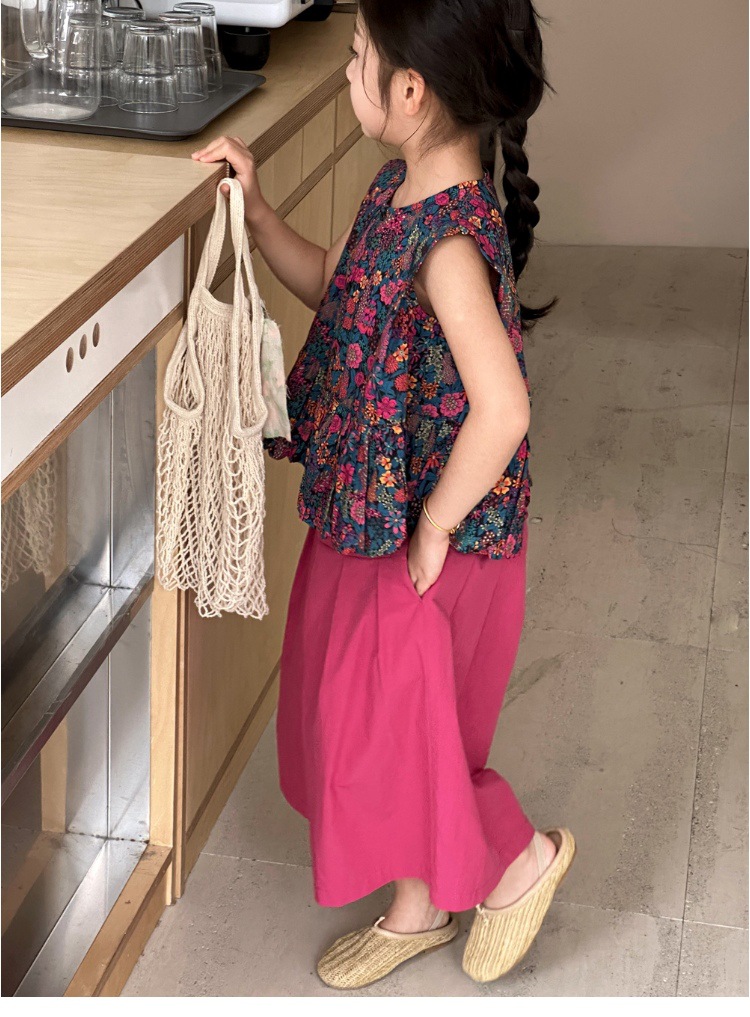 소녀의 여름 세트 2025 새로운 스타일 소녀의 민소매 꽃 셔츠 여름 어린이 넓은 다리 바지 투피스 세트스토어 가기