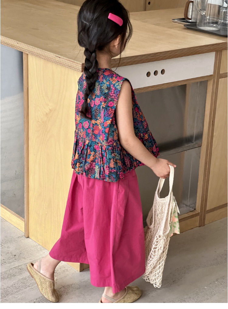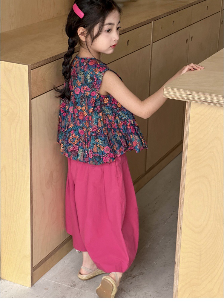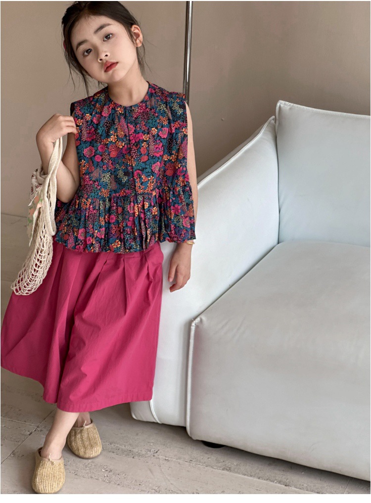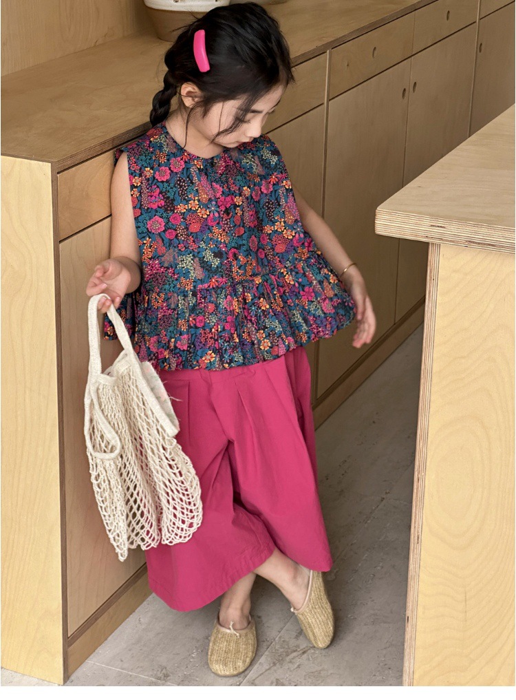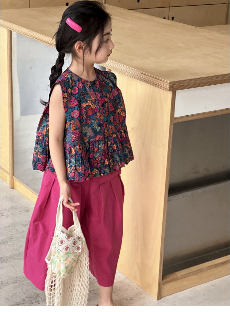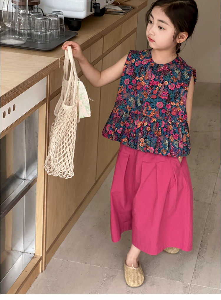 소녀의 여름 세트 2025 새로운 스타일 소녀의 민소매 꽃 셔츠 여름 어린이 넓은 다리 바지 투피스 세트스토어 가기