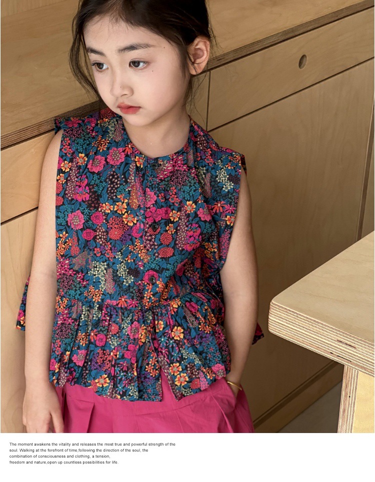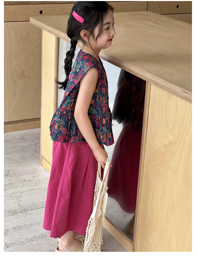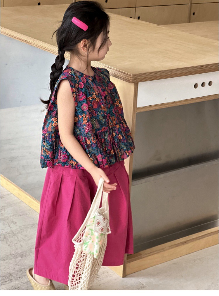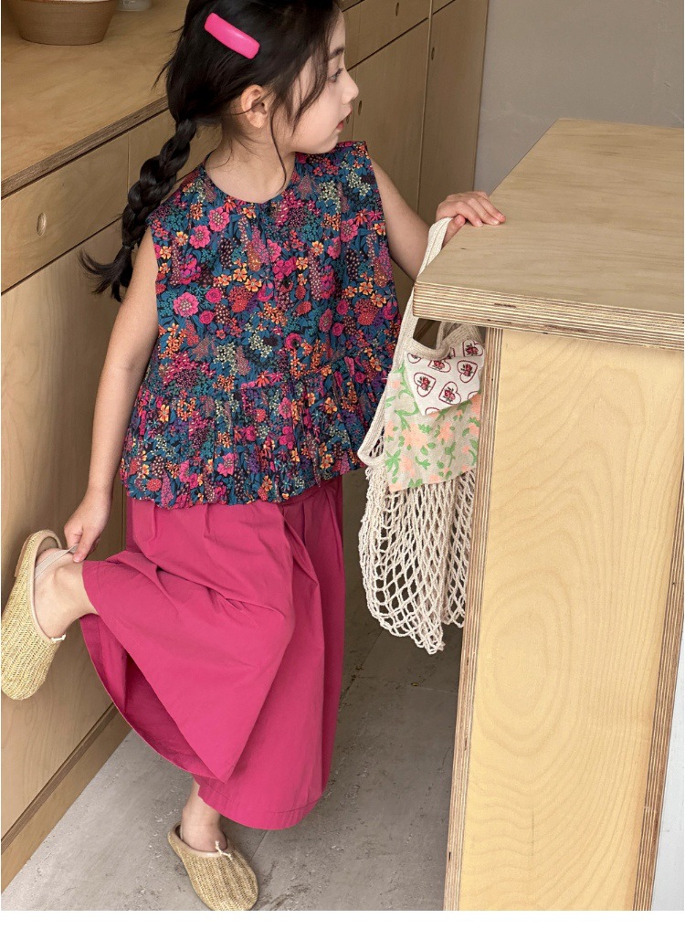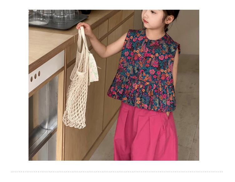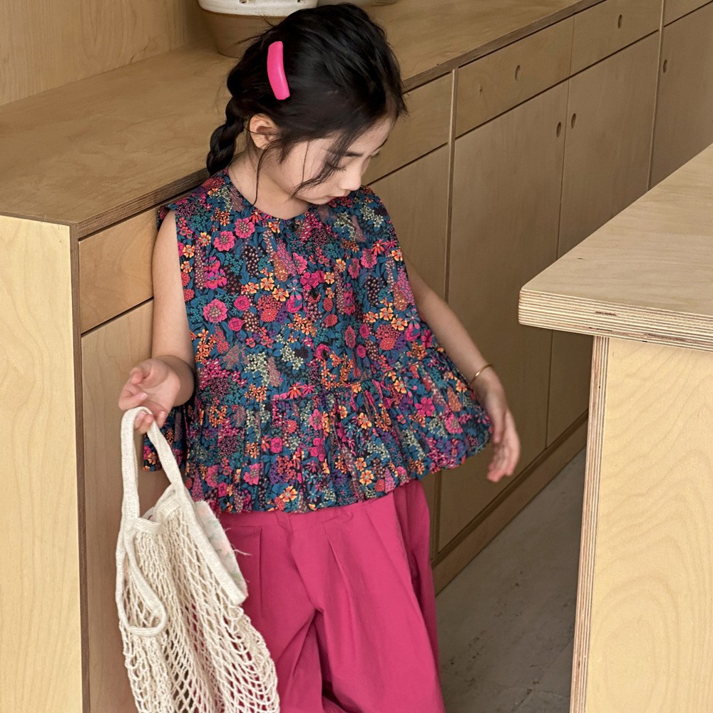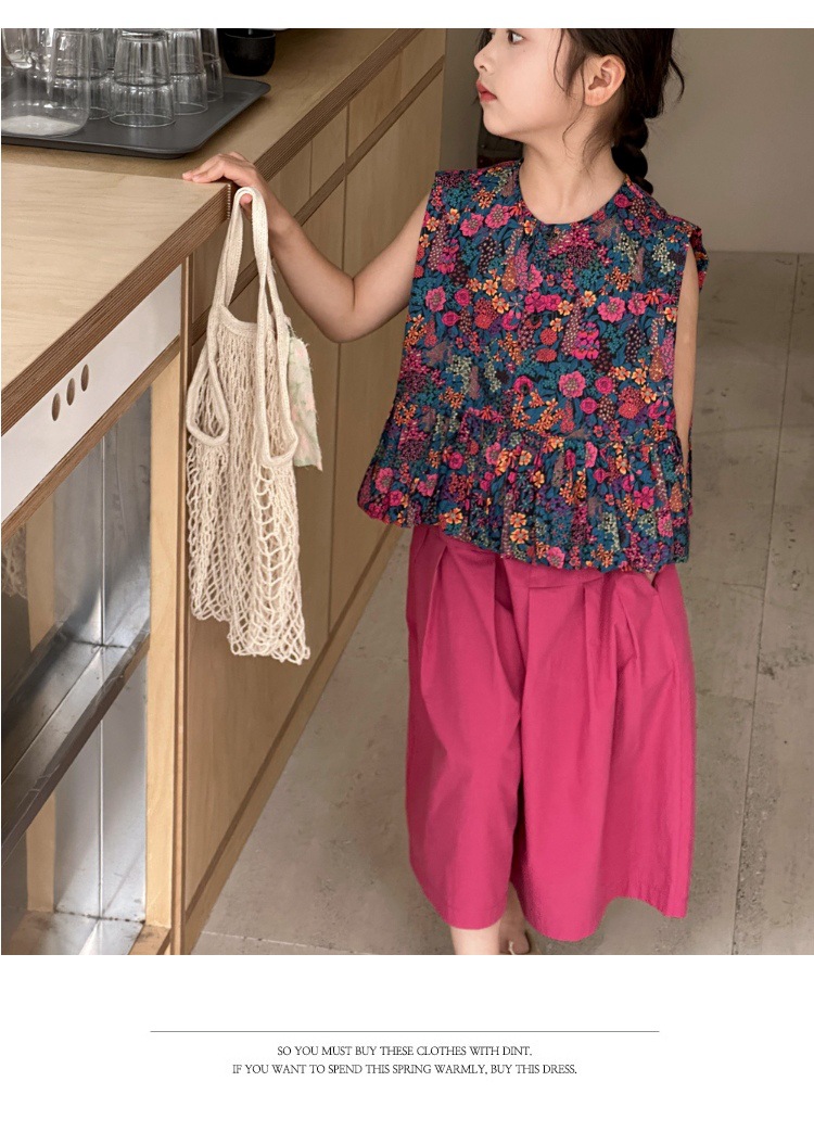 소녀의 여름 세트 2025 새로운 스타일 소녀의 민소매 꽃 셔츠 여름 어린이 넓은 다리 바지 투피스 세트스토어 가기