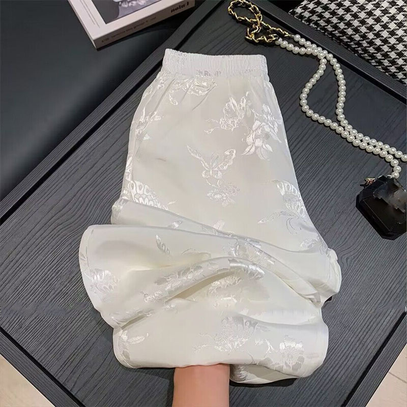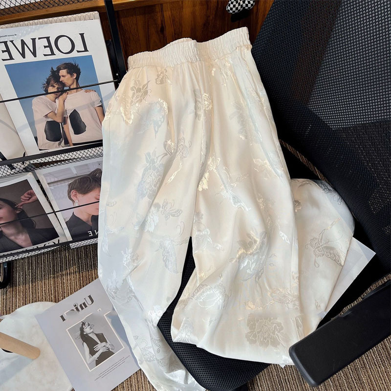 화이트 내셔널 스타일 새틴 자카드 넓은 다리 바지 여성 여름 2024 새로운 중국 스타일 아이스 실크 멋진 바지 슬림 핏