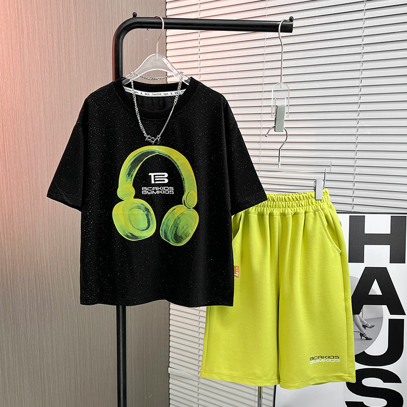 남자들의 여름 새로운 핫 드릴링 반팔 투피스 세트 2024 중대형 어린이 서양식 트렌디 캐주얼 스포츠 세트 얇은스토어 가기