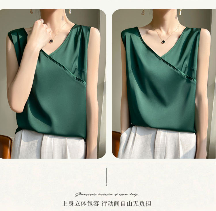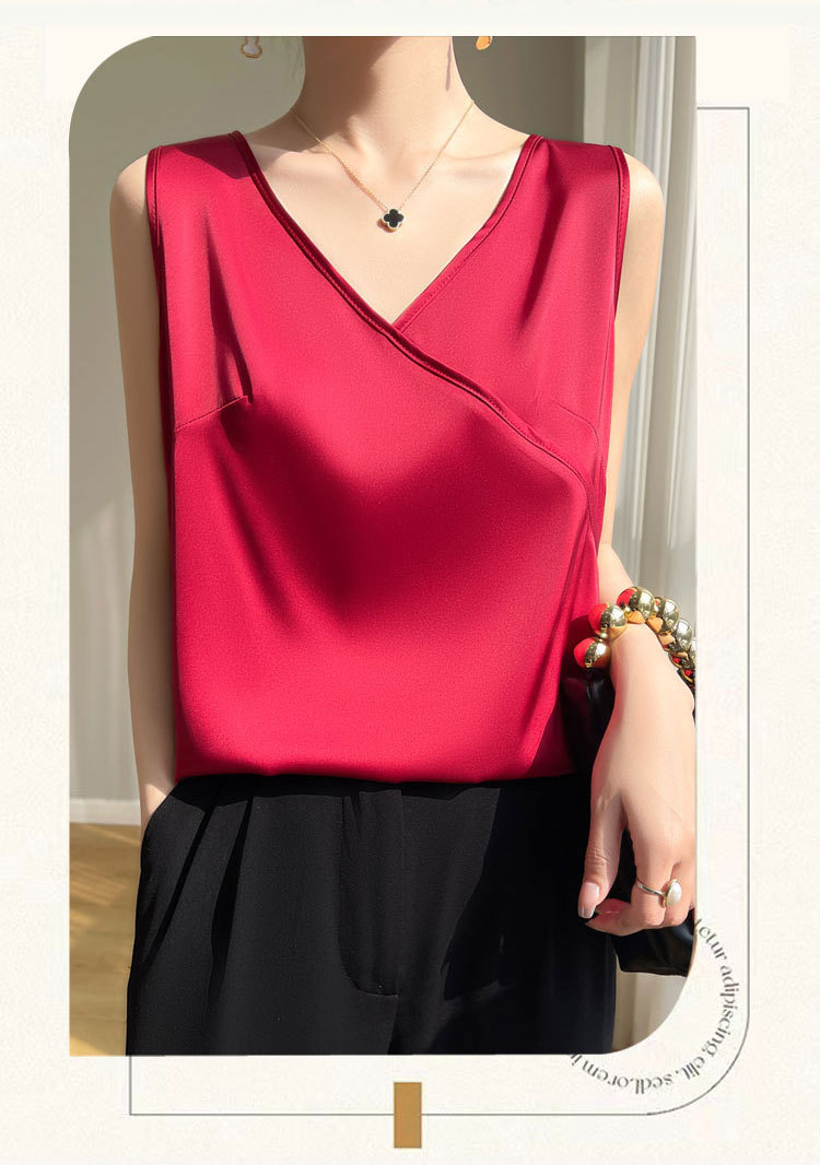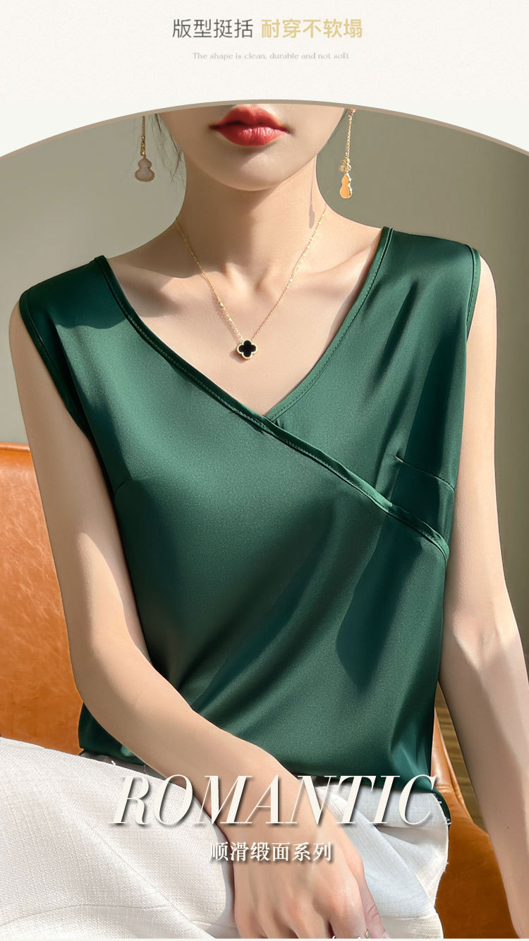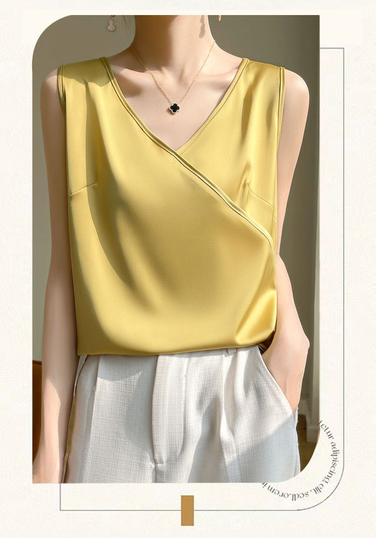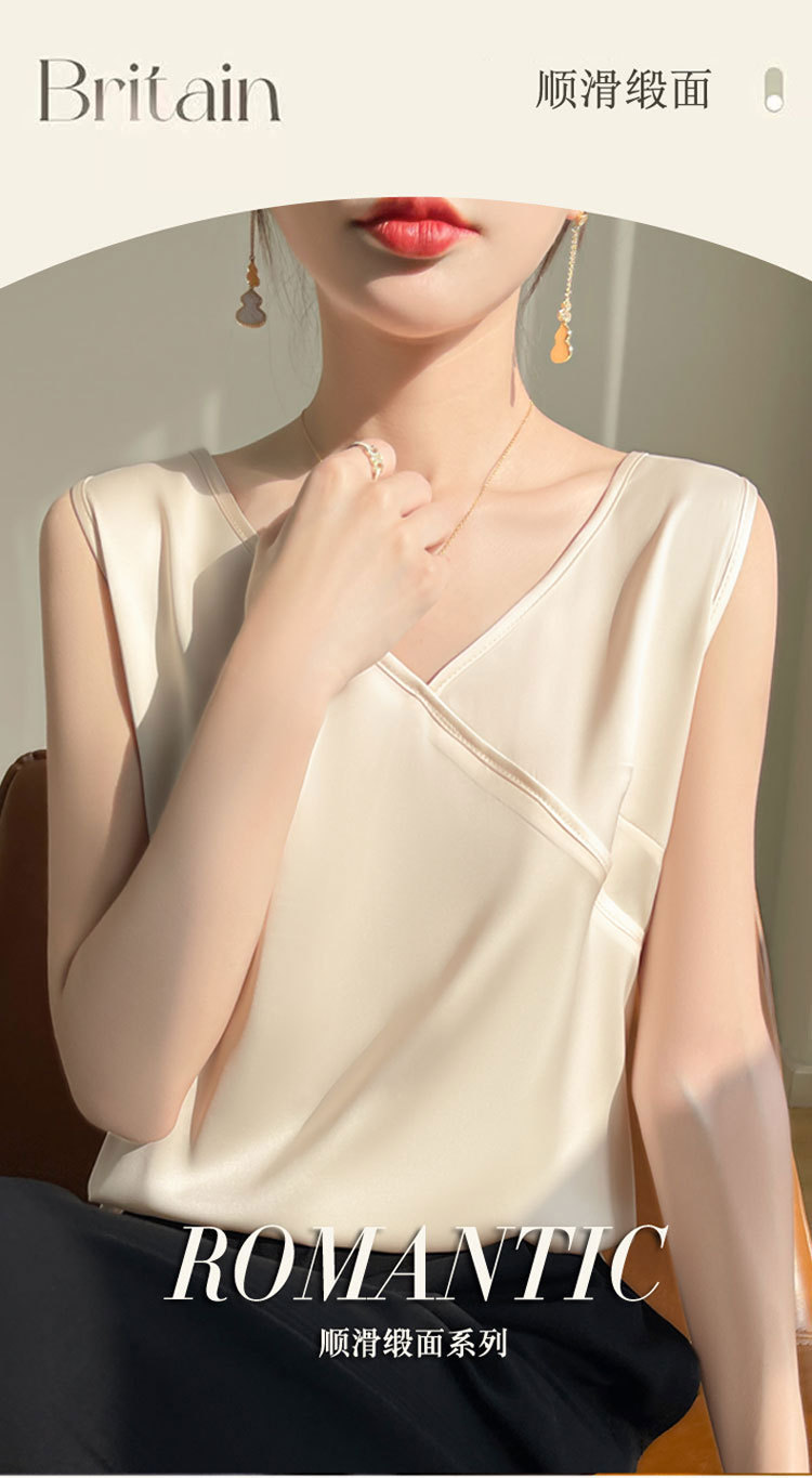 고급 실크 새틴 V 넥 캐미솔 여성의 봄과 여름 새로운 넓은 어깨 짧은 민소매 탑스토어 가기