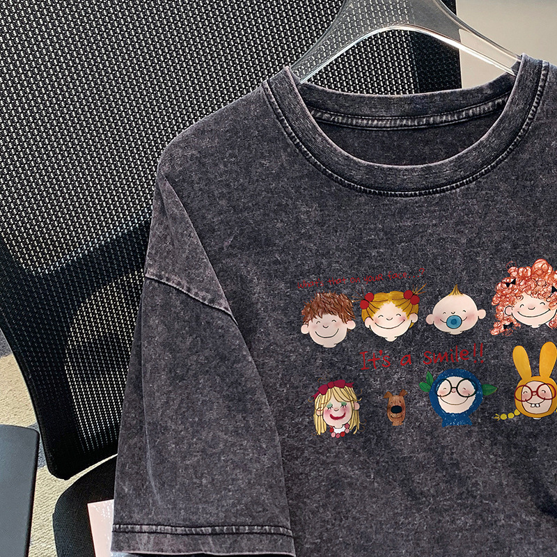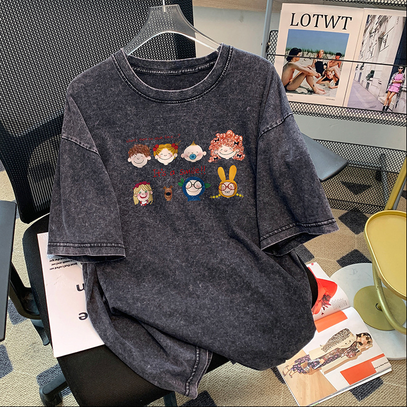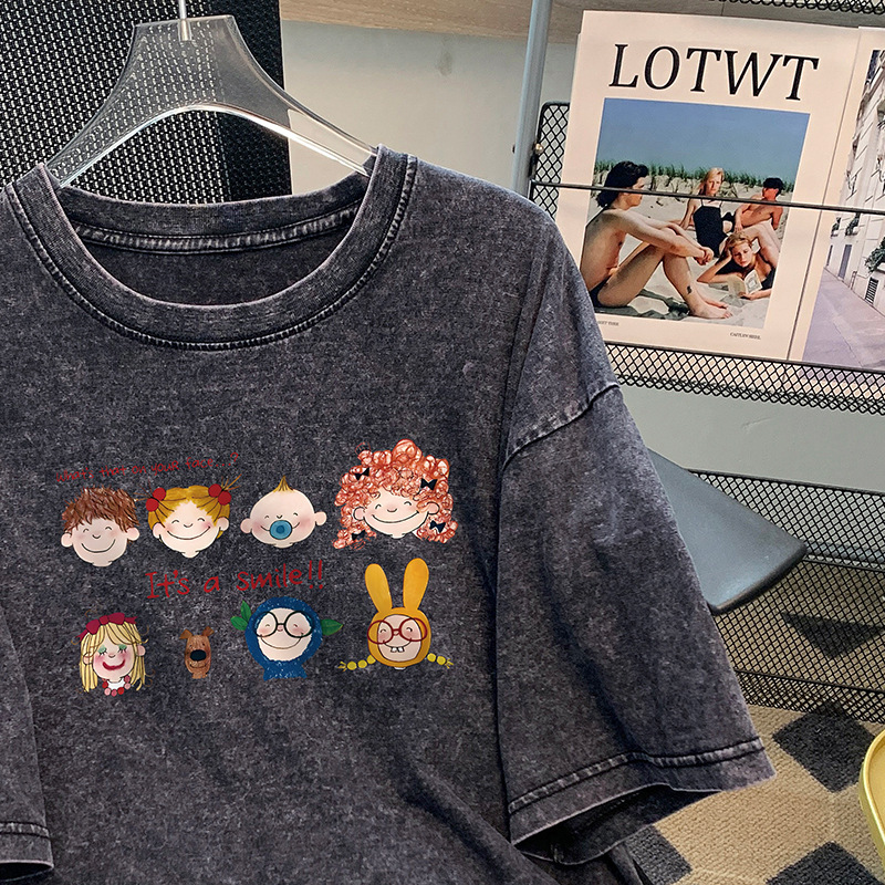 세탁 된 오래된 반팔 티셔츠 남성과 여성의 퓨어 코튼 루즈 여름 아메리칸 스타일 레트로 반소매 티셔츠 탑 의류 트렌디 브랜드스토어 가기