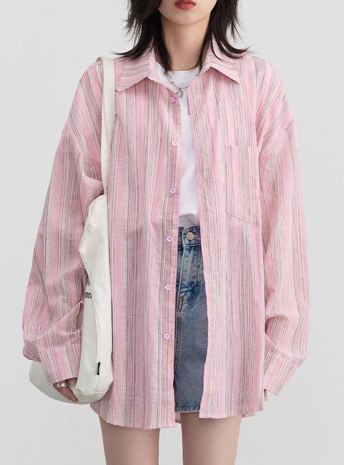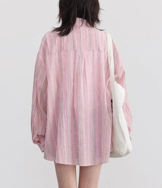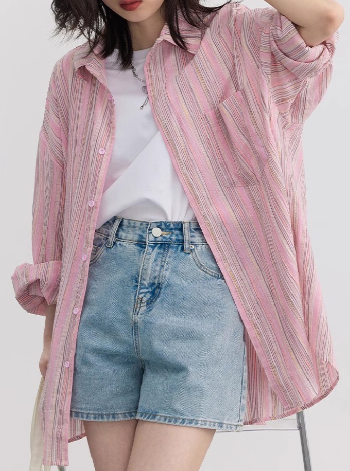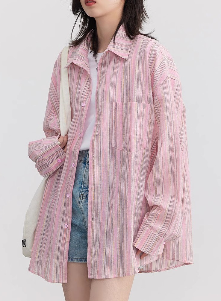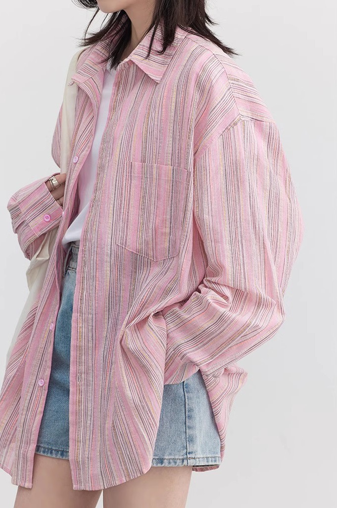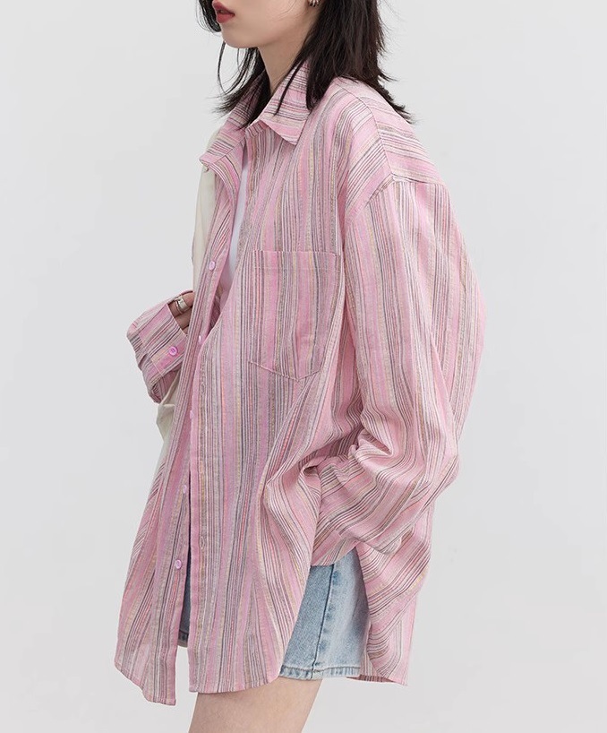 치킨 "여름 휴가" 느슨한 줄무늬 핑크 리넨 셔츠 여성 최고 선스크린 셔츠 여름 새로운스토어 가기