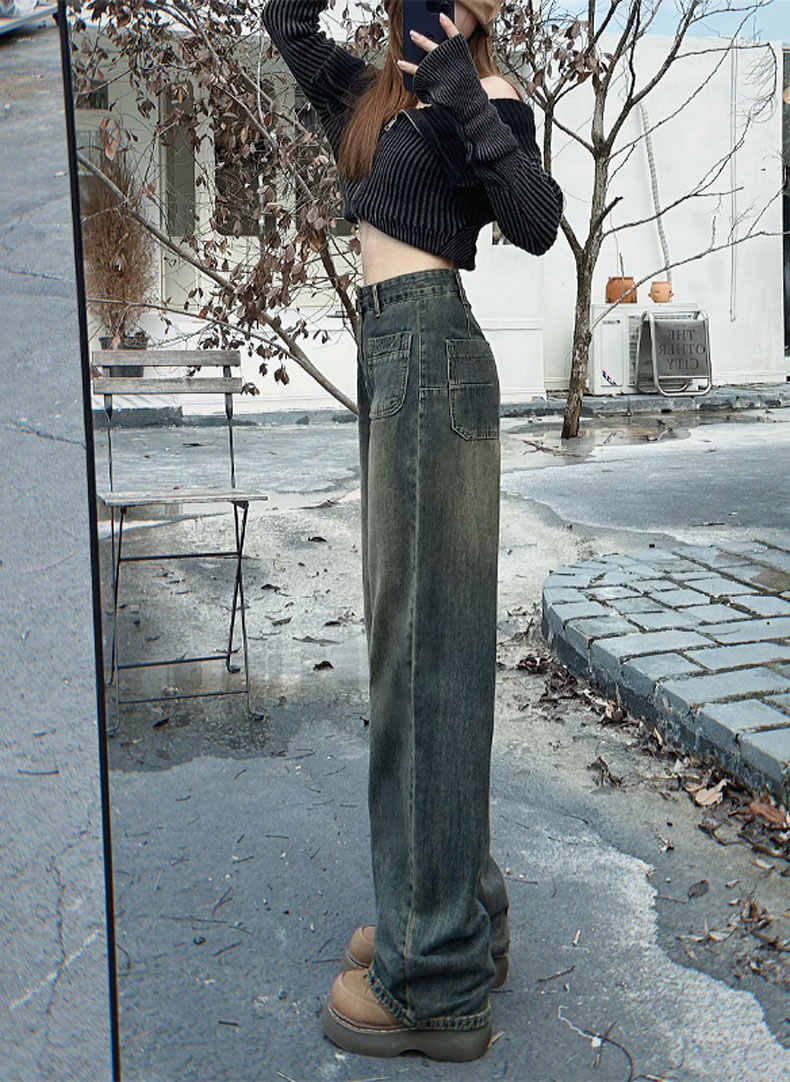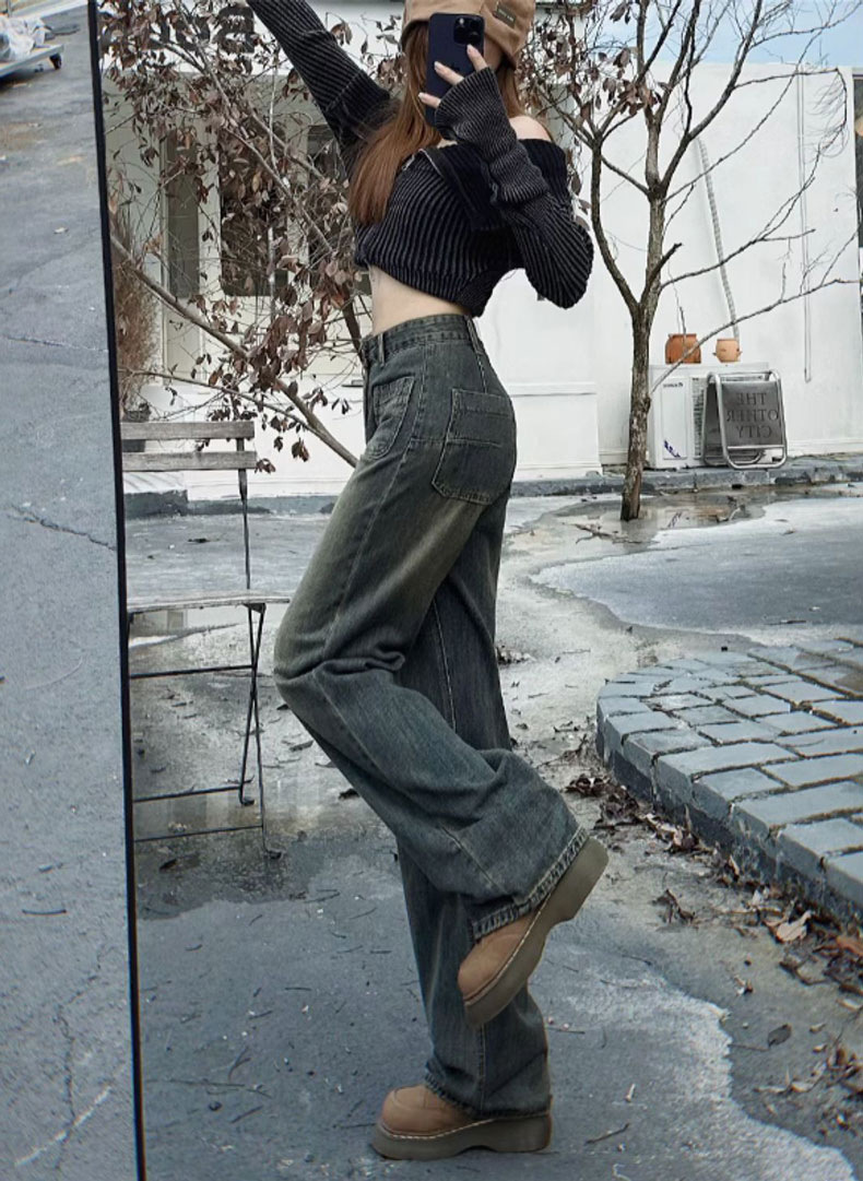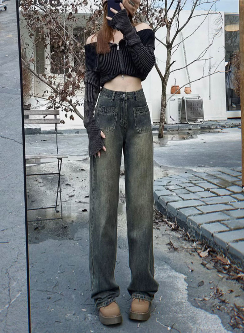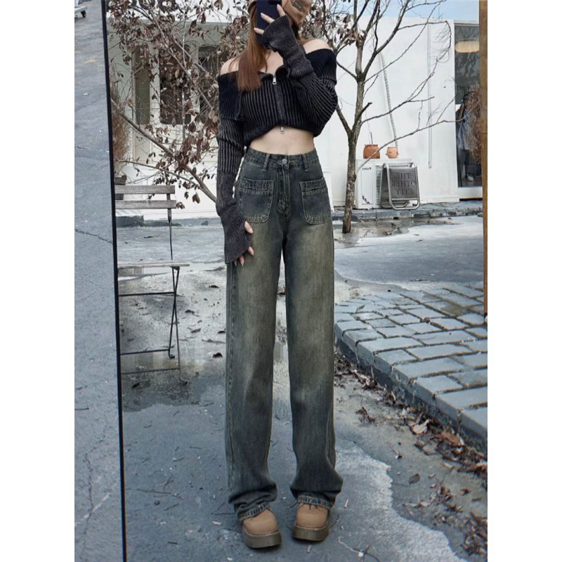 디자인 센스 포켓 좁은 넓은 다리 청바지 여성의 봄과 가을 작은 시멘트 회색 높은 허리 스트레이트 바지스토어 가기