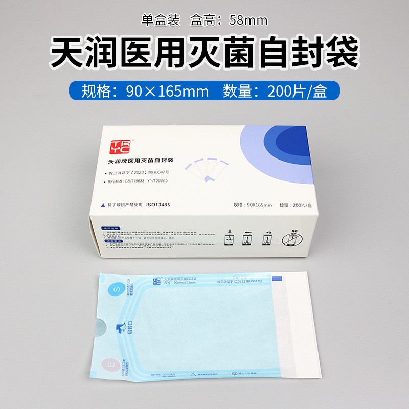 本品为一次性灭菌使用并带有灭菌过程指示的包装用品。产品由聚丙烯和聚酯多层复合膜及一样能够透析纸热压而成。通过指示油墨颜色变化指示灭菌过程(带有高温高压蒸汽灭菌及环氧乙烷灭菌指示标志)。采用热封三道边设计,防爆边,确保灭菌安全;适用于压力蒸汽和环氧乙烷灭菌的医疗器械灭菌包装。医院、门诊灭菌包装;美容用品使用前的消毒;实验室用品的灭菌包装;家庭高温消毒包装。