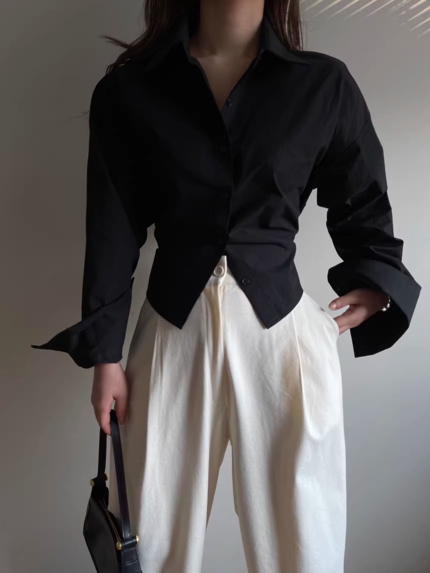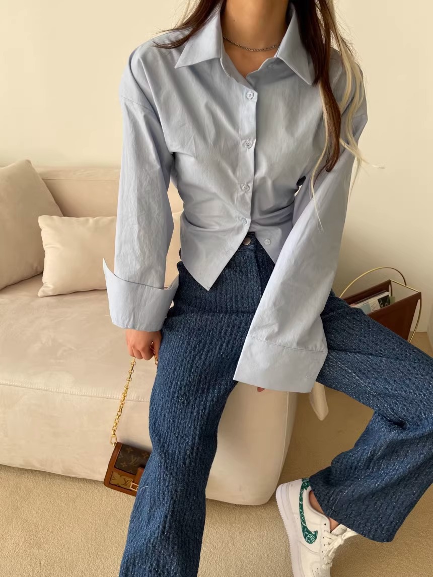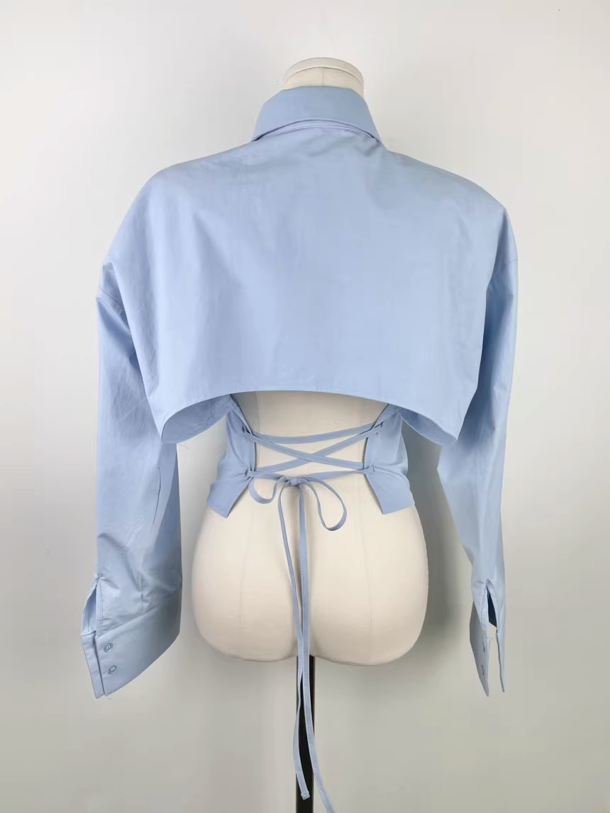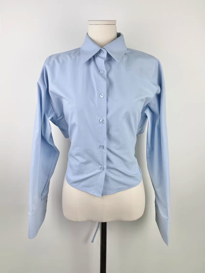 한국 봄 새로운 디자인 센스 틈새 우아한 백 스트랩 탑 슬림 핏 슬리밍 긴 소매 셔츠