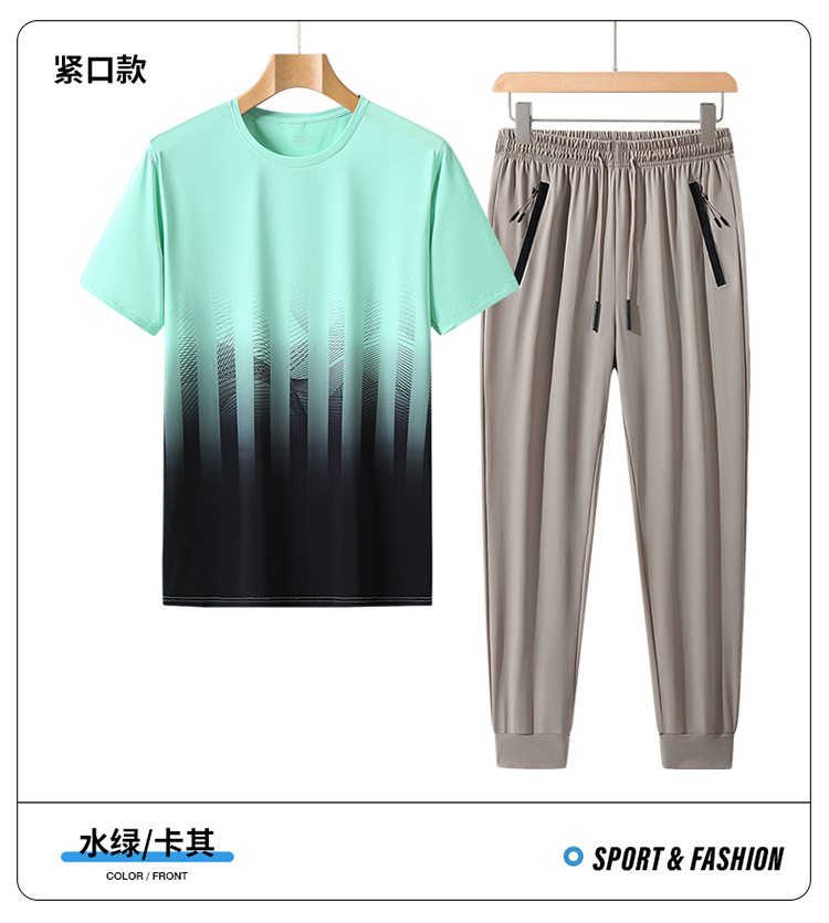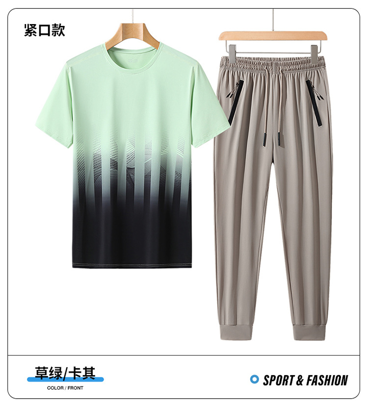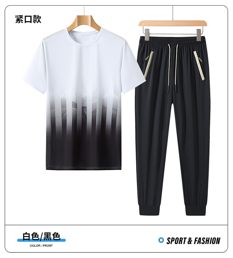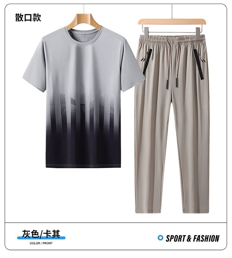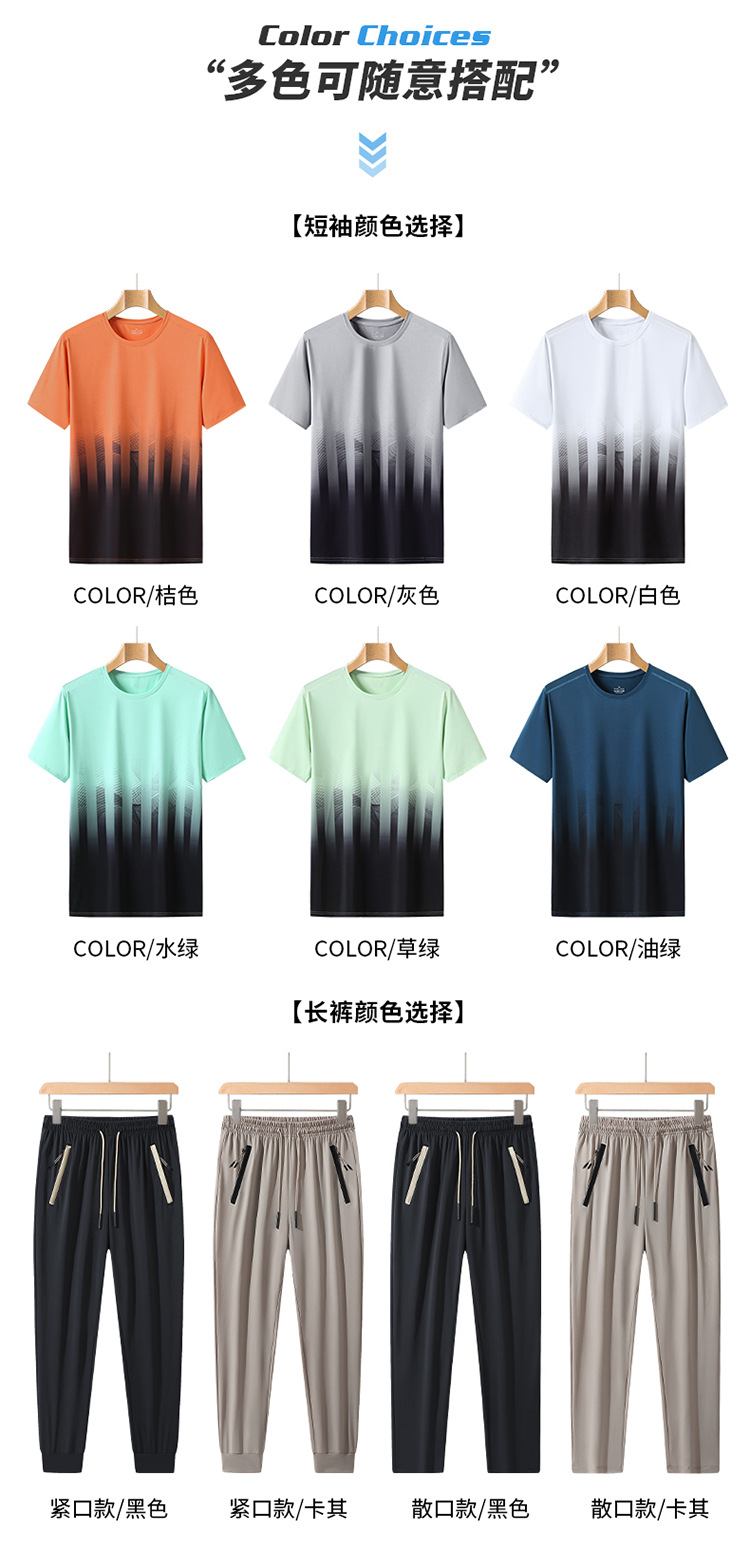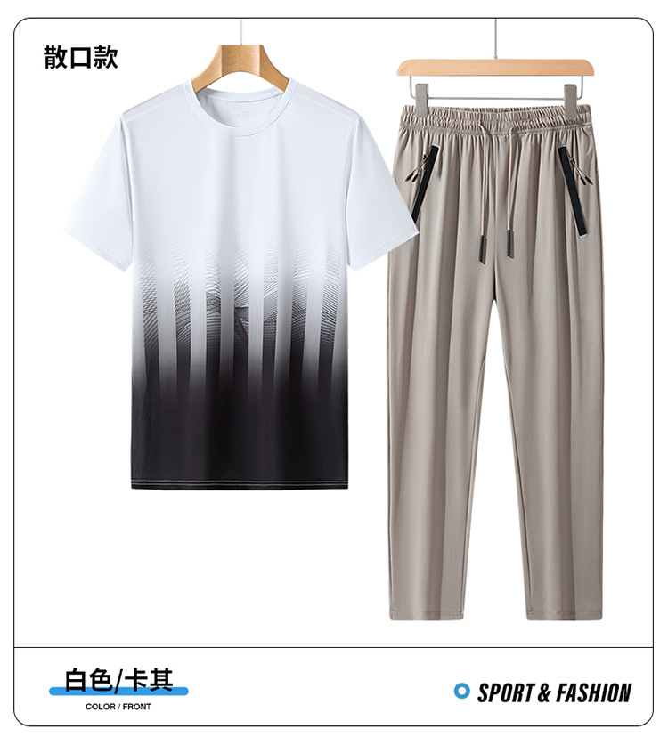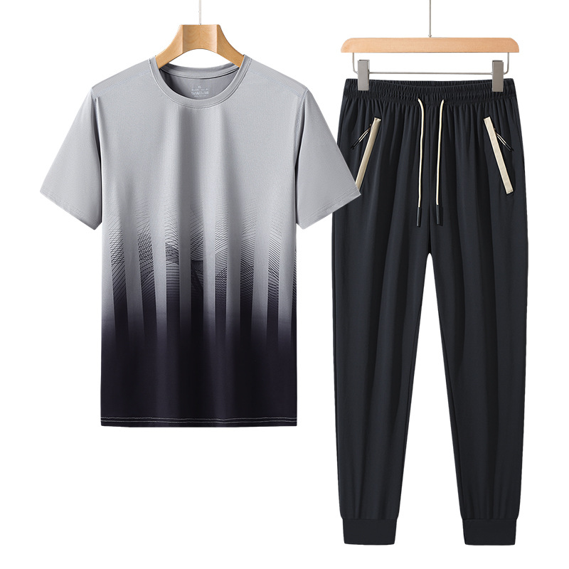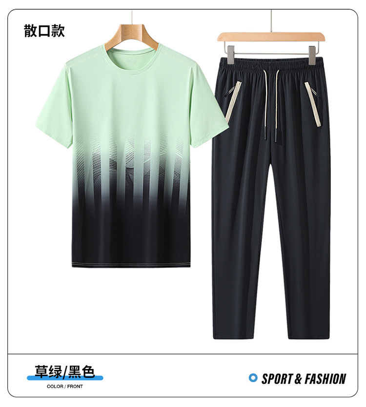 L-8XL 여름 아이스 실크 세트 남성용 얇은 지방 스포츠 세트 그라디언트 짧은 소매 빠른 건조 캐주얼 바지 플러스 사이즈