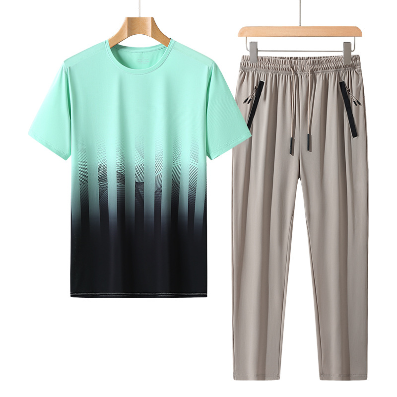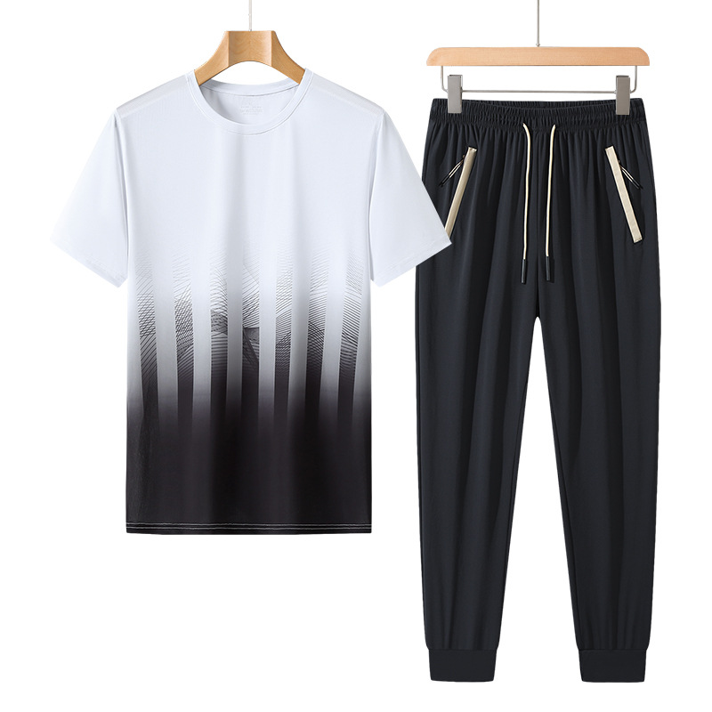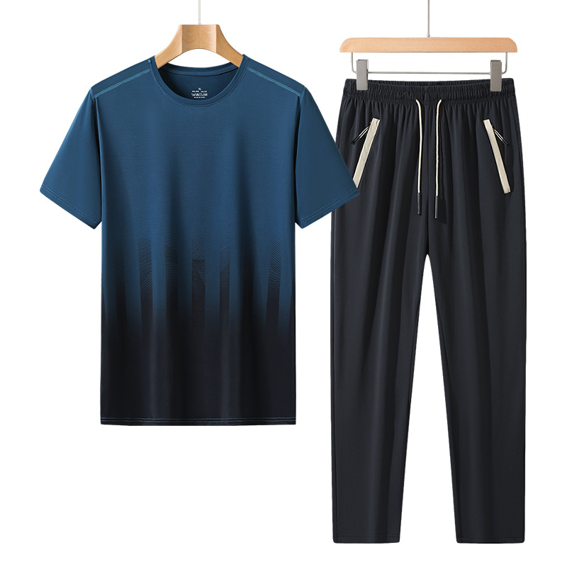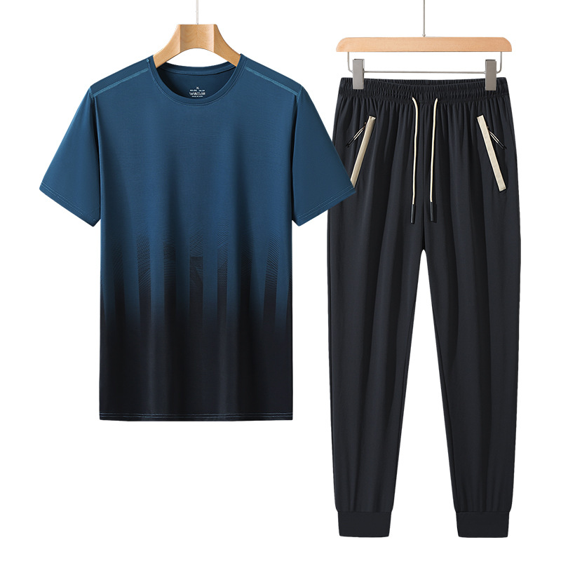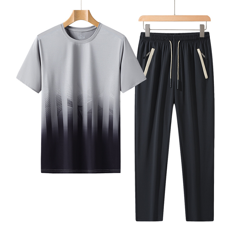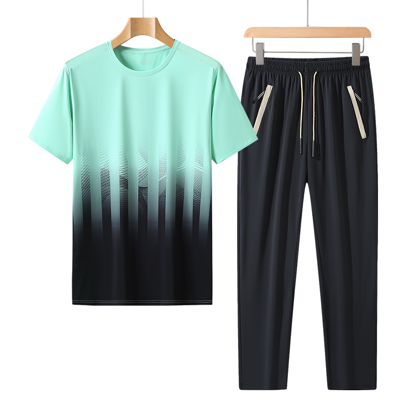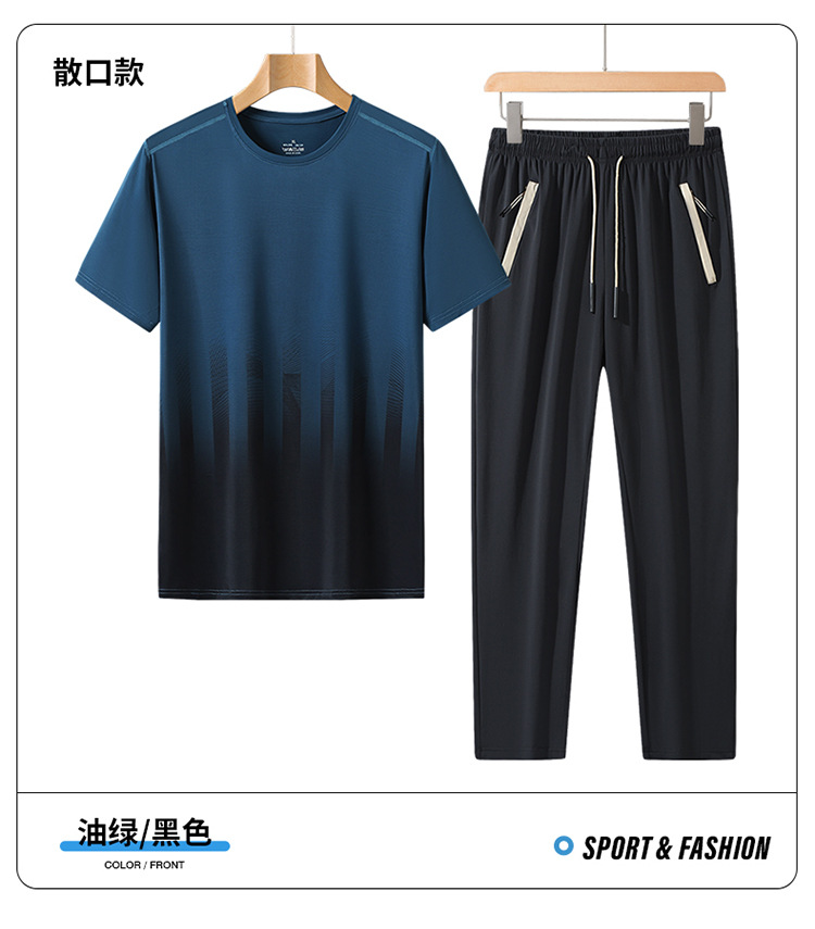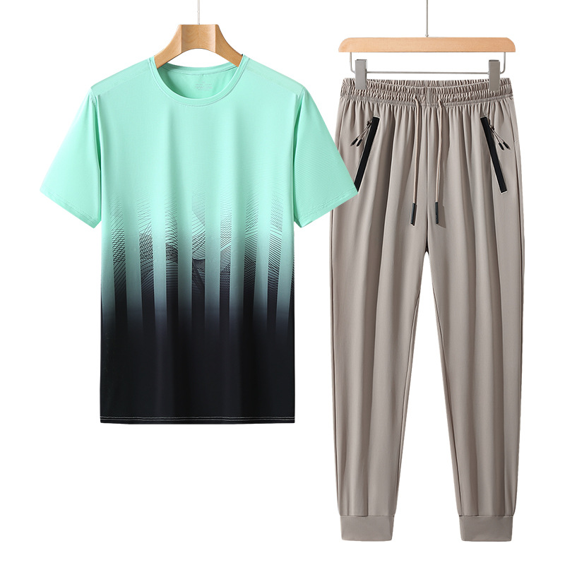 L-8XL 여름 아이스 실크 세트 남성용 얇은 지방 스포츠 세트 그라디언트 짧은 소매 빠른 건조 캐주얼 바지 플러스 사이즈