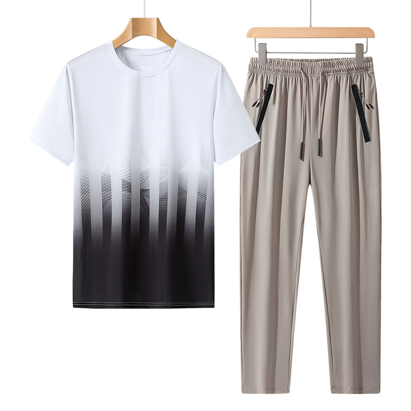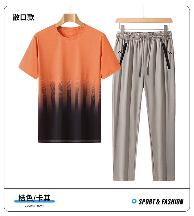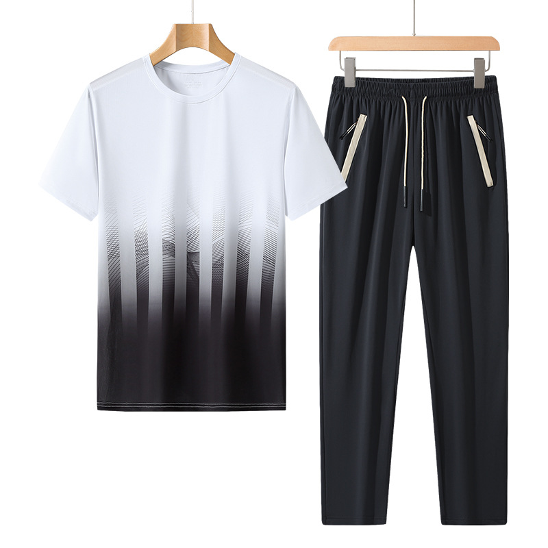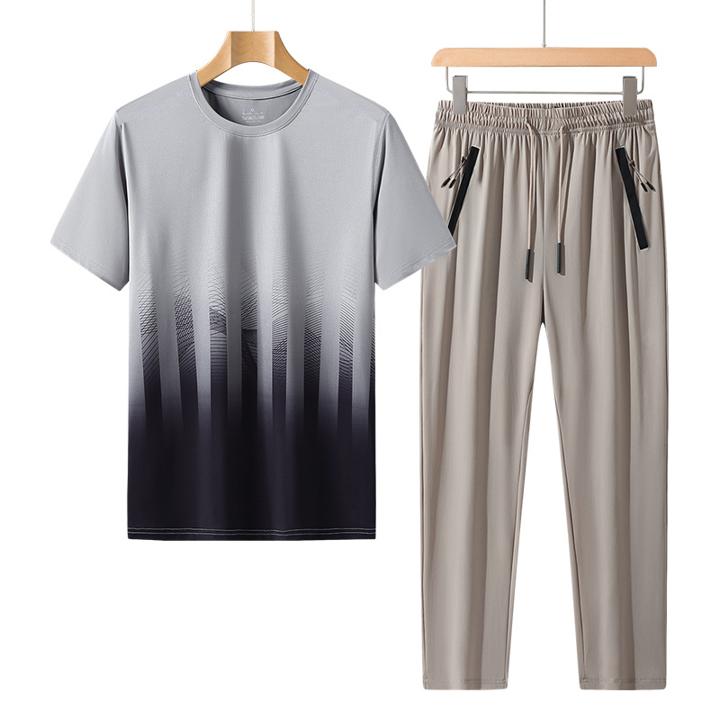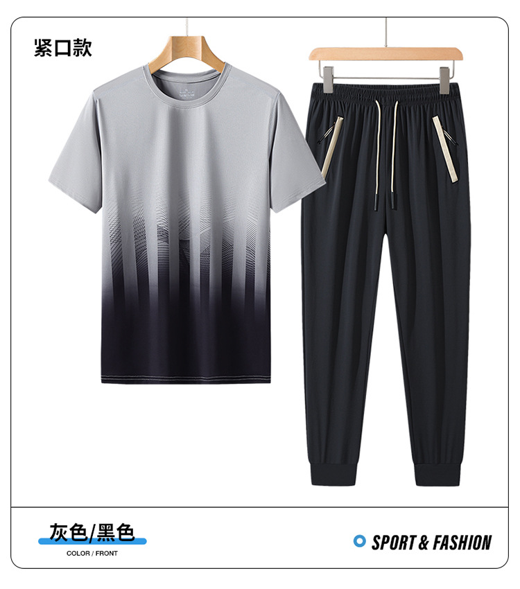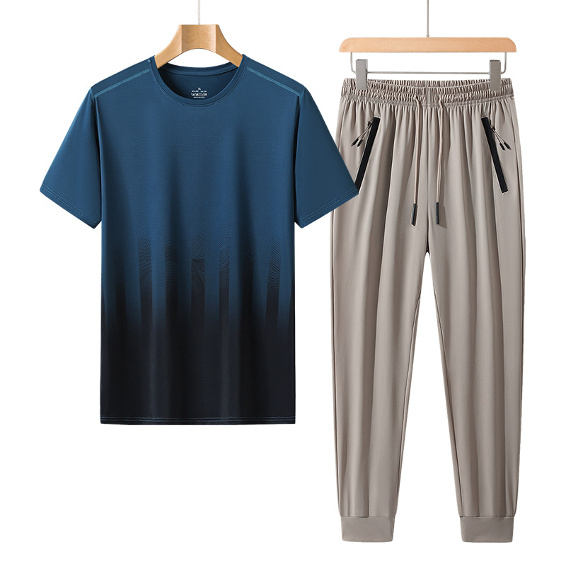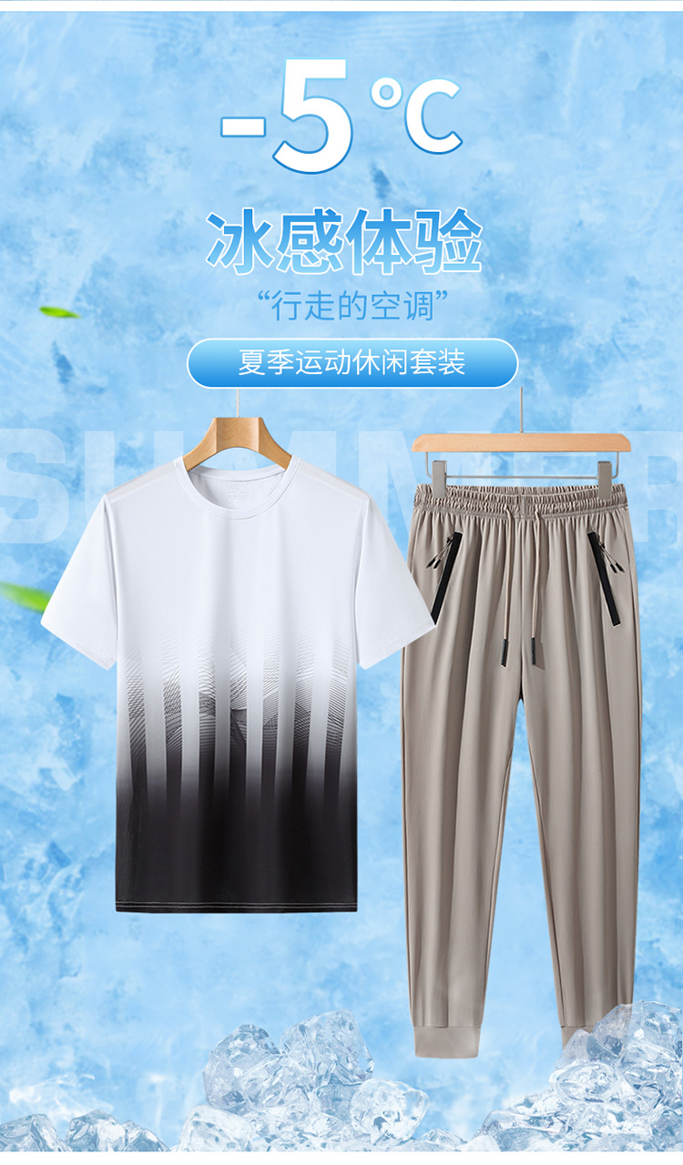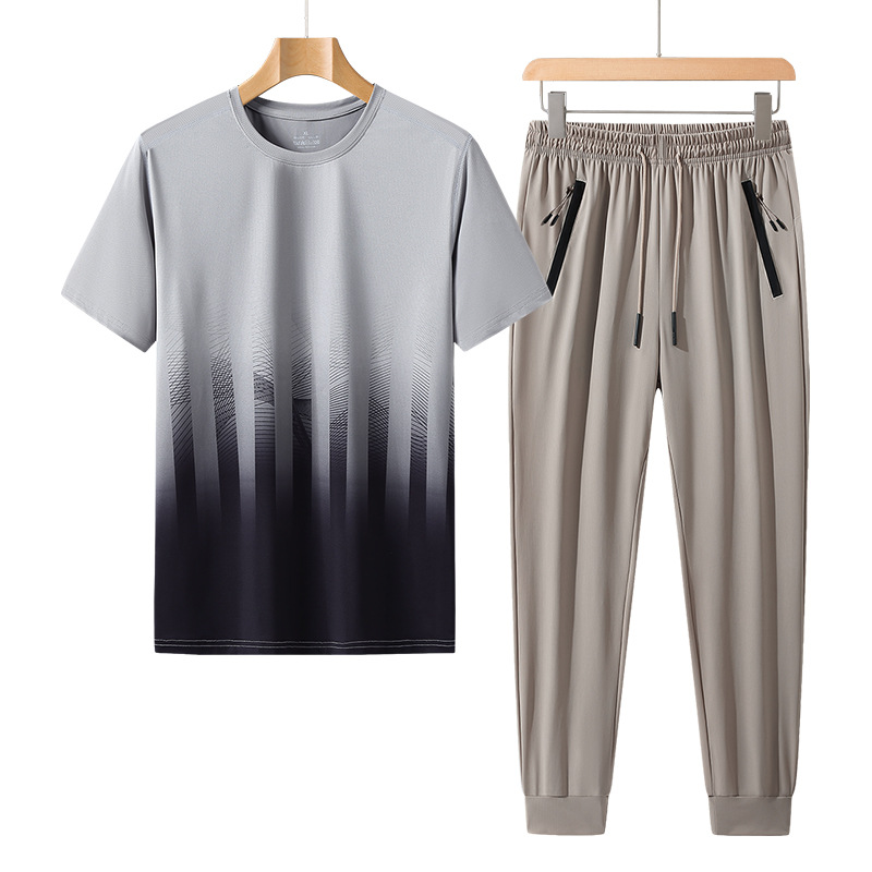 L-8XL 여름 아이스 실크 세트 남성용 얇은 지방 스포츠 세트 그라디언트 짧은 소매 빠른 건조 캐주얼 바지 플러스 사이즈