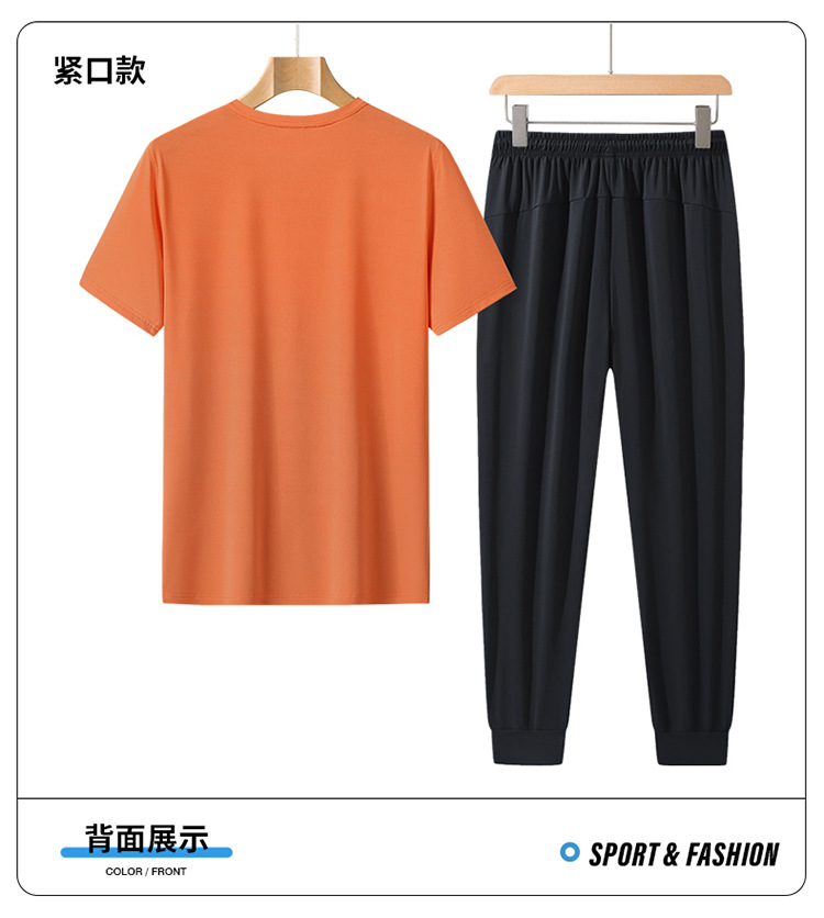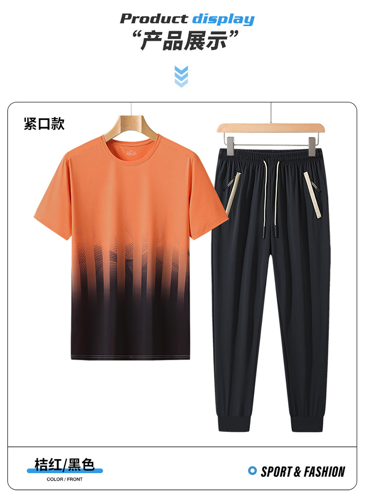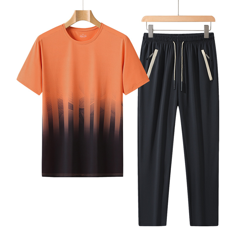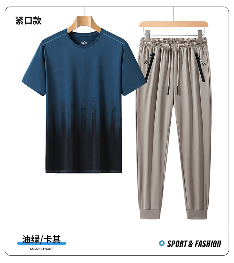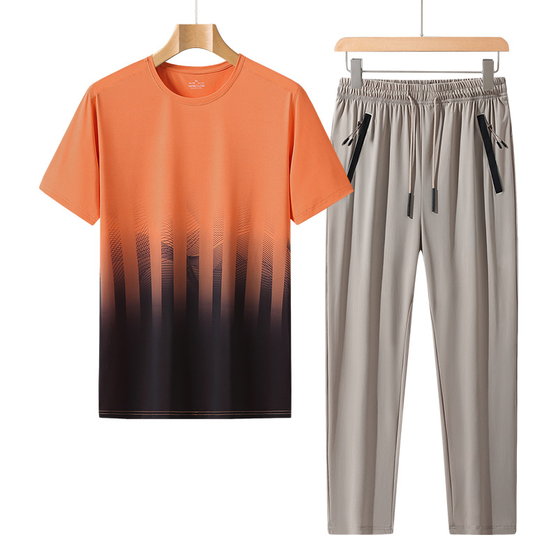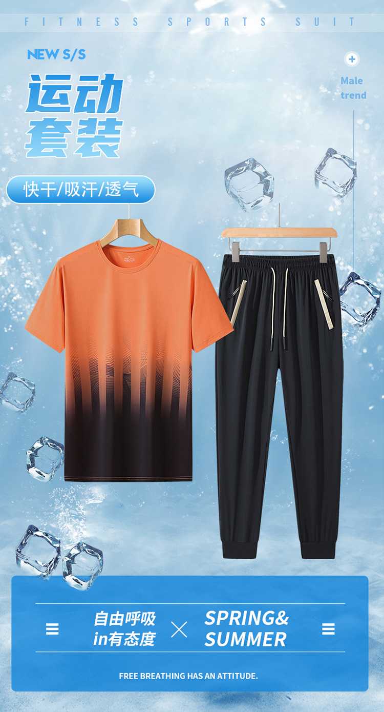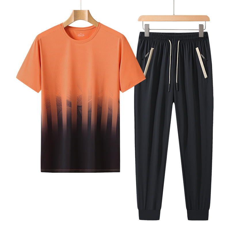 L-8XL 여름 아이스 실크 세트 남성용 얇은 지방 스포츠 세트 그라디언트 짧은 소매 빠른 건조 캐주얼 바지 플러스 사이즈