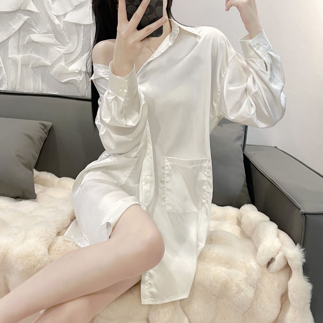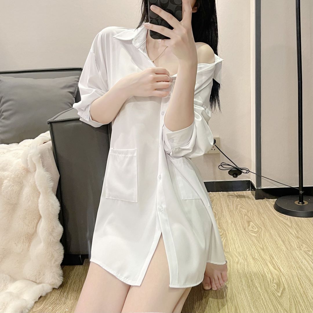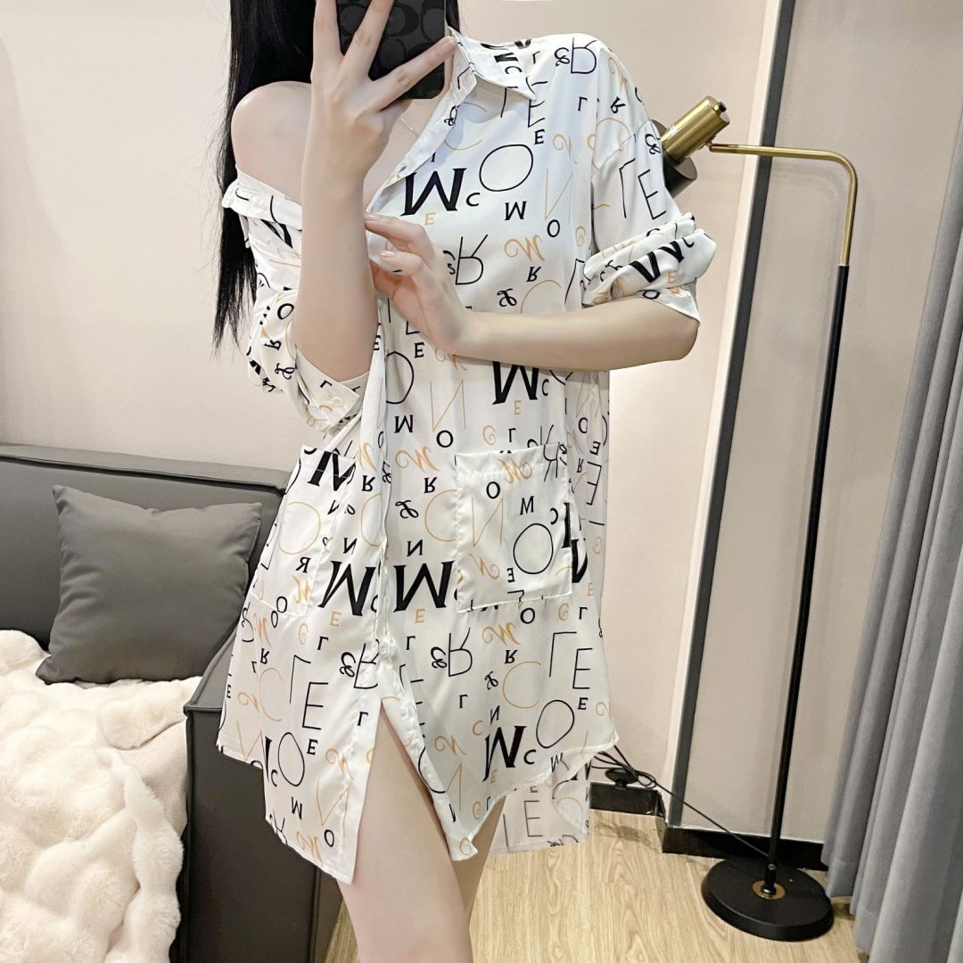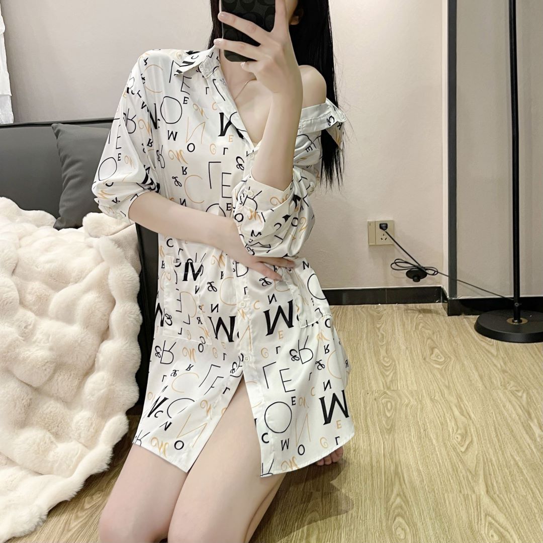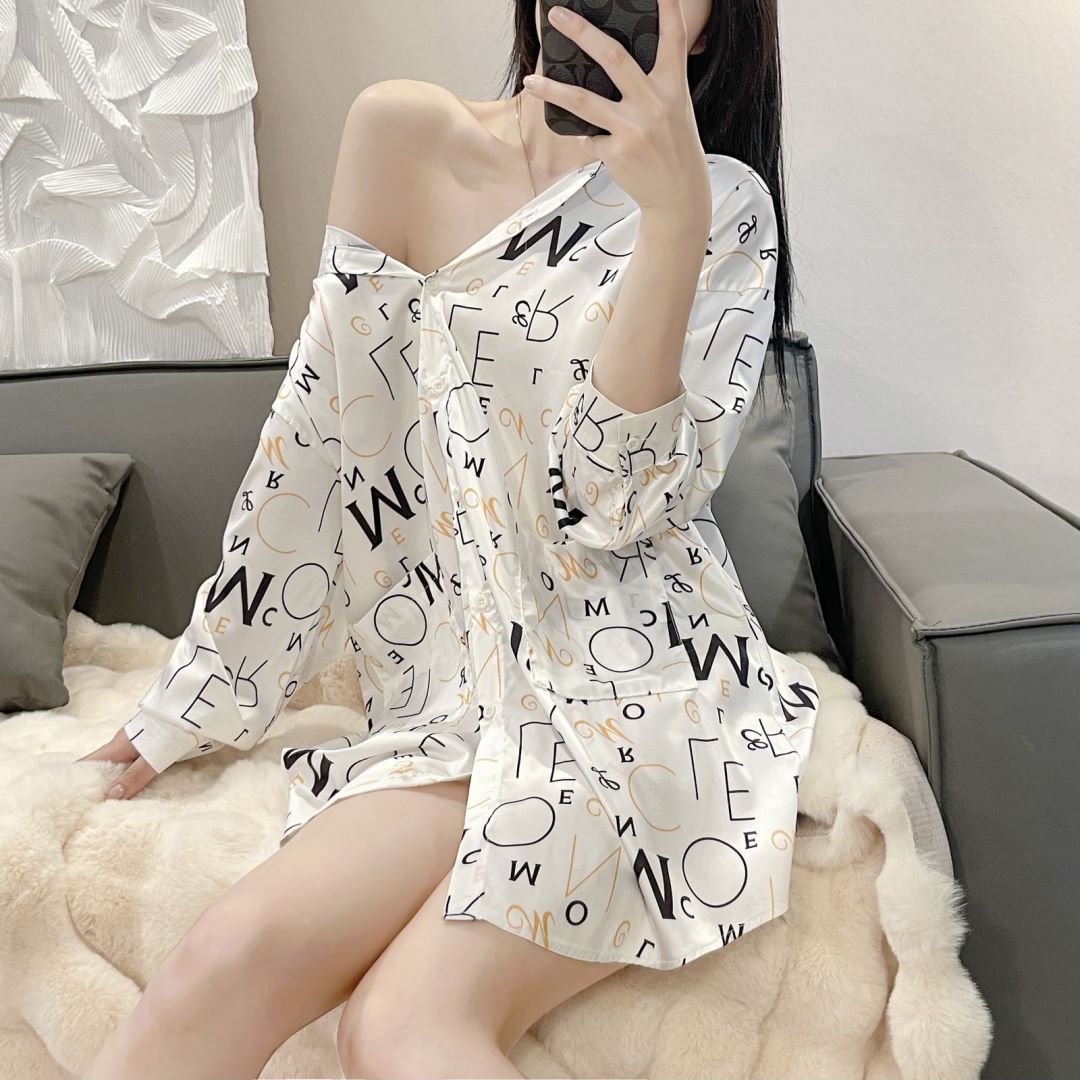 개인 잠옷 여성의 봄과 가을 섹시한 남자 친구 스타일 셔츠 파자마 여름 느슨한 인쇄 단색 홈 옷을 입고스토어 가기