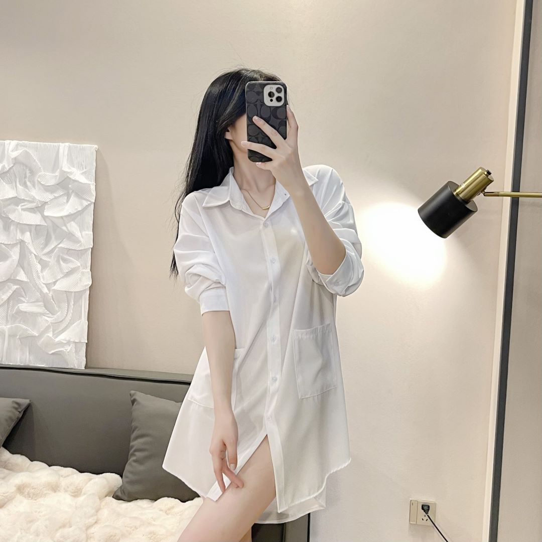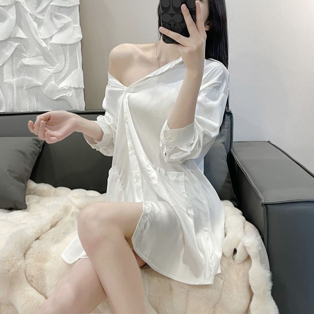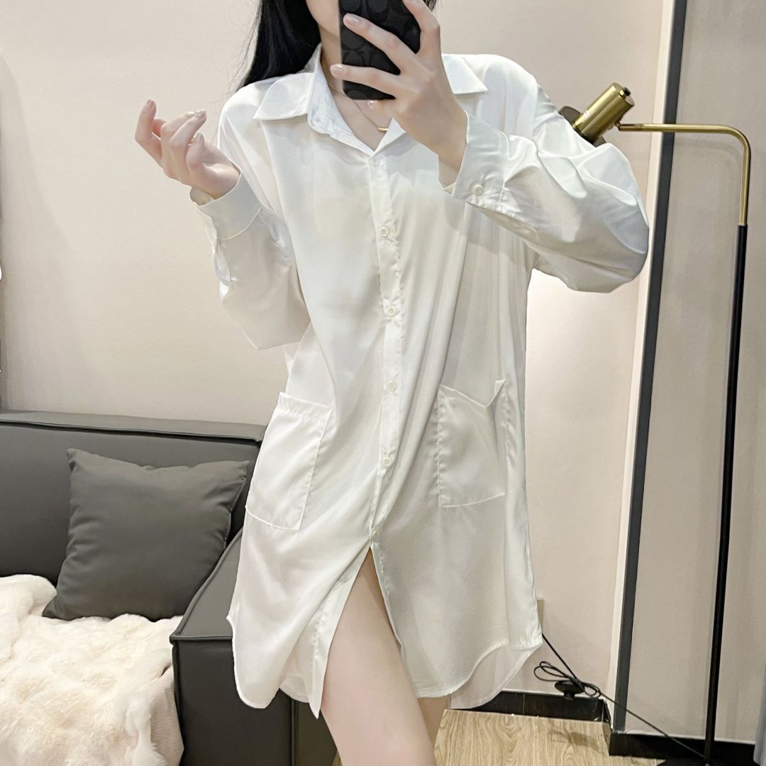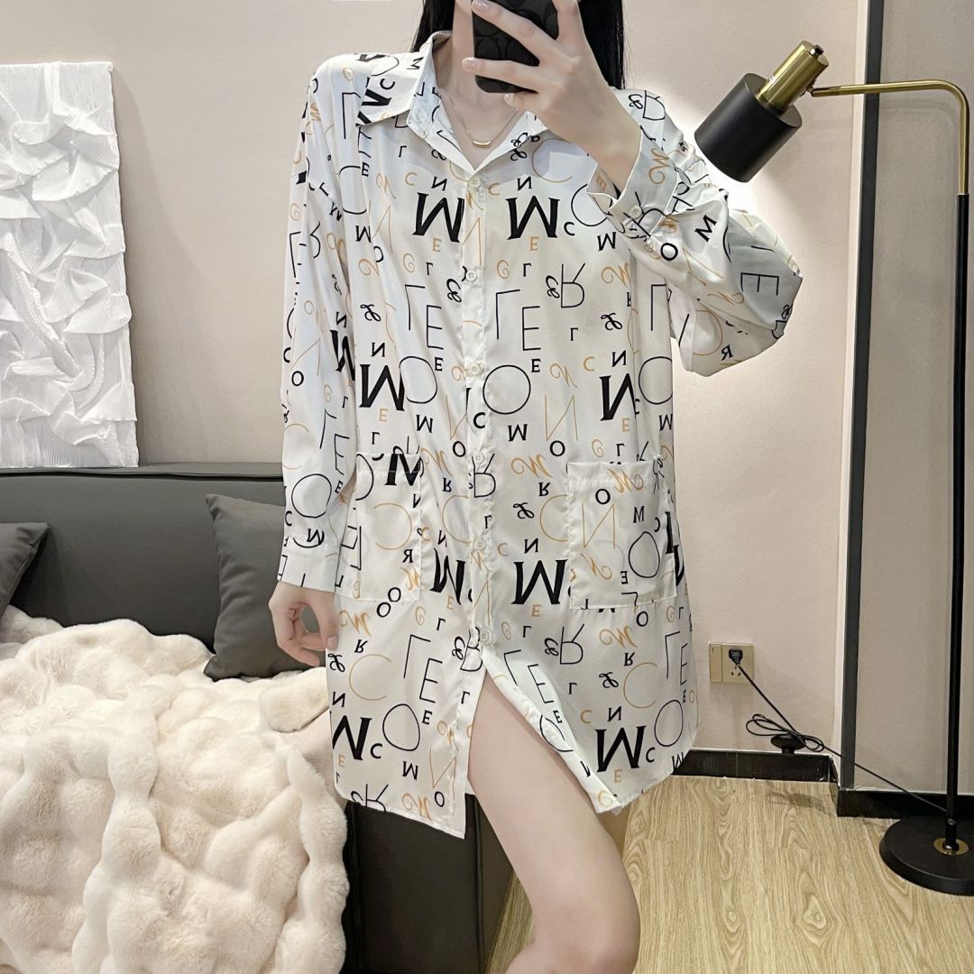 개인 잠옷 여성의 봄과 가을 섹시한 남자 친구 스타일 셔츠 파자마 여름 느슨한 인쇄 단색 홈 옷을 입고스토어 가기