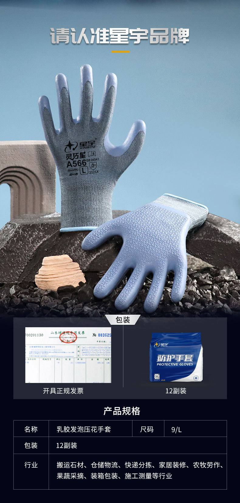 Xingyu 정품 A566 라텍스 장갑 건설 현장 건설 공장 작업 물류 취급 내마모성 미끄럼 방지 노동 장갑스토어 가기