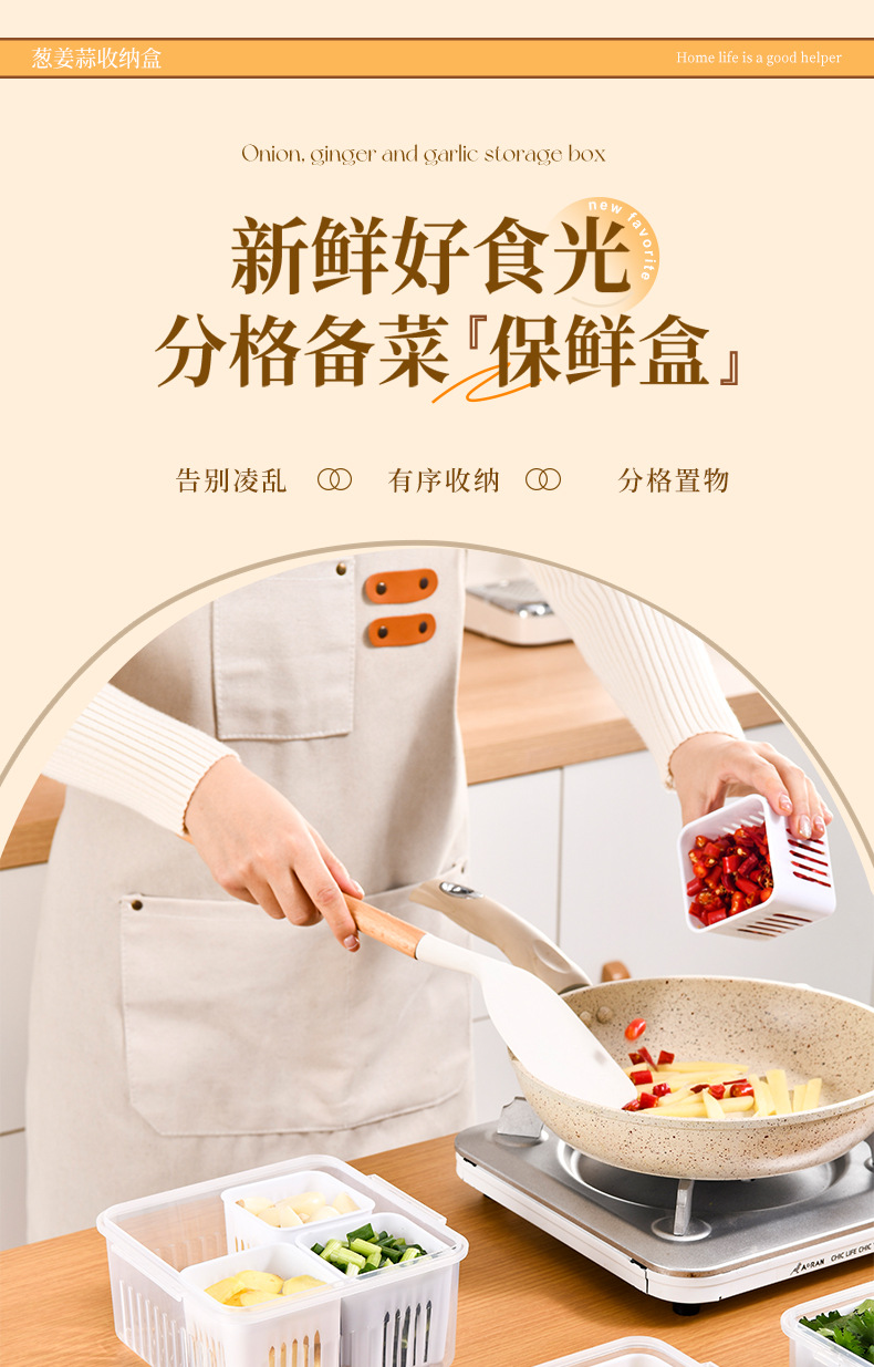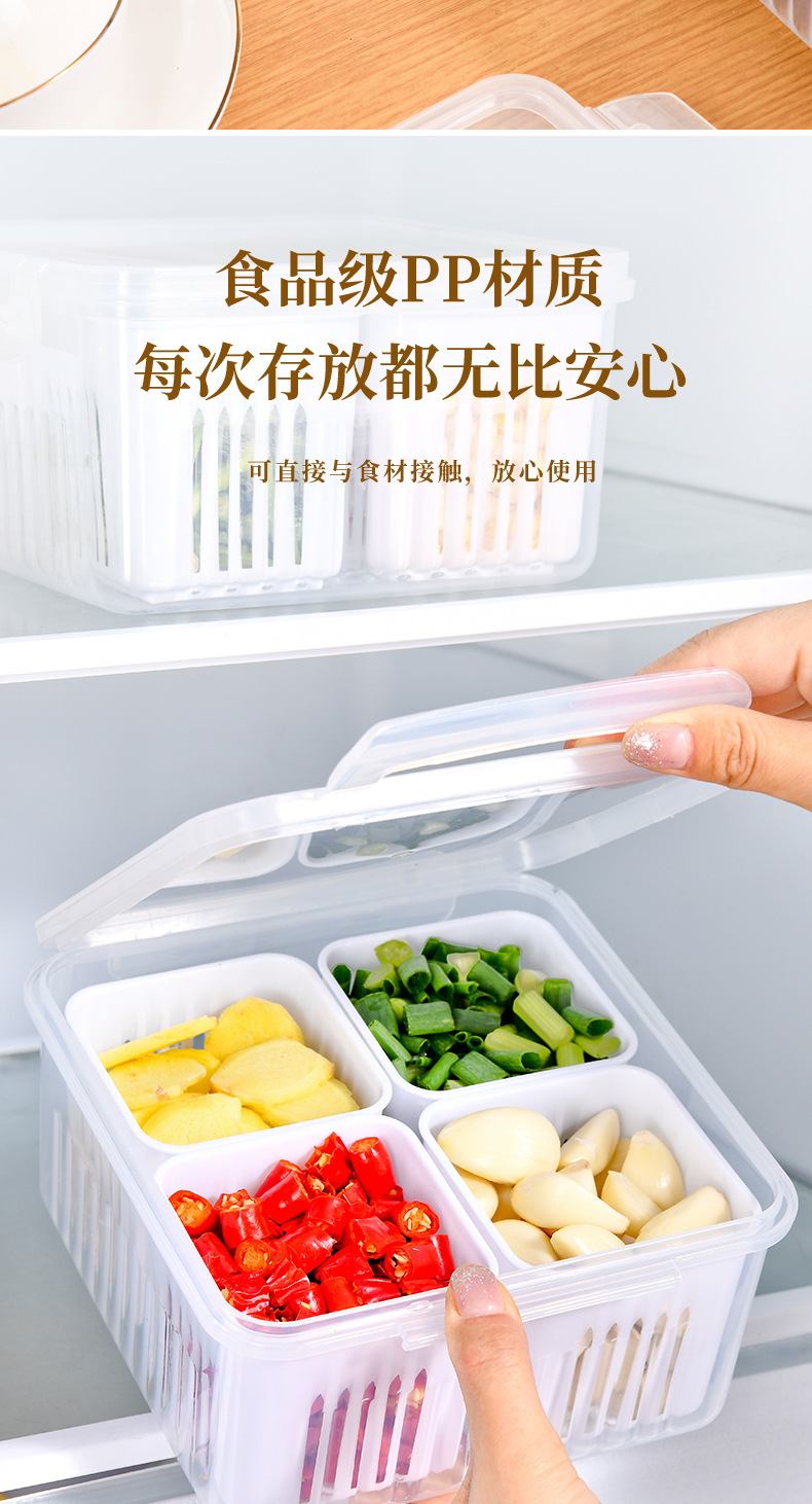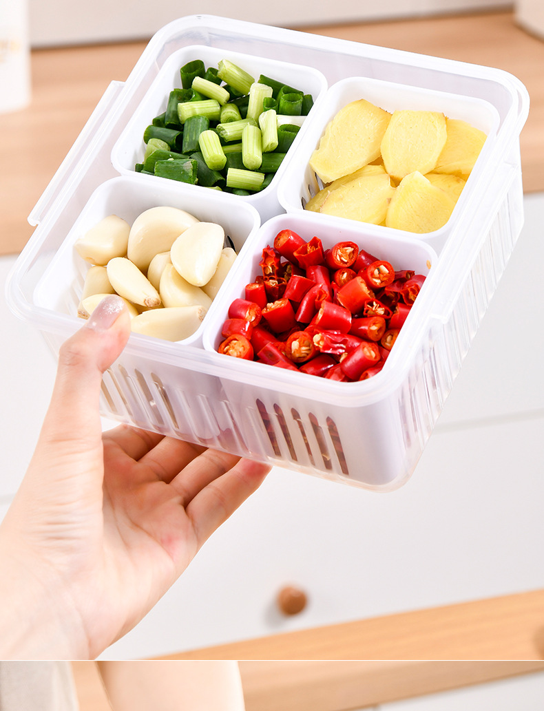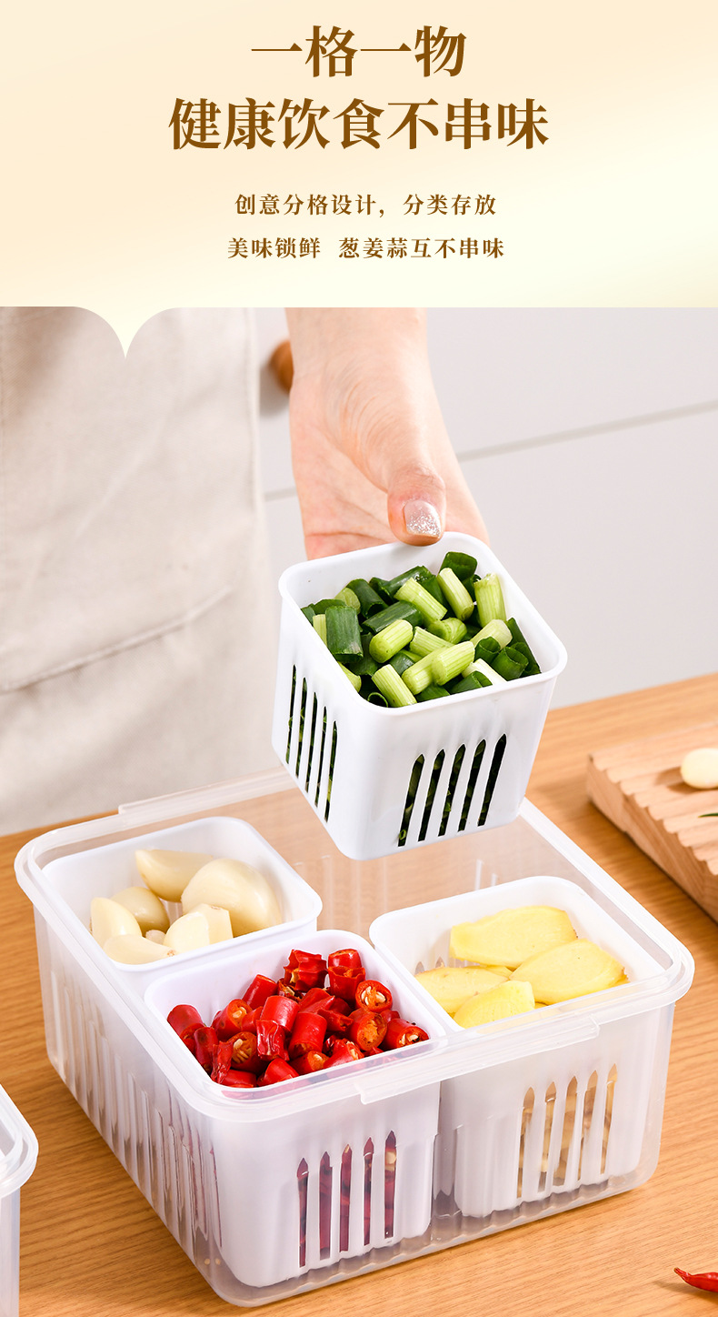 창조적 인 가정용 두피, 생강 및 마늘 저장 상자 다기능 배수 4 칸 신선한 보관 상자 주방 냉장고 보관 상자