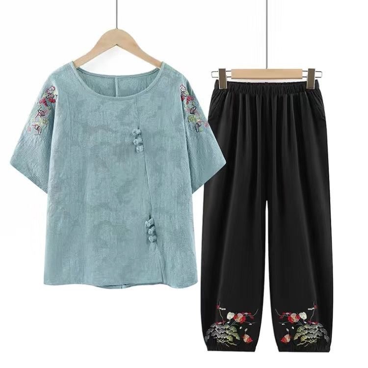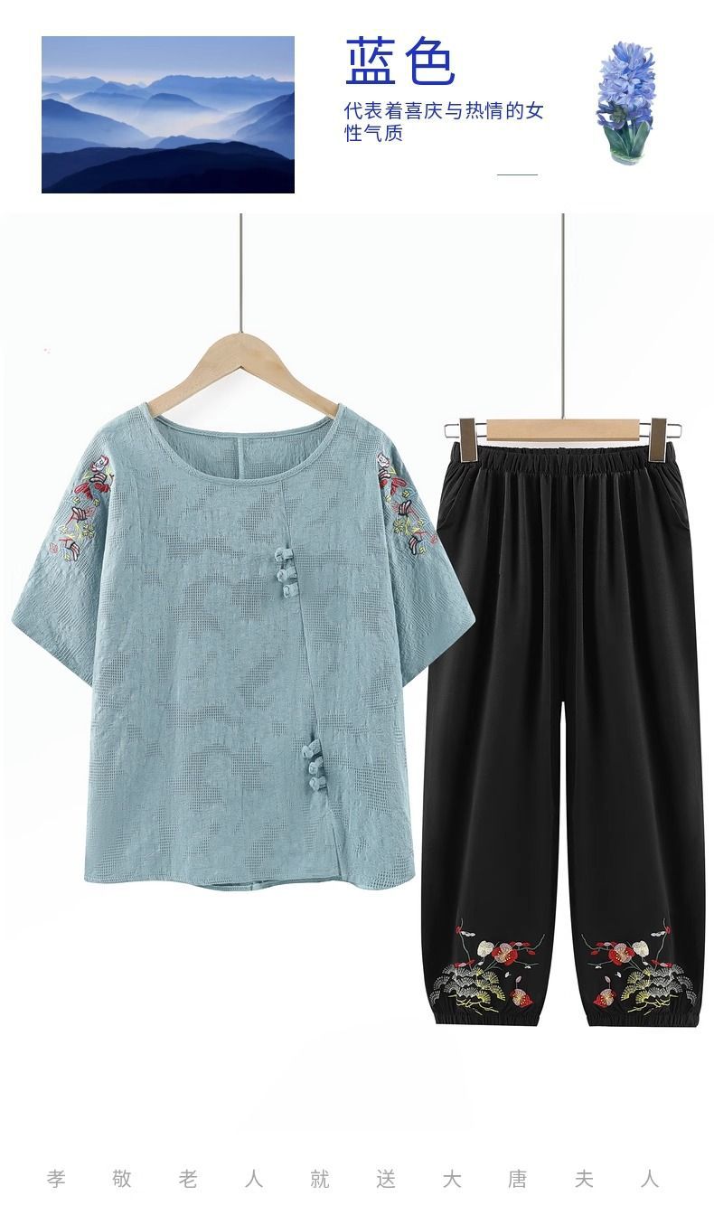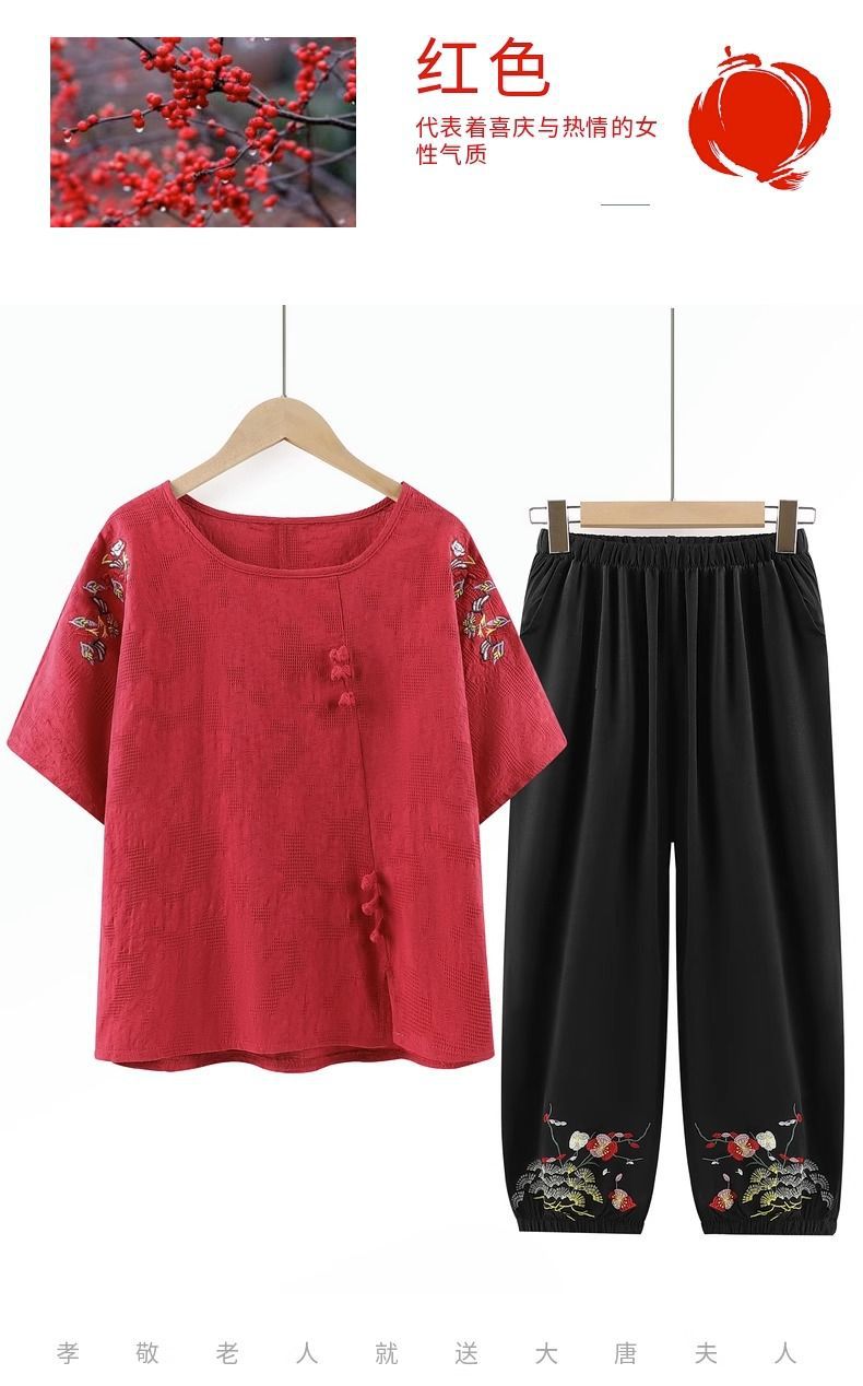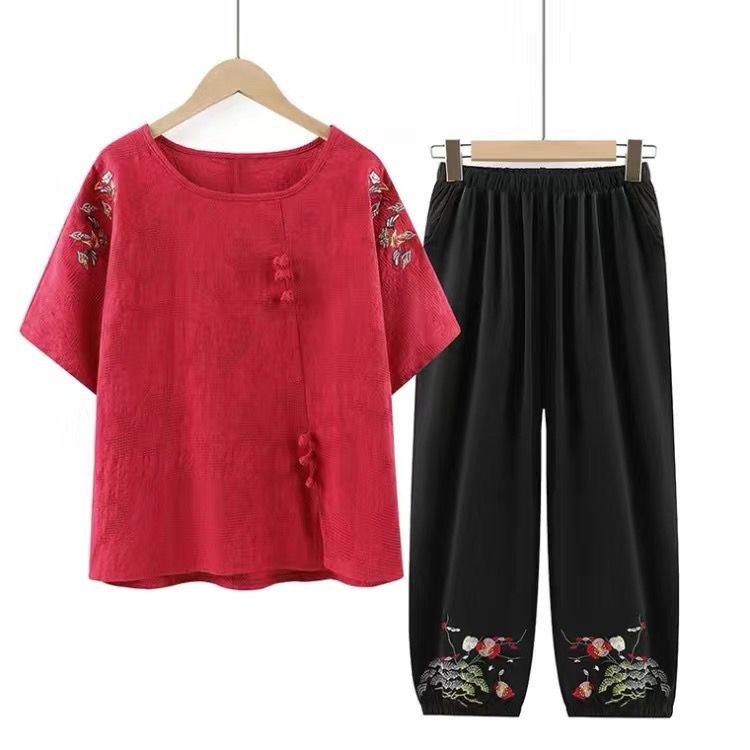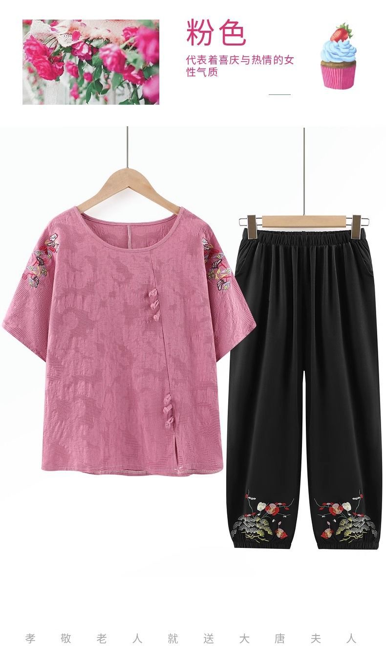 중년 및 노인 할머니 여름 옷 반팔 세트 면화와 린넨 여성 어머니 플러스 사이즈 여름 티셔츠 노인 노인 여성 옷