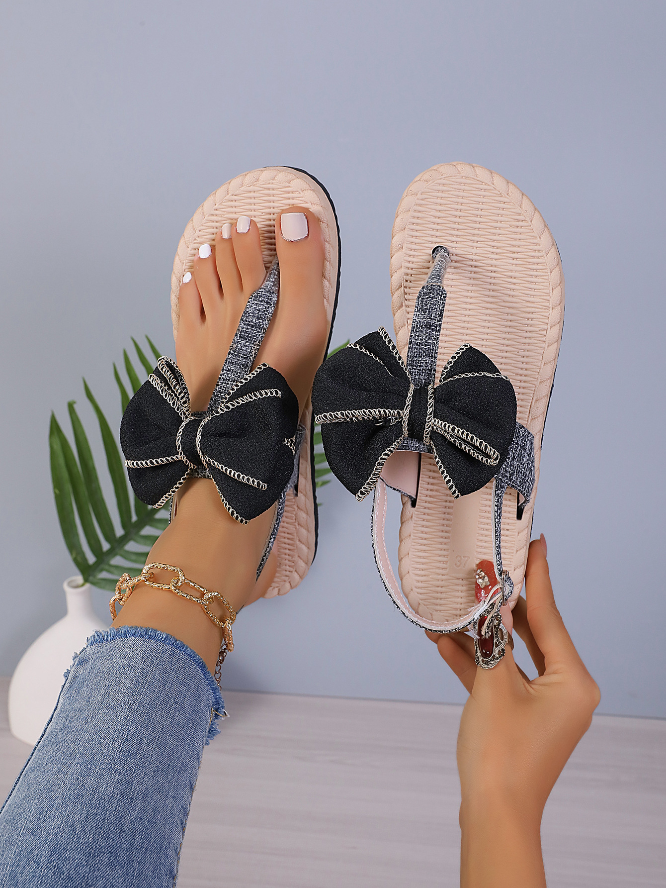 국경 간 플러스 사이즈 샌들 여름 새로운 헤링본 여성 샌들 대마 로프 바닥 발가락 패션 트렌드 보우 샌들 여성스토어 가기