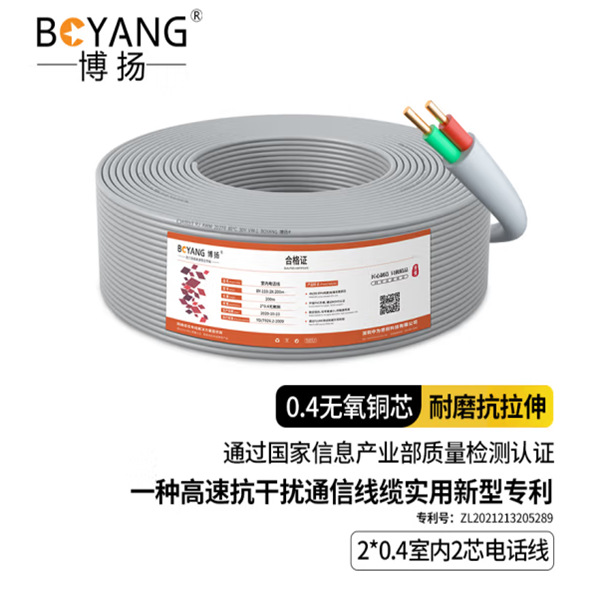 博扬(BOYANG)室内2芯电话线 3类一对无氧铜电缆 2*0.4 RJ11工程语音线缆200米/卷 灰色*1 合格证*1