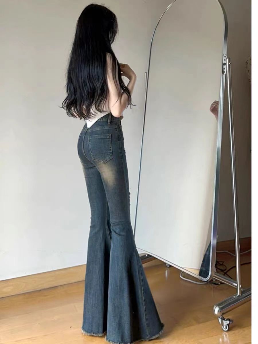Micro-La Jeans 2024 여름 새로운 여성의 높은 허리 블루 슬림 찢어진 뿔 말굽 트렌디 인스토어 가기