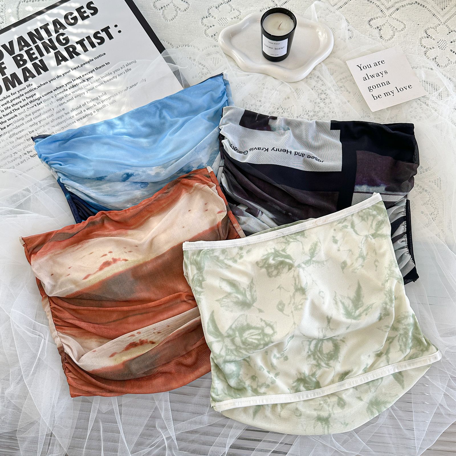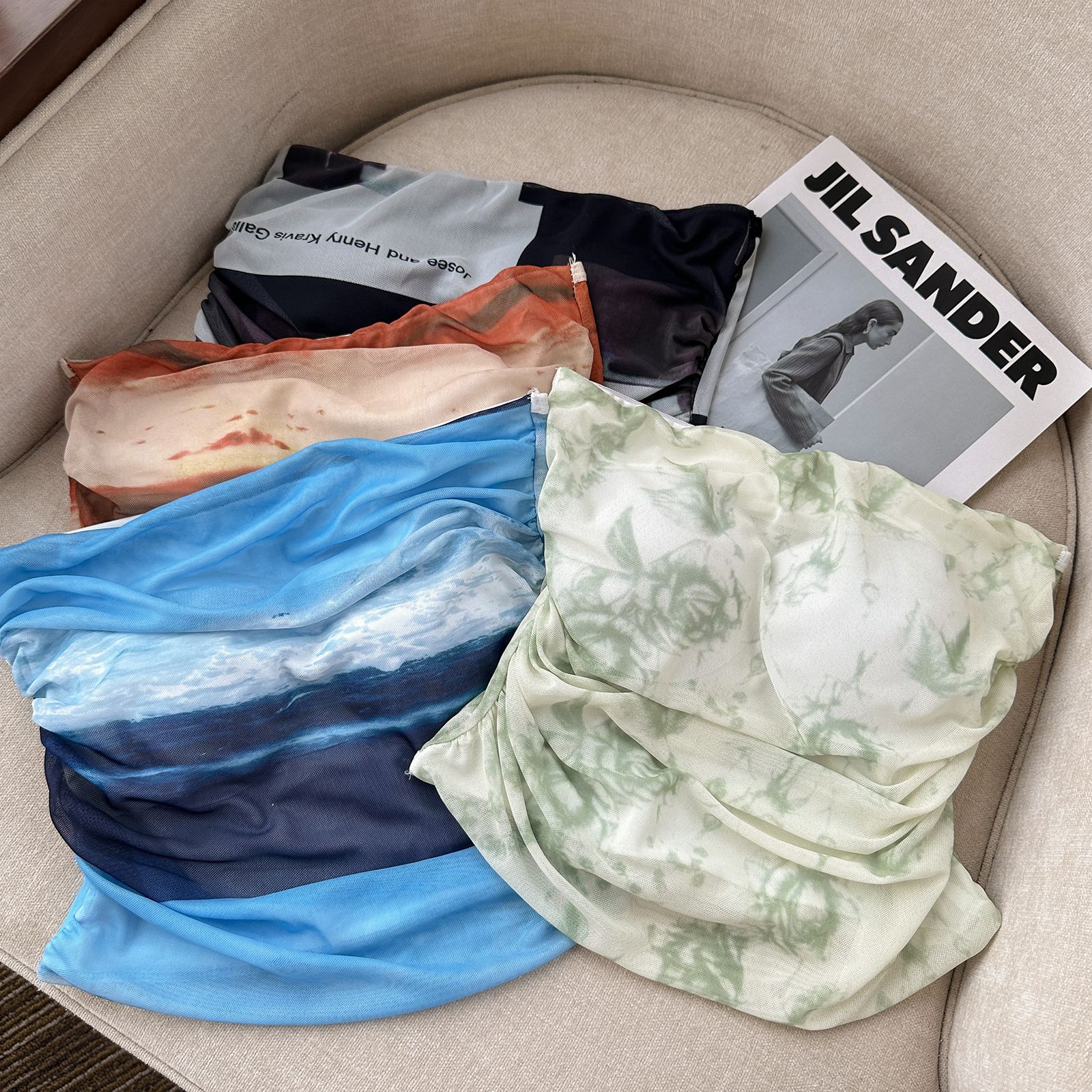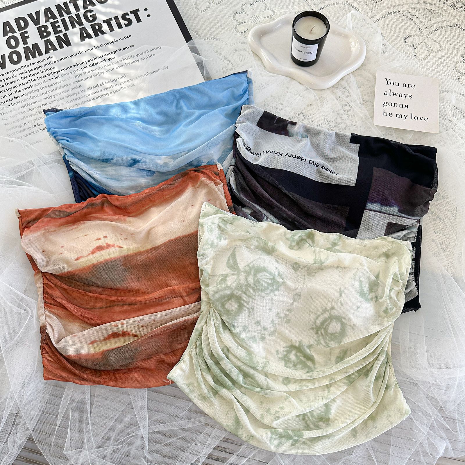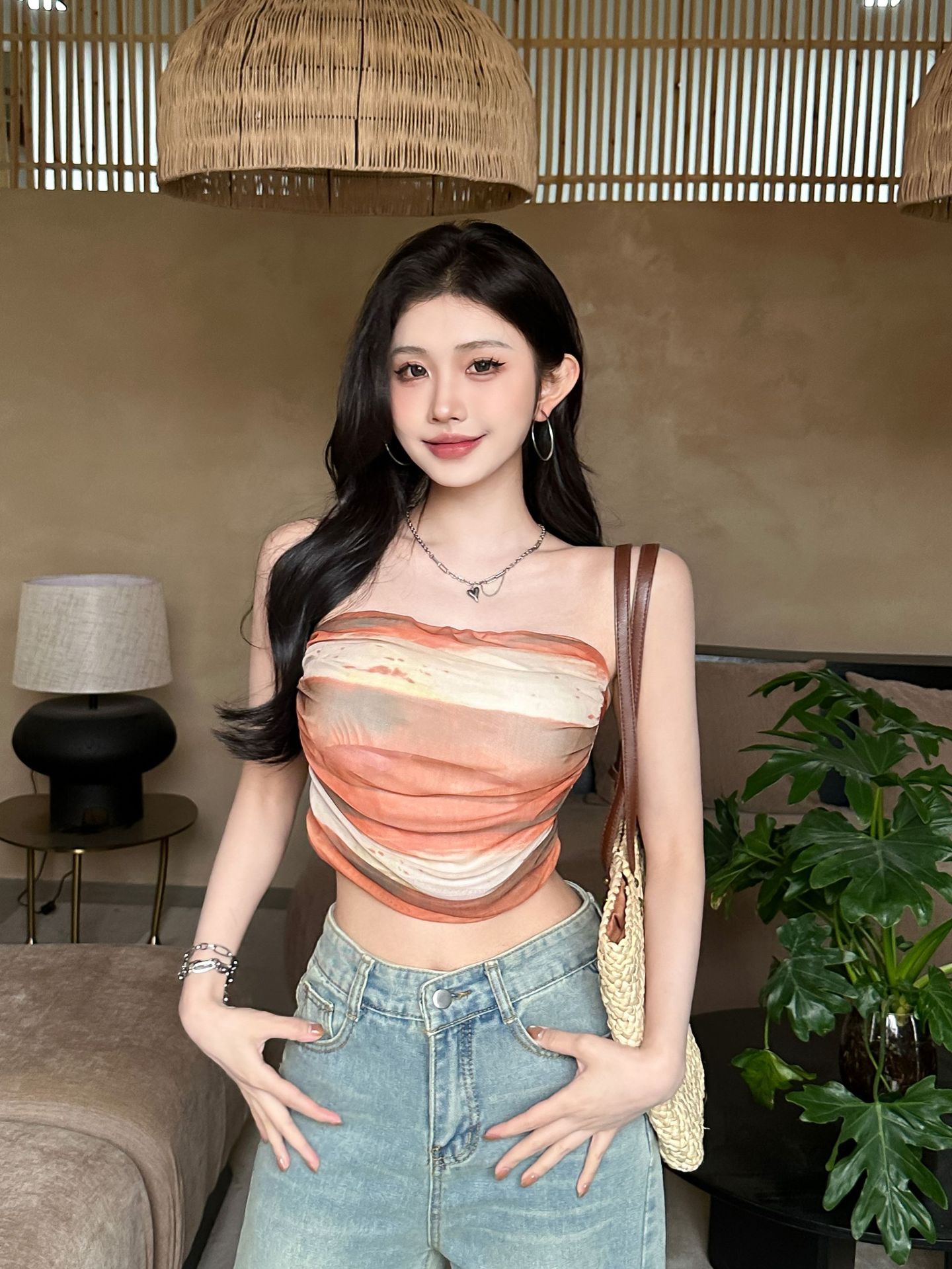 2024 년 봄과 여름 달콤한 쿨 스파이스 소녀 조끼 여성 한 단어 지갑 seine Pleated Tie-dye 인쇄 가슴 랩 올 매치 탑 조끼