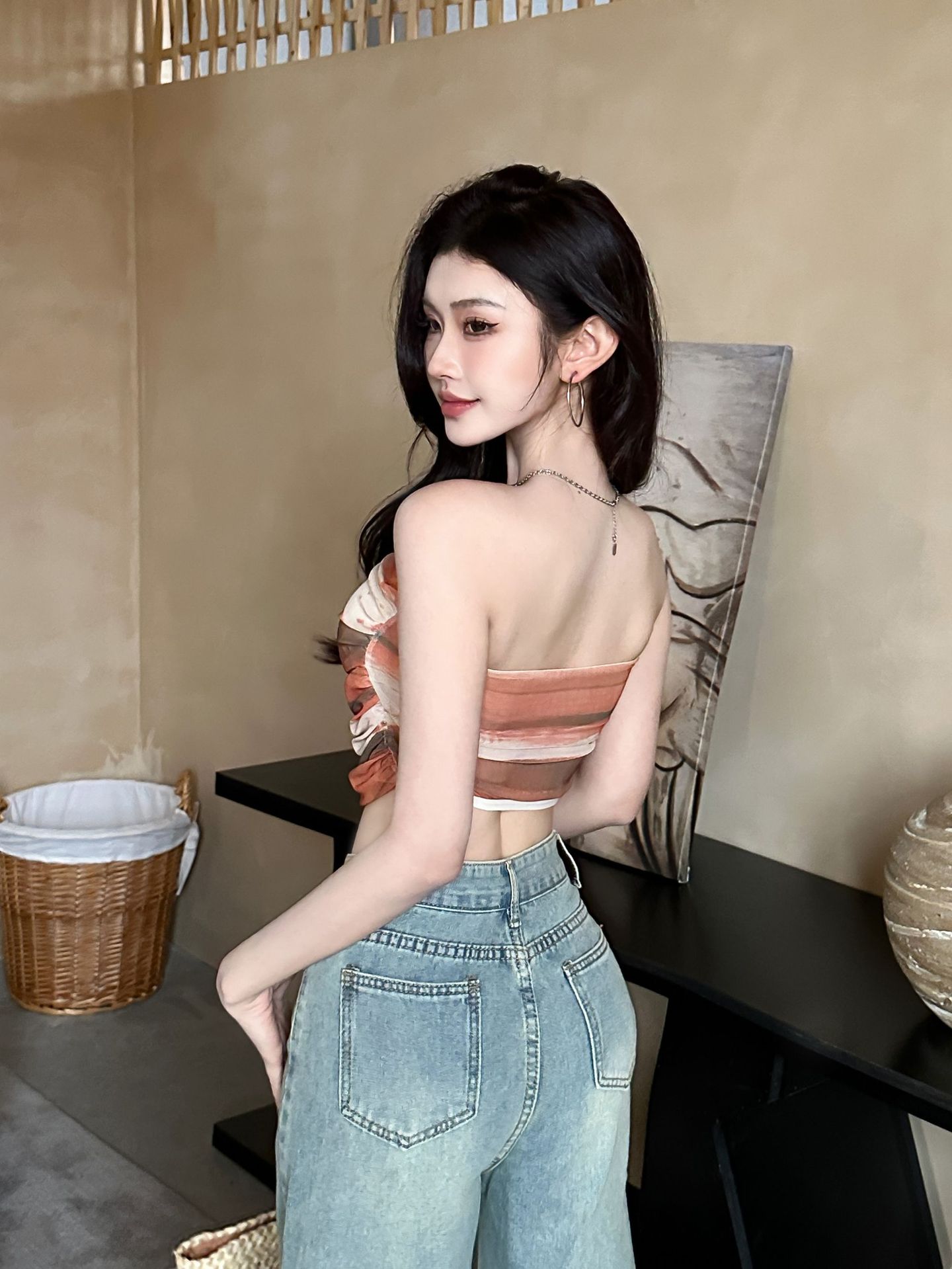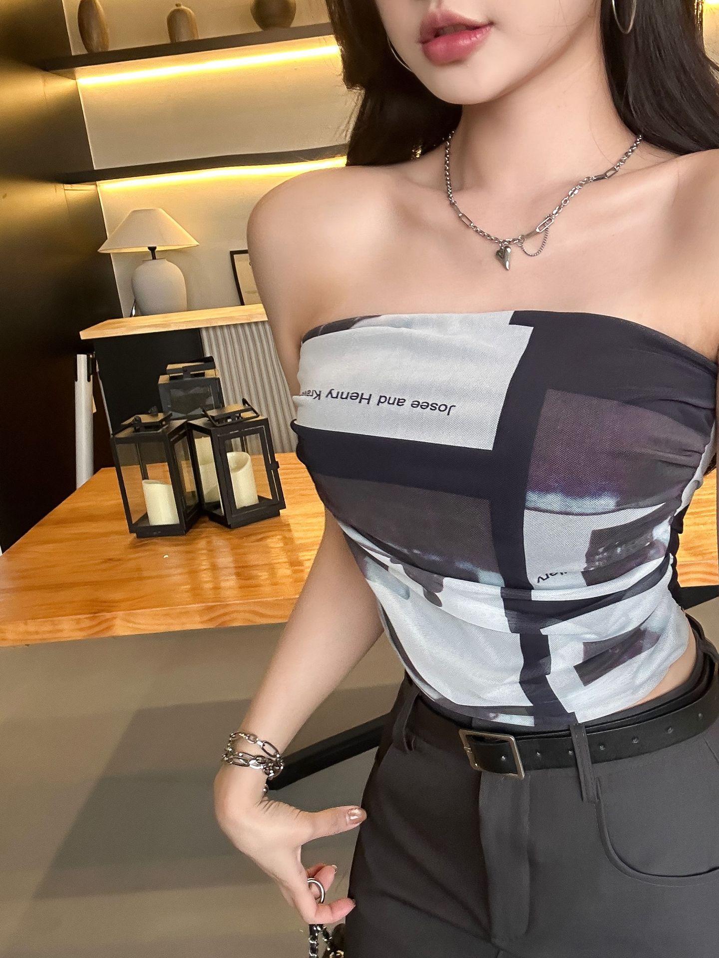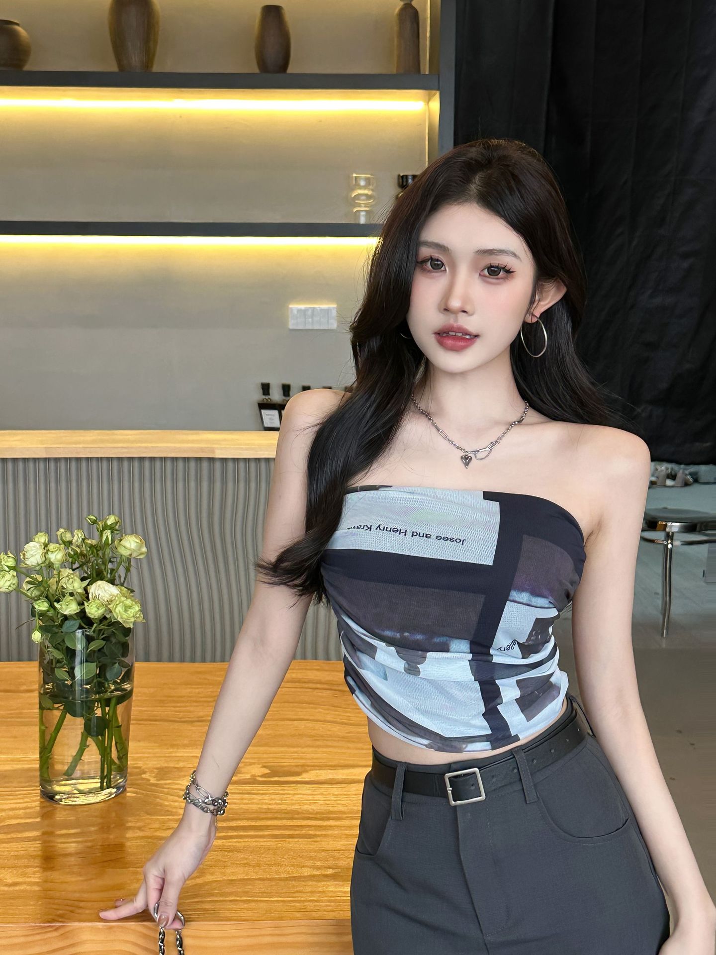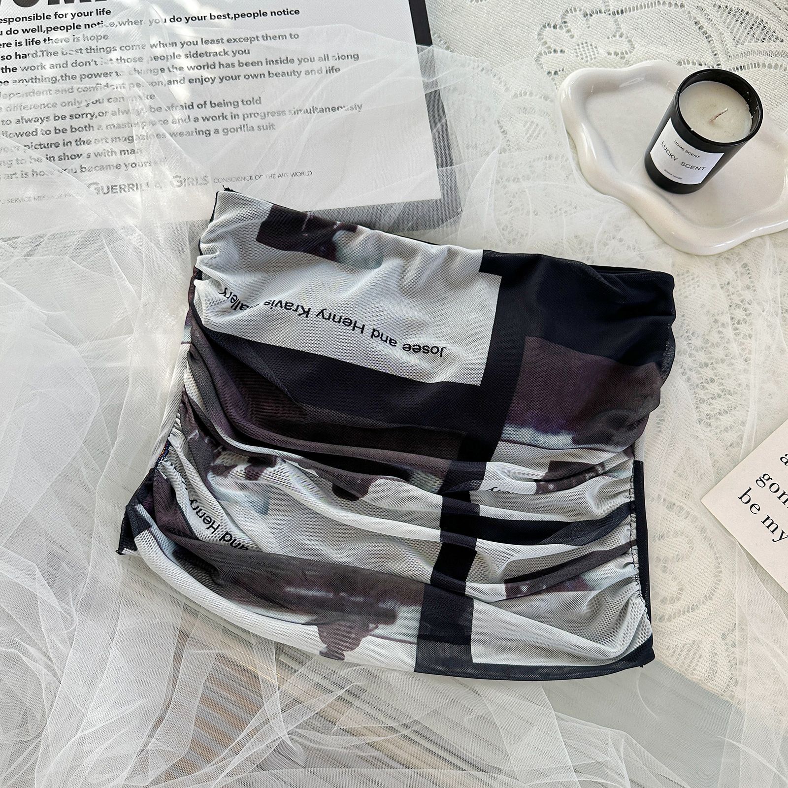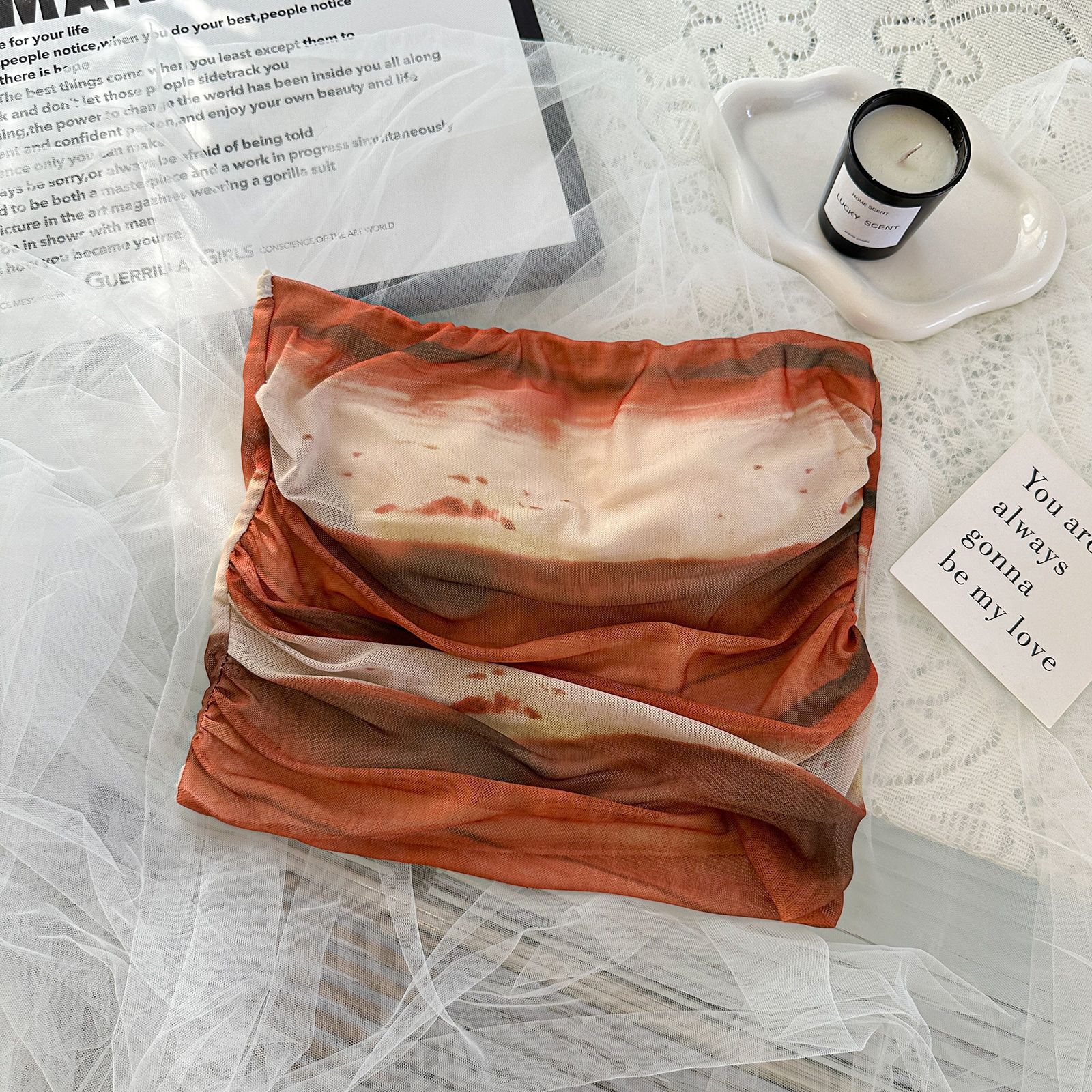 2024 년 봄과 여름 달콤한 쿨 스파이스 소녀 조끼 여성 한 단어 지갑 seine Pleated Tie-dye 인쇄 가슴 랩 올 매치 탑 조끼