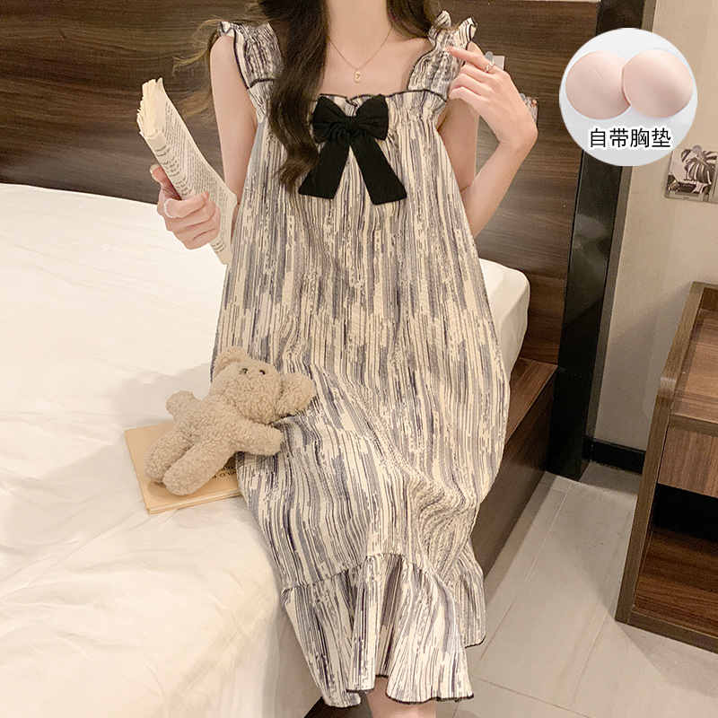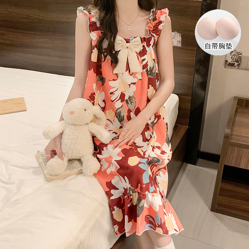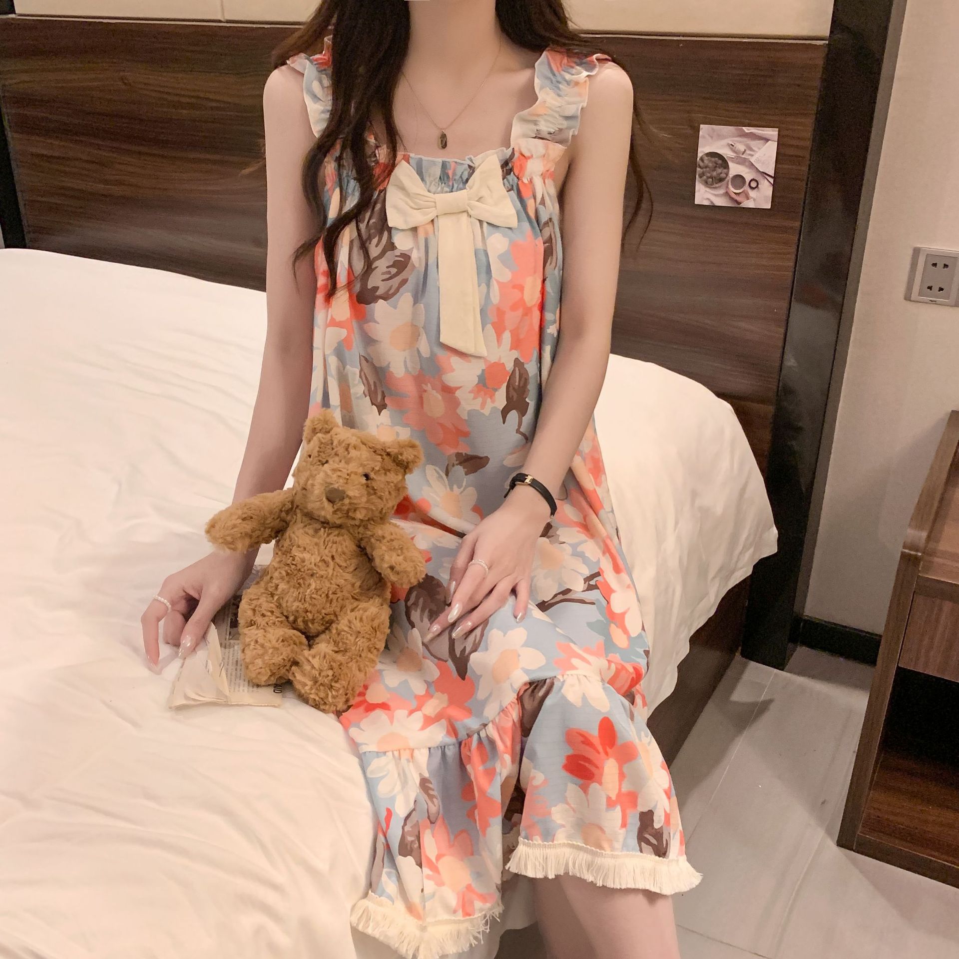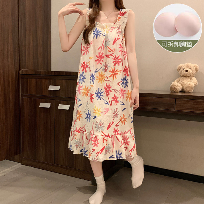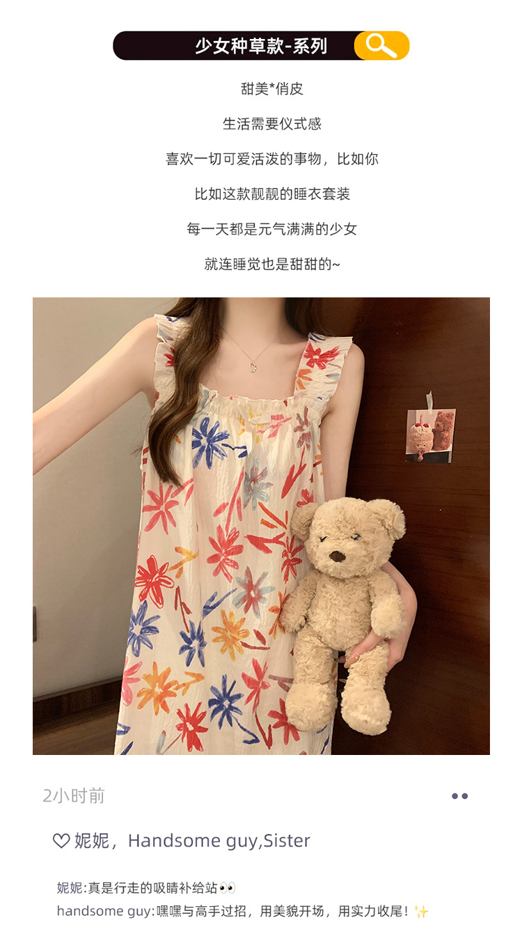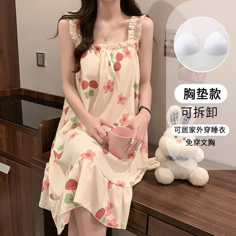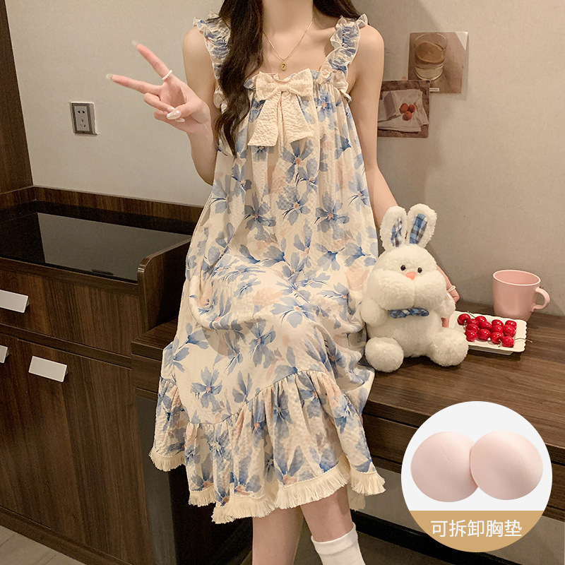 새로운 중국 목가적 인 스타일 슬링 파자마 여성 여름 새 스타일 가슴 패드 꽃 달콤한 느슨한 외부 착용 홈 옷스토어 가기