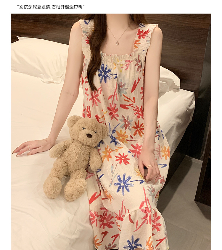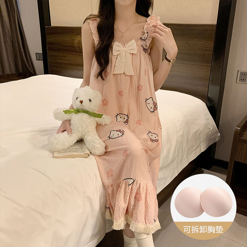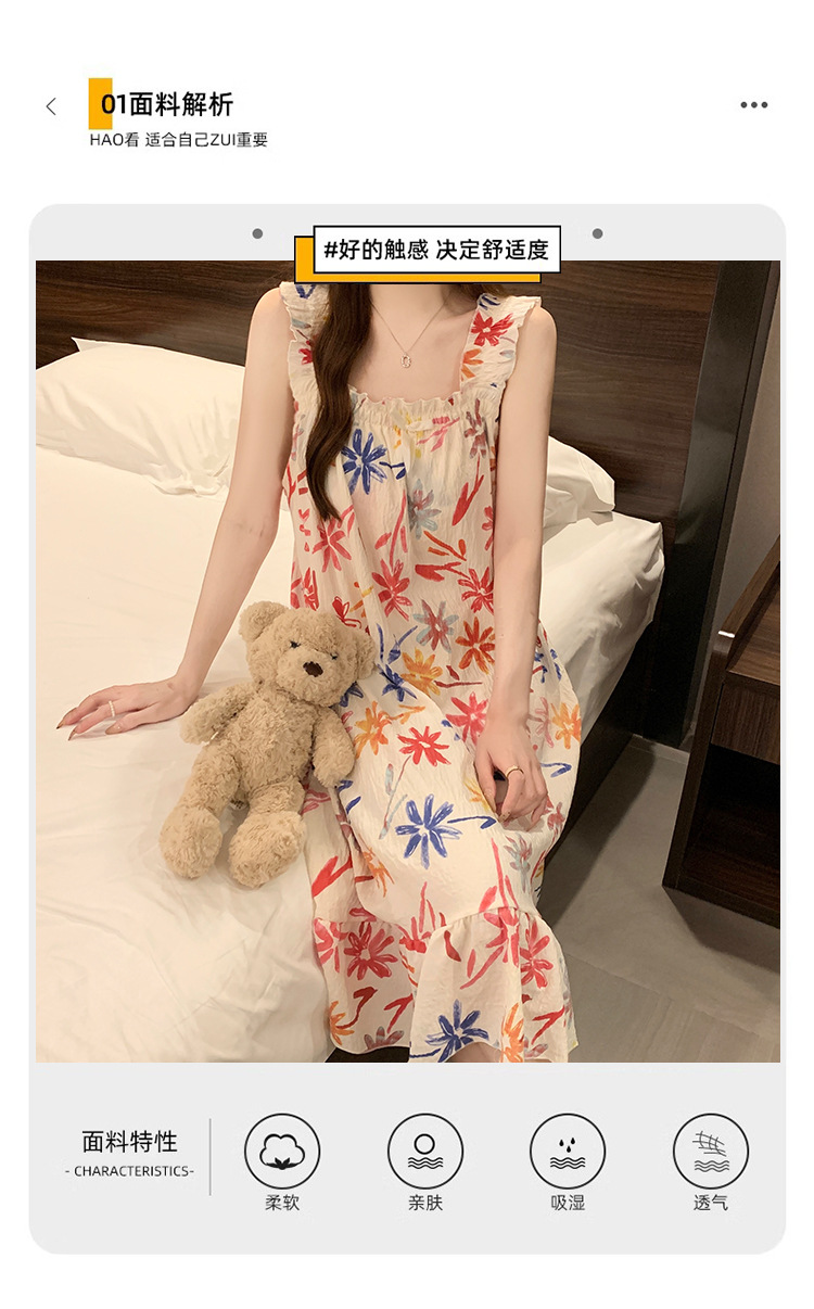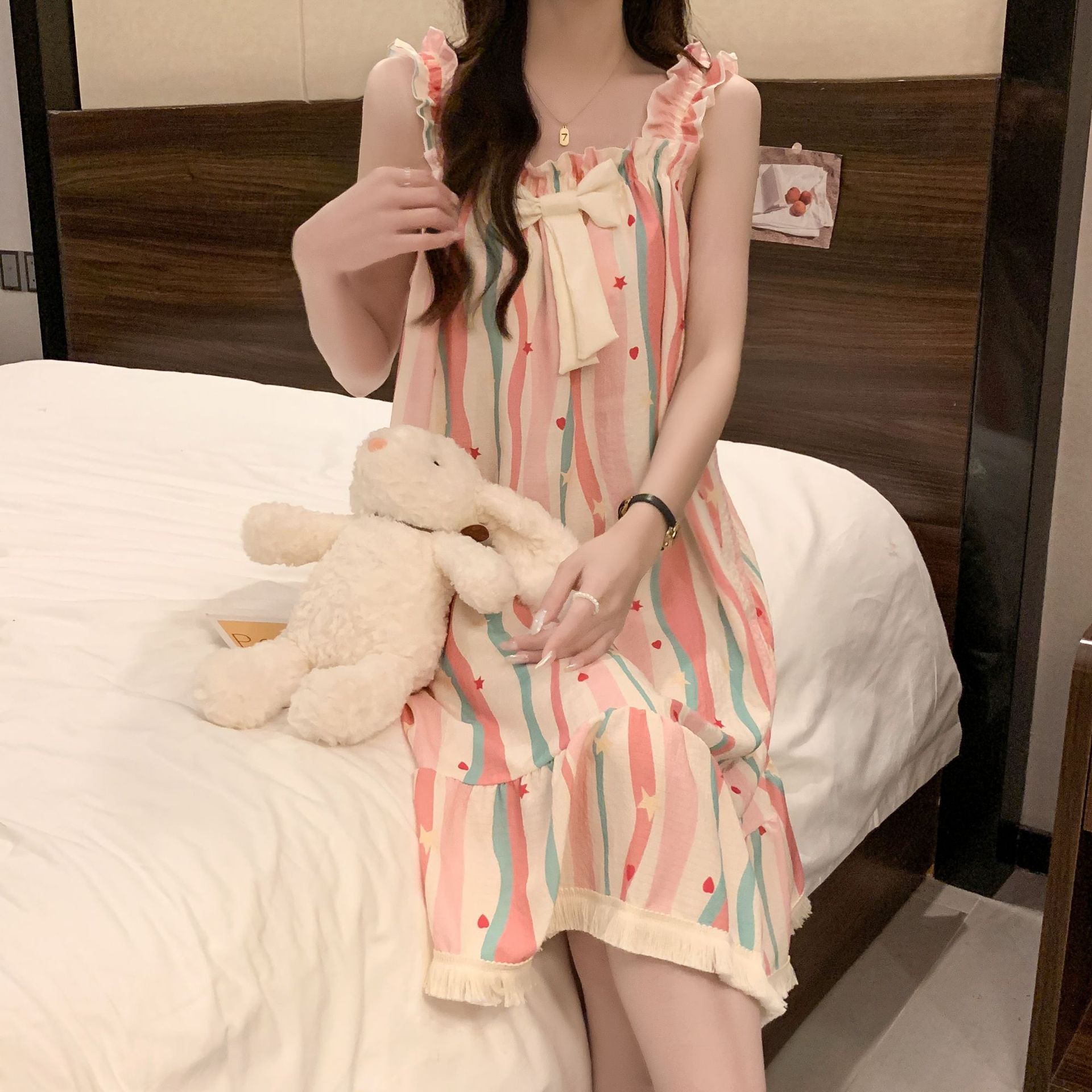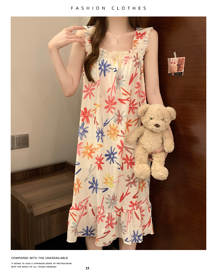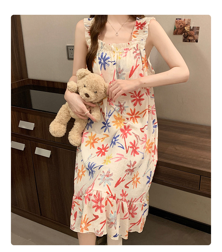 새로운 중국 목가적 인 스타일 슬링 파자마 여성 여름 새 스타일 가슴 패드 꽃 달콤한 느슨한 외부 착용 홈 옷스토어 가기